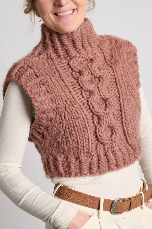 Denne lækre vest er et spændende strikkeprojekt, som du hurtigt kan blive færdig med. Vesten er strikket med en bred snoning, som går ned langs vestens forside. Derudover er der også ribstrik omkring vestens ærmer. Dette giver ærmegabene ekstra struktur og gør vesten mere interessant rent visuelt. Alva vesten er en unik strikkeopskrift, som er trendy og nemt at strikke. Snonignen er relativt enkel, og det kan være oplagt at øve dig i snoninger ved at strikke Alva vesten.