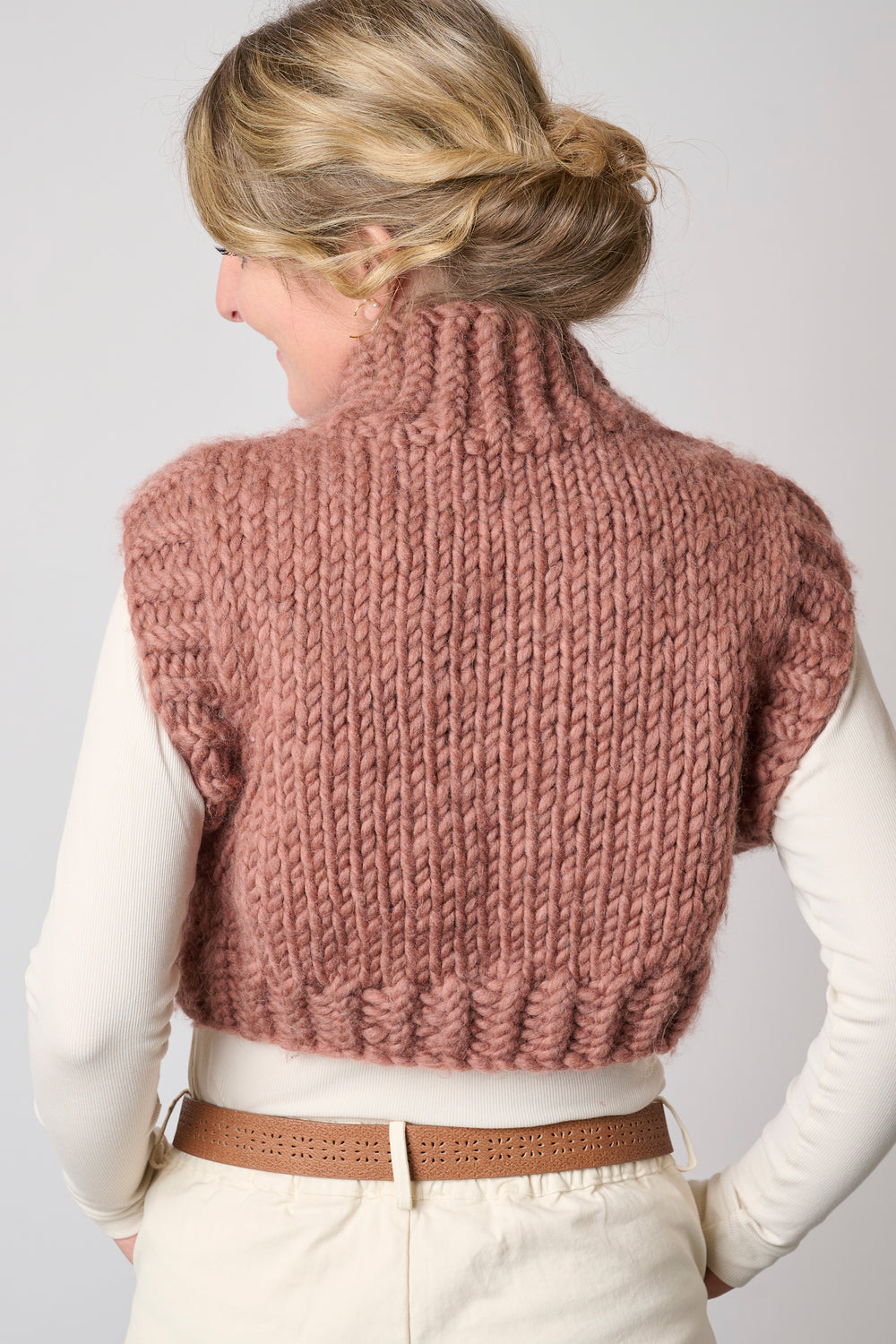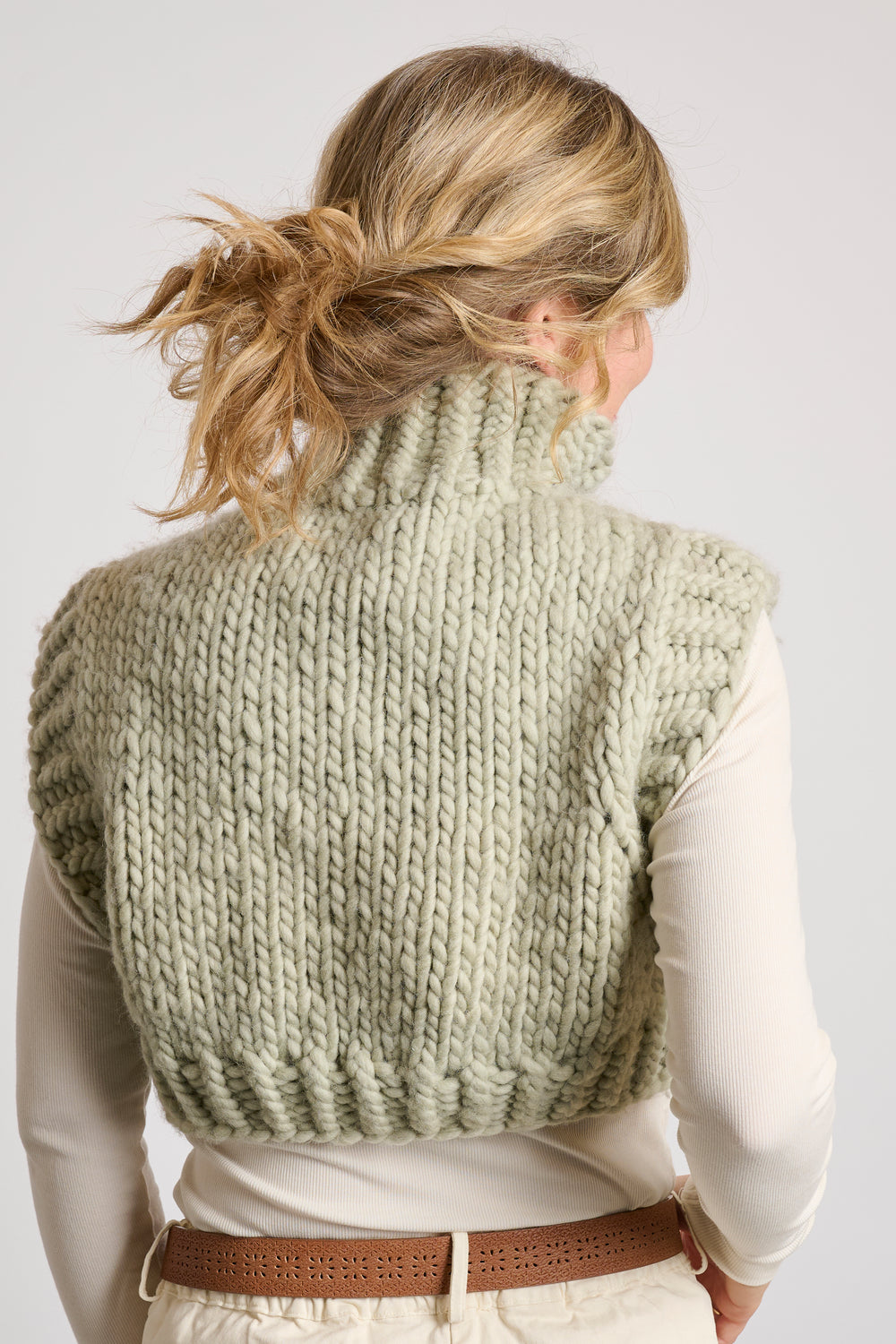 Alva vesten er strikket i Mayflower Molly, som er en garnkvalitet, der giver en anderledes strikkeoplevelse. Mayflower Molly har en løbelængde på 60 meter pr. 150 gram og består af 100 procent letspundet uld, så garnkvaliteten stadig er luftig og let.