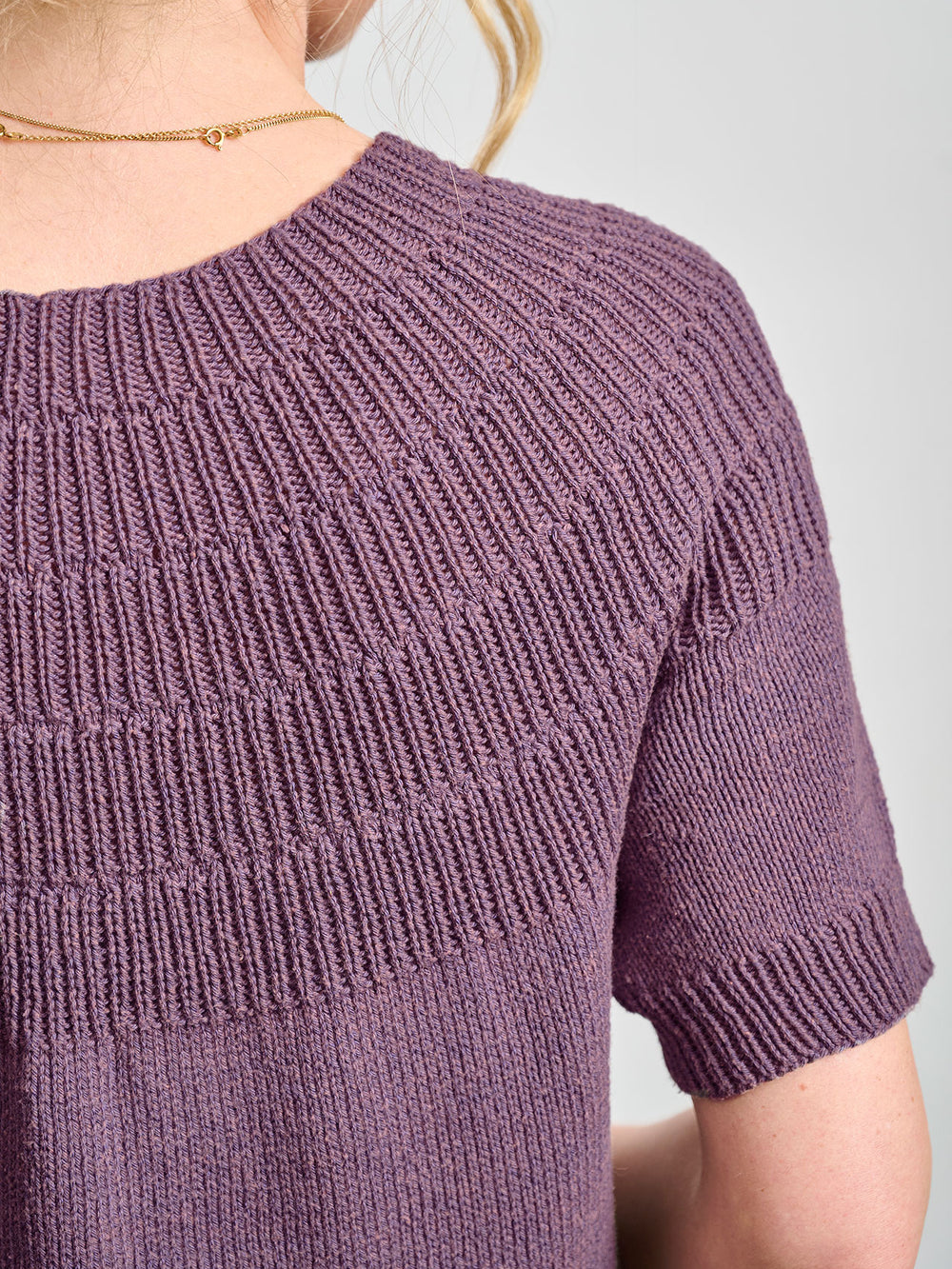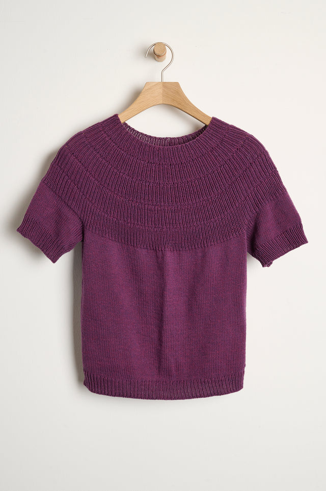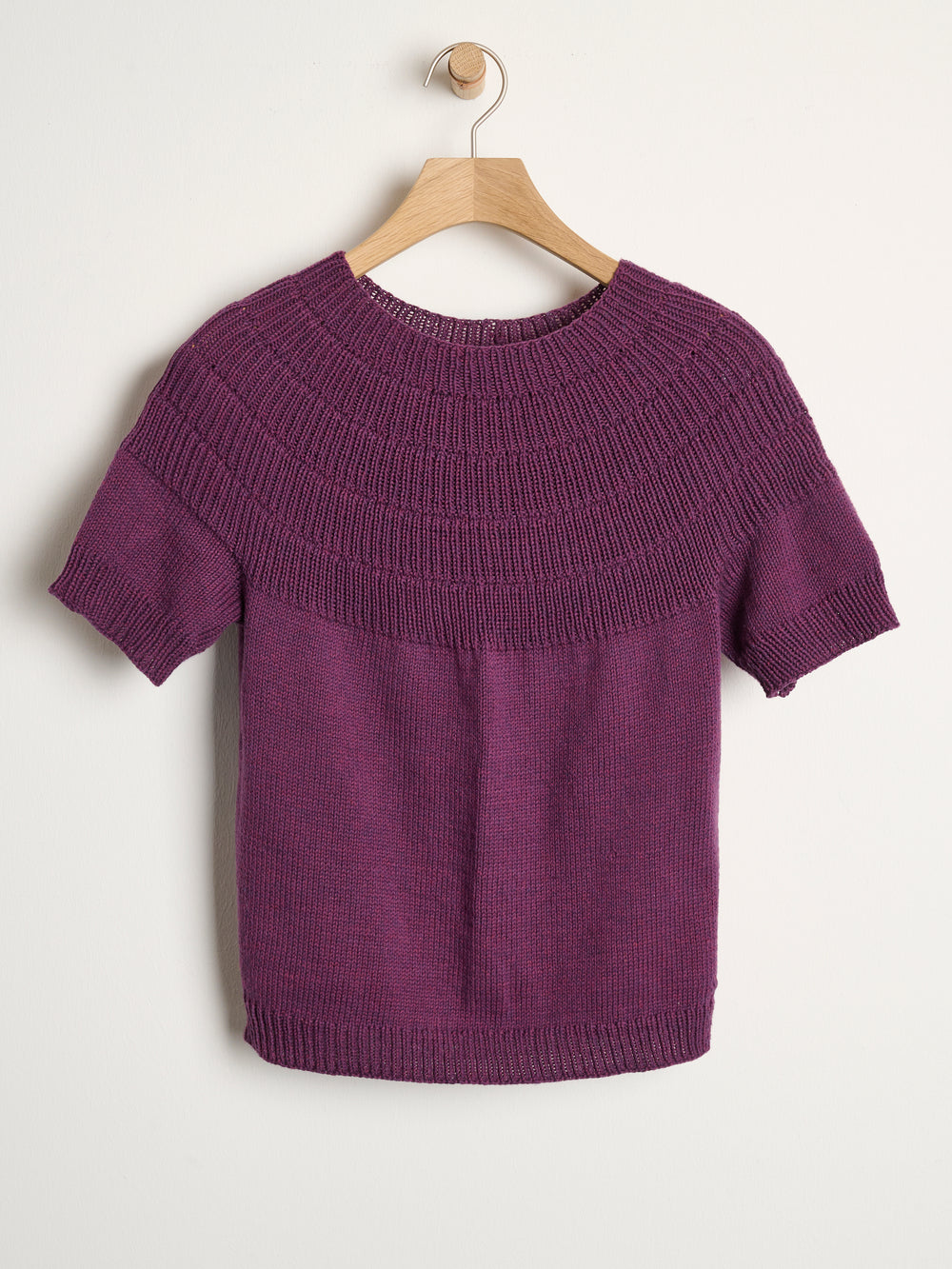 Anker tee fra PetiteKnit er strikket oppefra og ned med ribstruktur i bærestykket og glatstrik på kroppen.