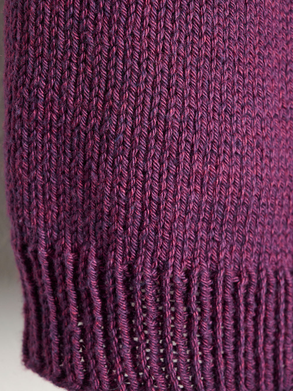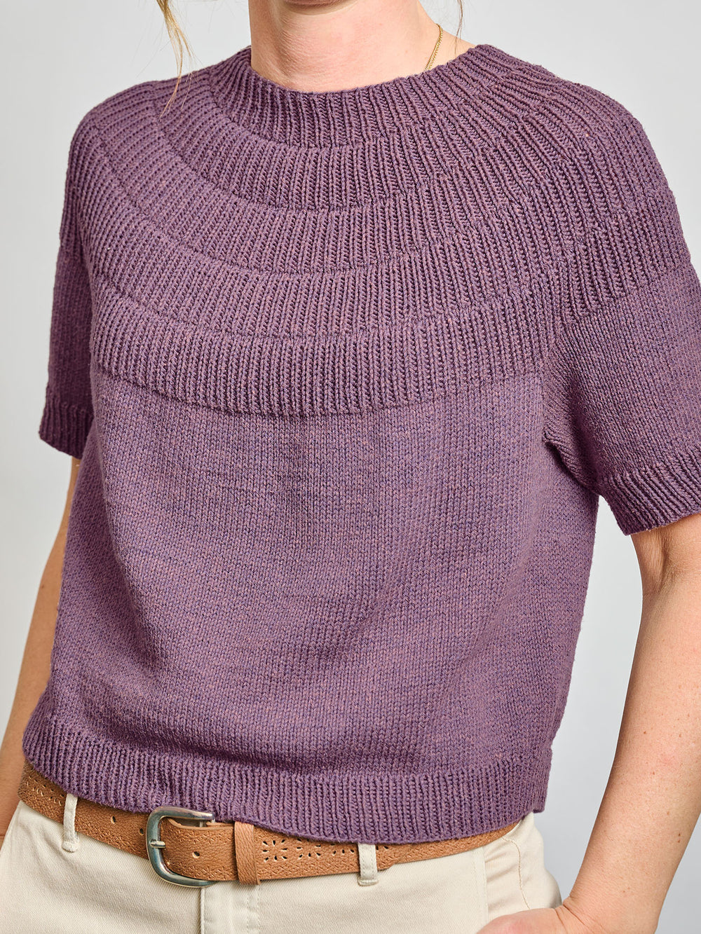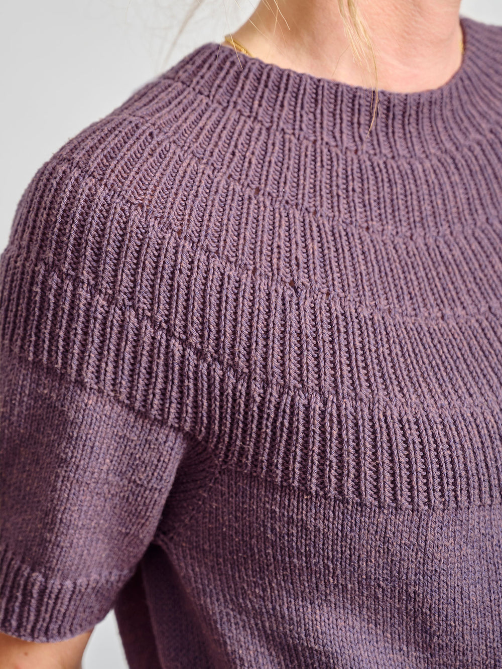 Anker tee fra PetiteKnit er strikket oppefra og ned med ribstruktur i bærestykket og glatstrik på kroppen.