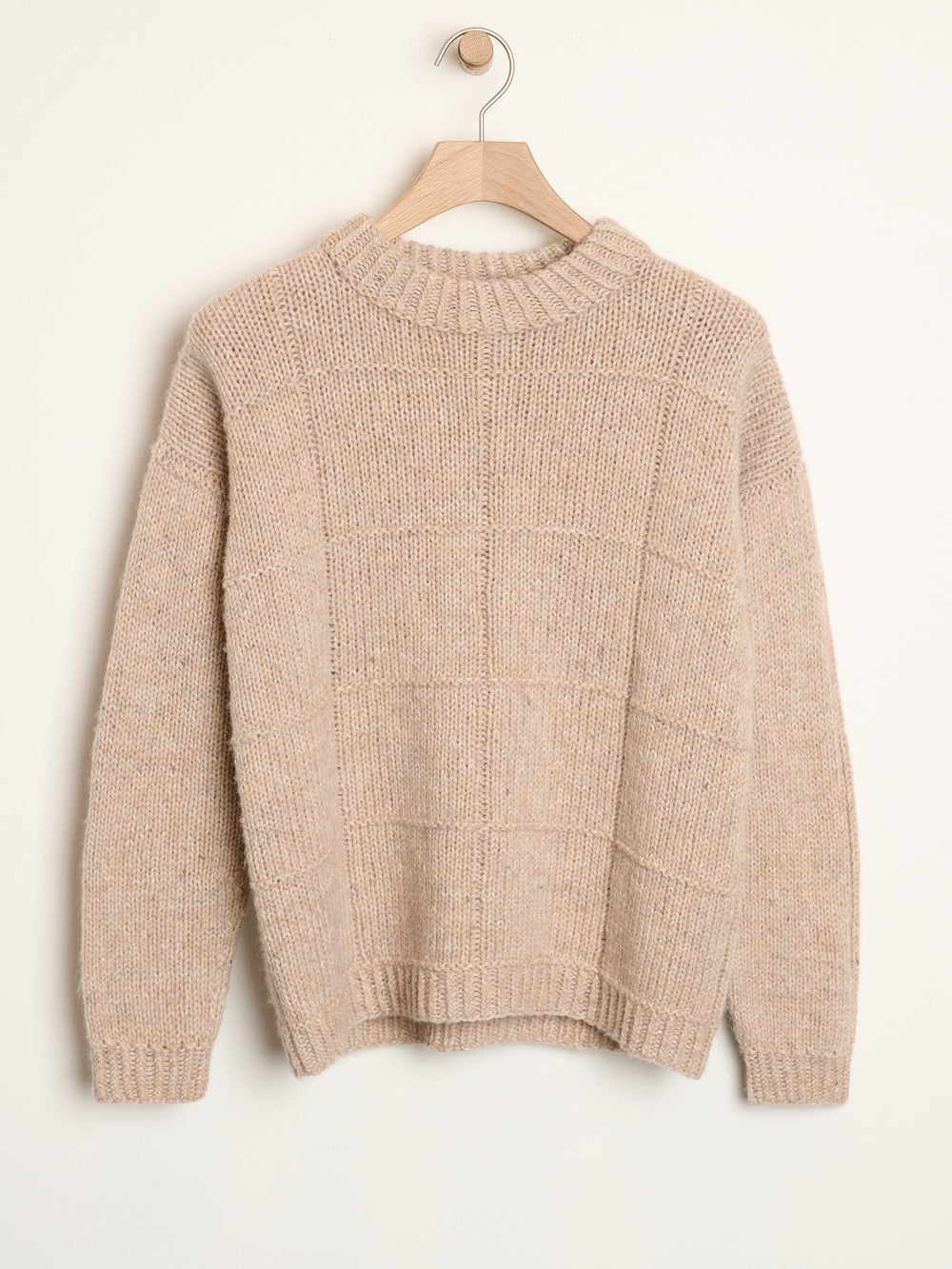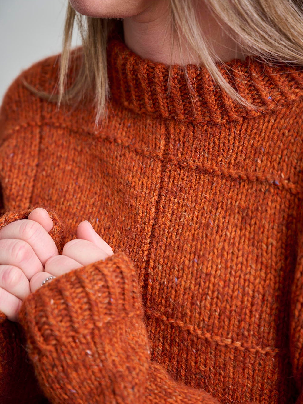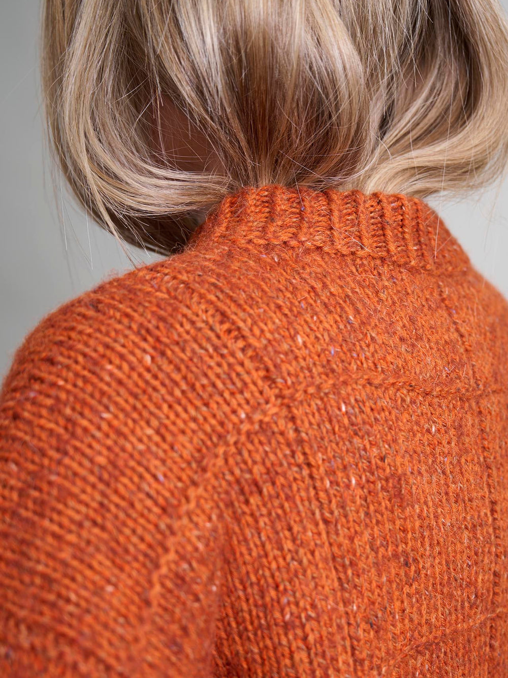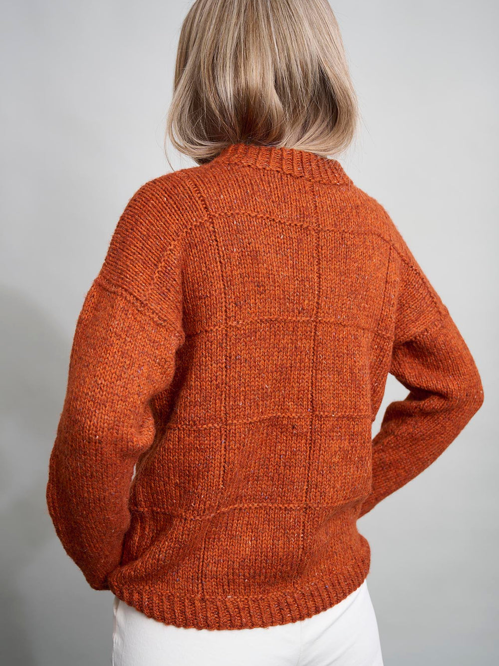 Damesweater med et simpelt, ternet strukturmønster, en lille halskant og drejet rib som særlig detalje. Trøjens ryg og forstykke strikkes nedefra og op, mens ærmerne strikkes oppefra og ned.