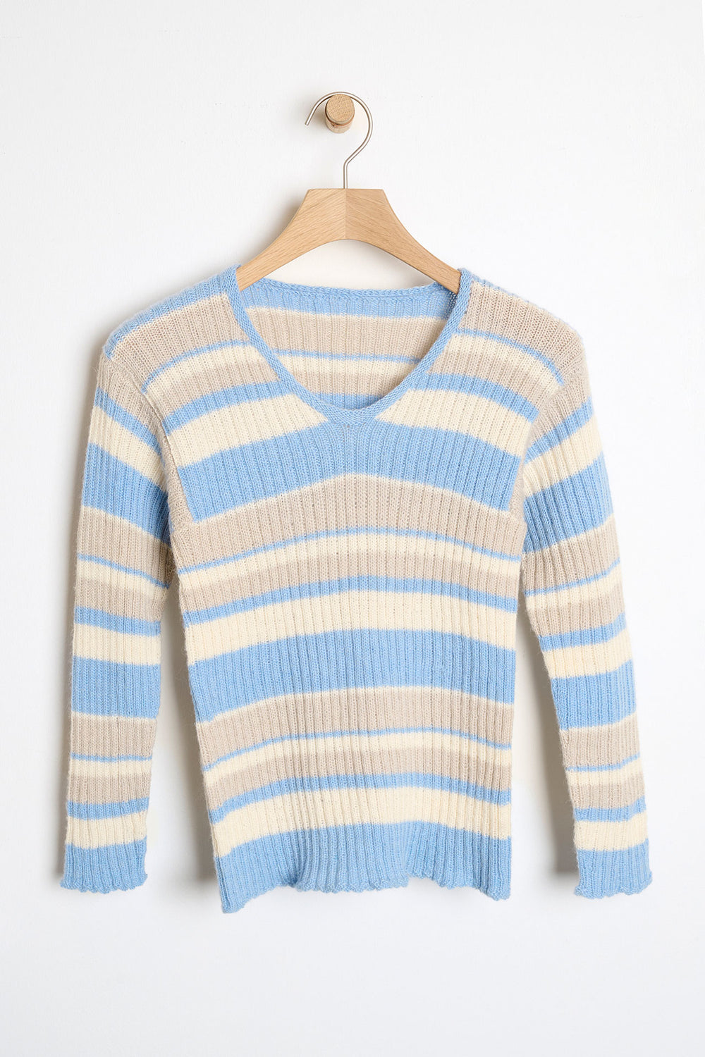 Blusen er ribstrikket, hvilket giver flotte, lodrette strukturstriber. Samtidig hjælper ribmønsteret også med at forme blusen, så den følger taljen på en klædelig måde. Disse detaljer er kombineret med det fine stribemønster i havblå, hvid og sandfarvet med striber i forskellig bredde.