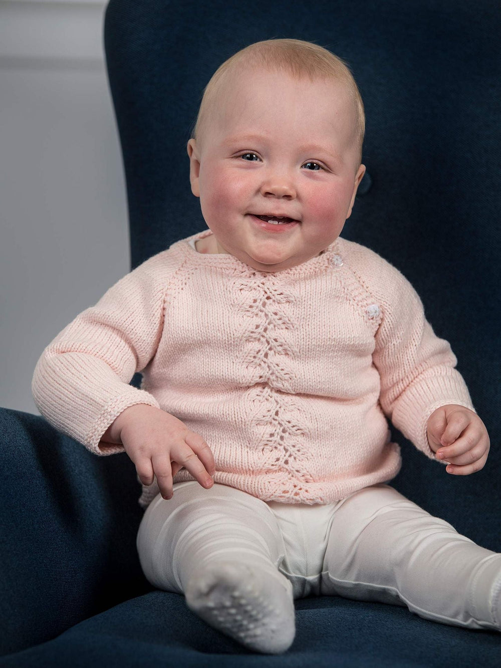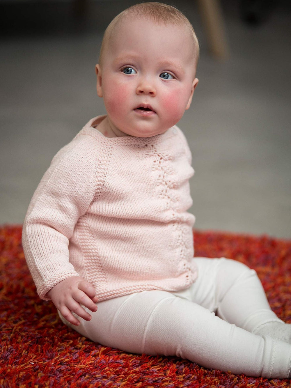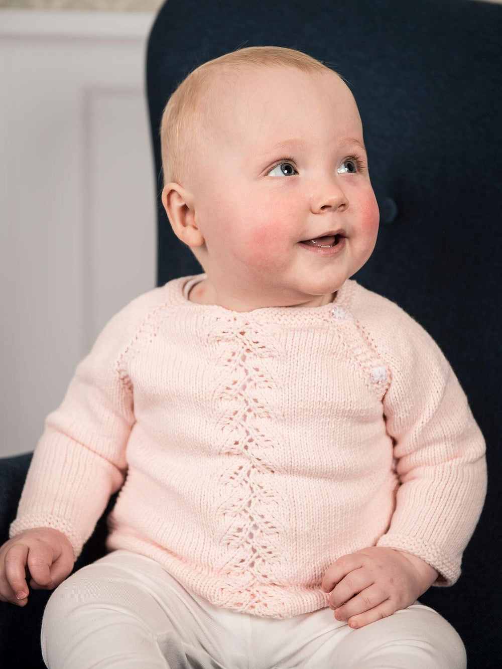 Denne fine pigebluse er ufatteligt sød med sit fine hulmønster, der ligner bregnegrene. Mønsteret dækker trøjens front, mens trøjens kanter afsluttes med retstrik.