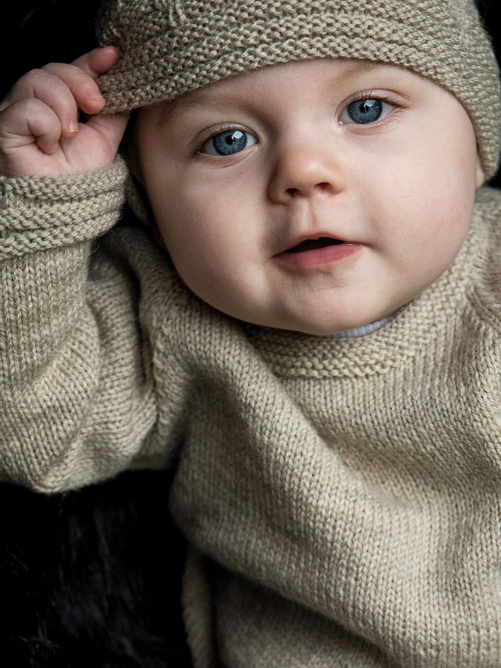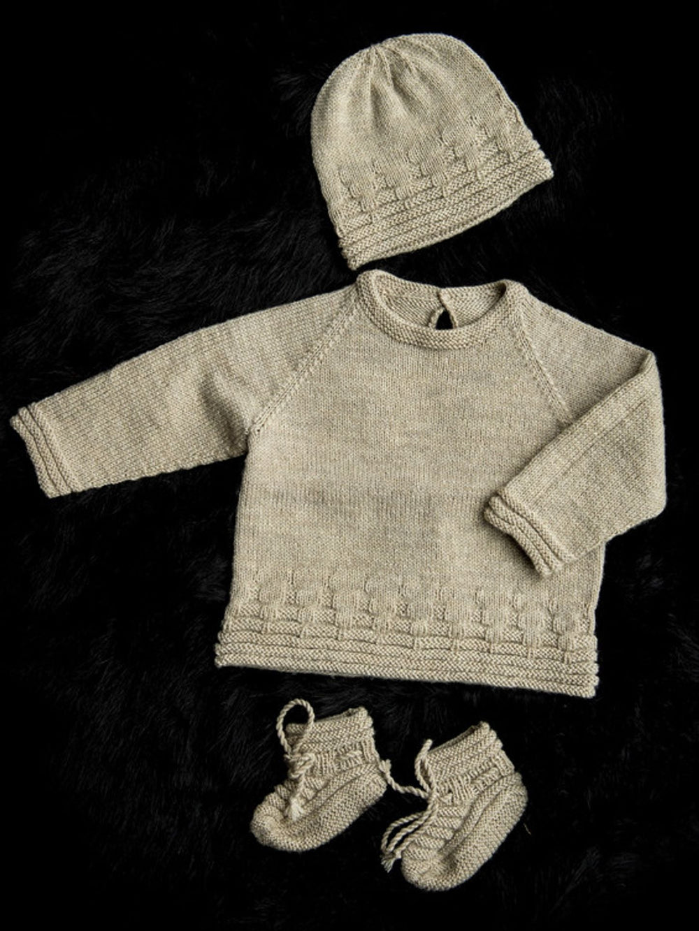 Fint babysæt med både trøje, sokker/sko og hue. Sættet er lavet med rillestrik, glatstrik og et fint strukturmønster og passer derfor godt til både drenge og piger.