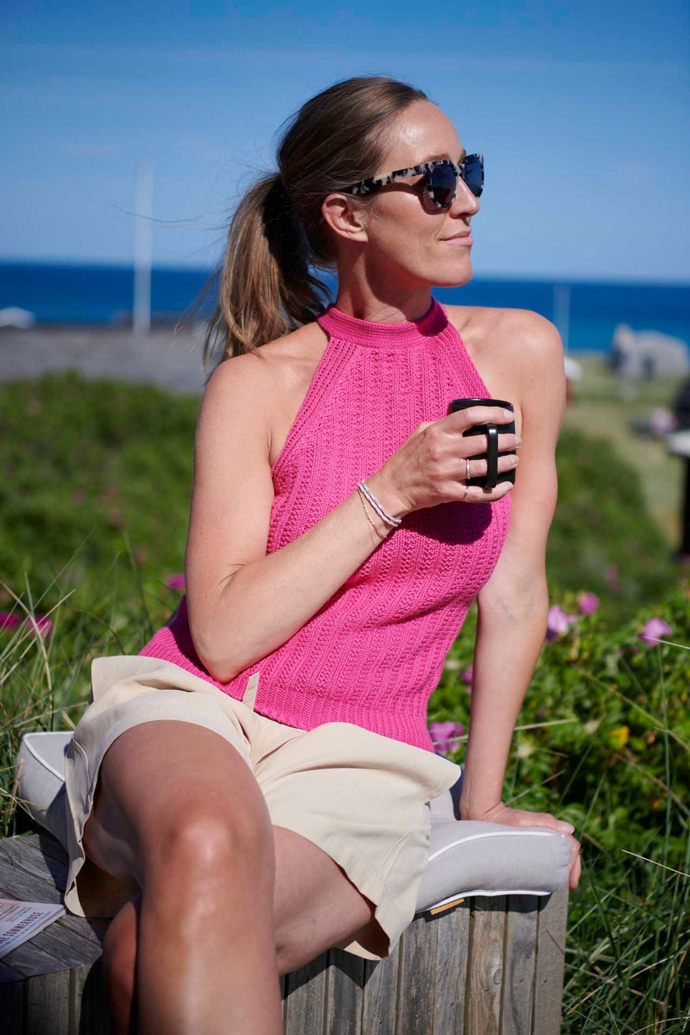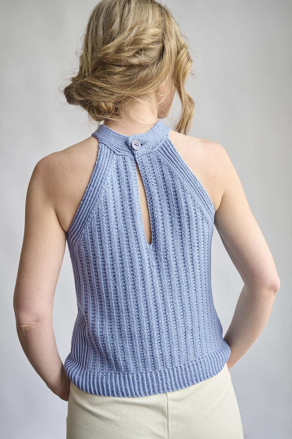 Designet med halterneck til bare skuldre giver en let top med behagelig pasform; ideel til de varme sommerdage eller fx under en let cardigan. Toppen er strikket oppefra og ned og skiller sig ud med sine mange smukke detaljer.