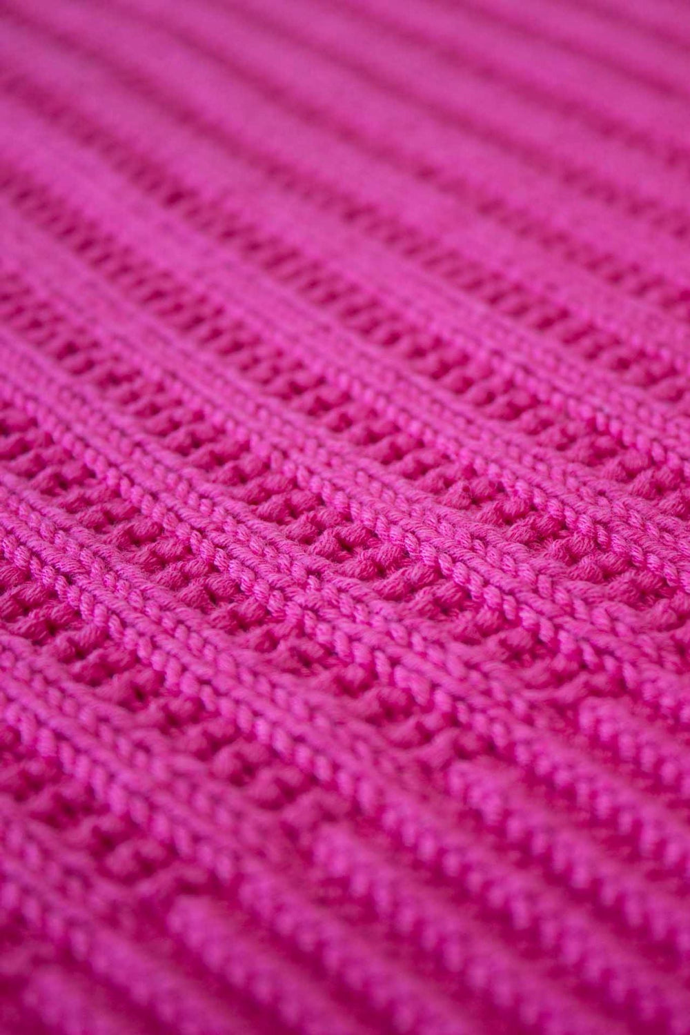 Der strikkes i to ribmønstre. Det primære mønster består af en flot brudt rib, suppleret af en elegant kant i drejet rib. Den går fra halskanten hele vejen ned langs for- og bagstykke, samles under armene og ender i ribkanten forneden på toppen. Den glatstrikkede halskant er dobbelt og har en enkel knaplukning i nakken.