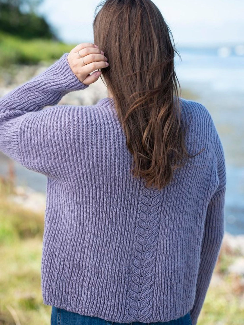Sweateren er strikket i patent, hvilket giver designet en let elastisk egenskab, som gør sweateren yderst behagelig at have på. Samtidig har designet en række unikke detaljer, som skaber den perfekte kombination af både at være klassisk og feminin. Den yderst elegante bladsnoning på front og ryg er med til at fremhæve sweaterens feminine udtryk, mens det lille ombuk i halsen skaber et klassisk look. Ærmerne er påsatte og holder næsten samme omkreds hele vejen, hvor de i stedet for at slutte med en traditonel ribkant holder mønsteret helt til slut.