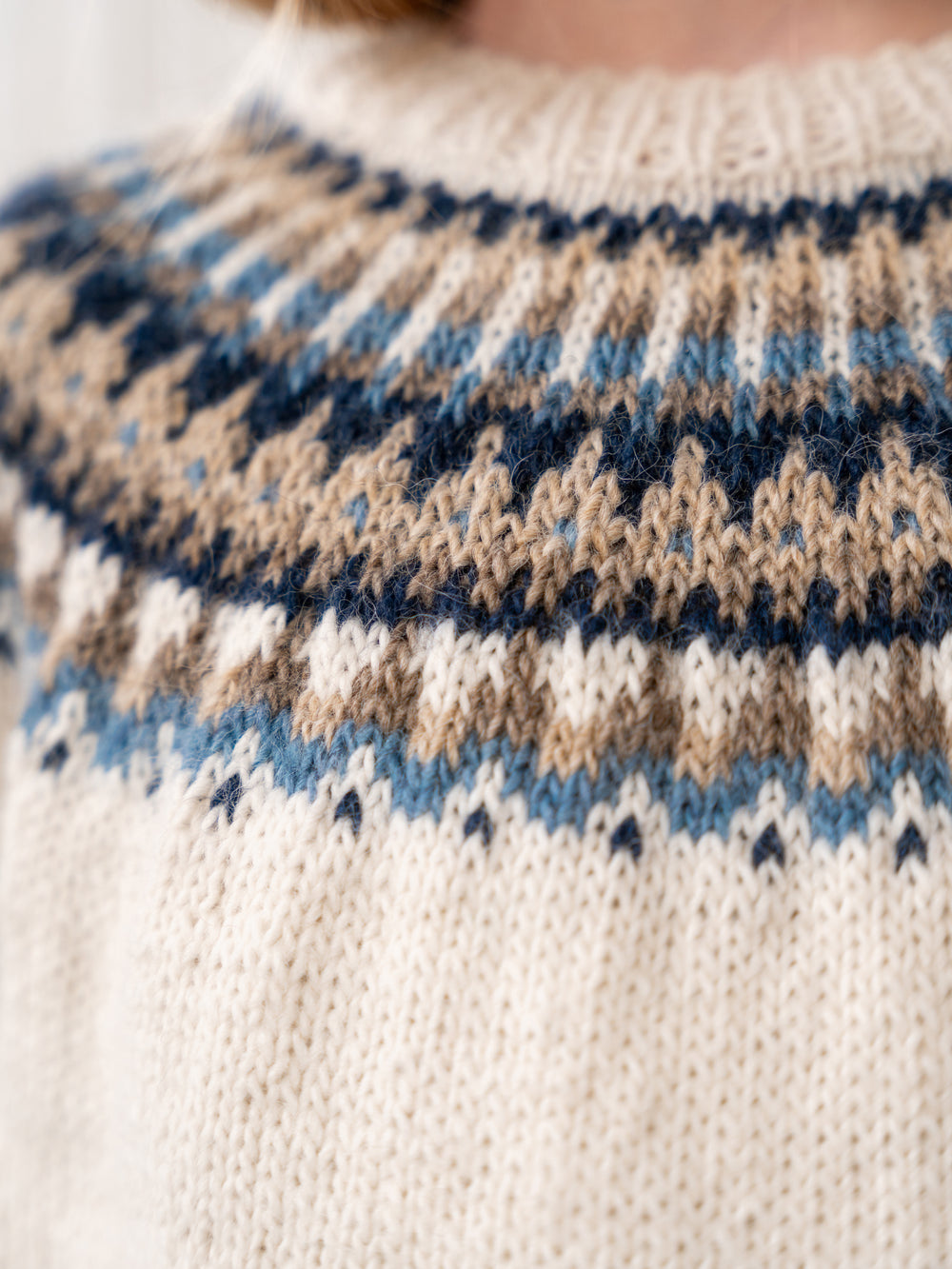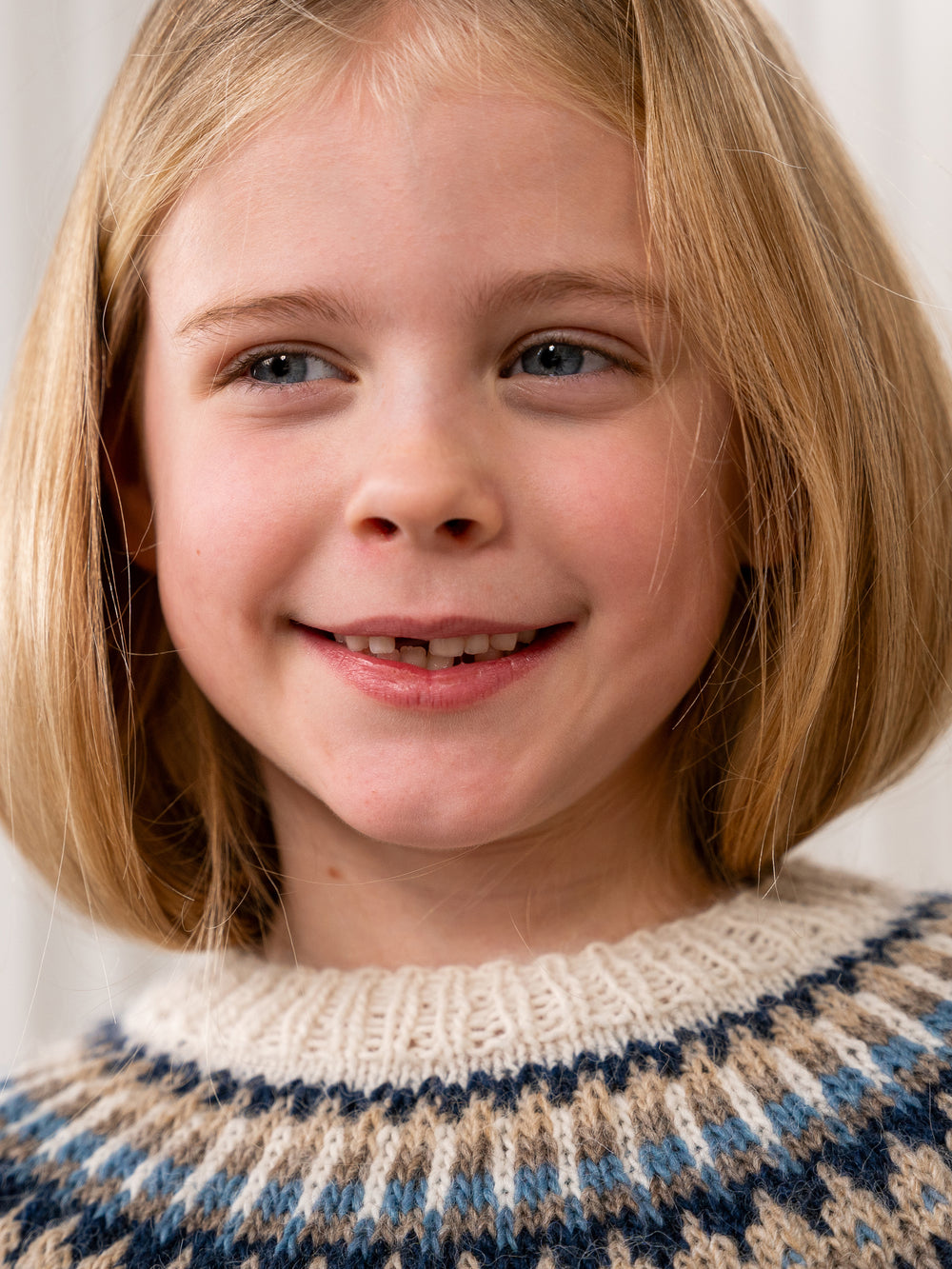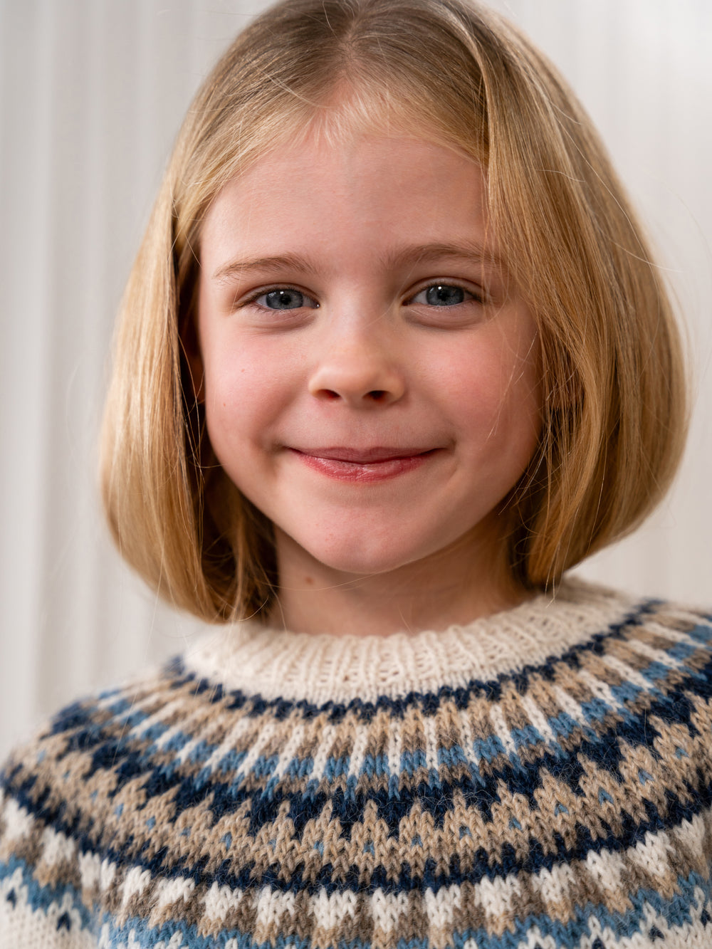 Celeste sweater junior fra PetiteKnit er strikket oppefra og ned og har et rundt bærestykke, som strikkes i mønster med flere farver. Sweateren strikkes i glatstrik og med kanter i rib.