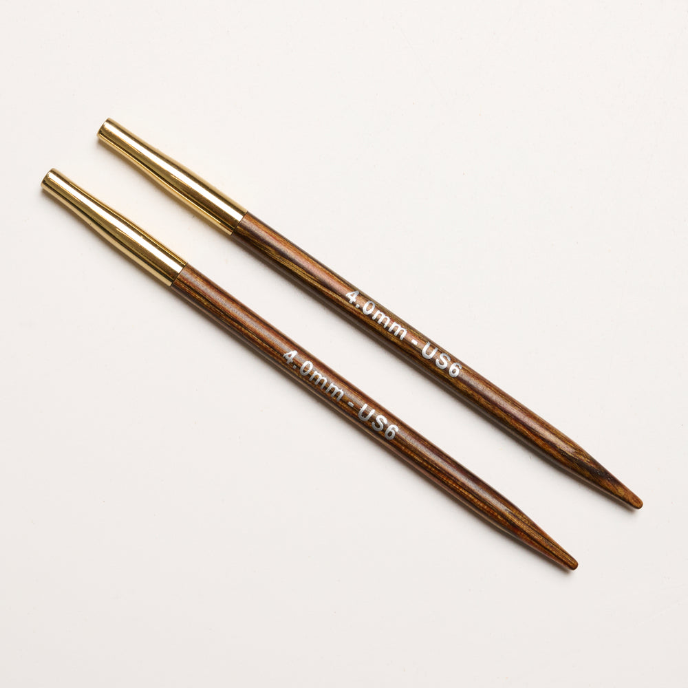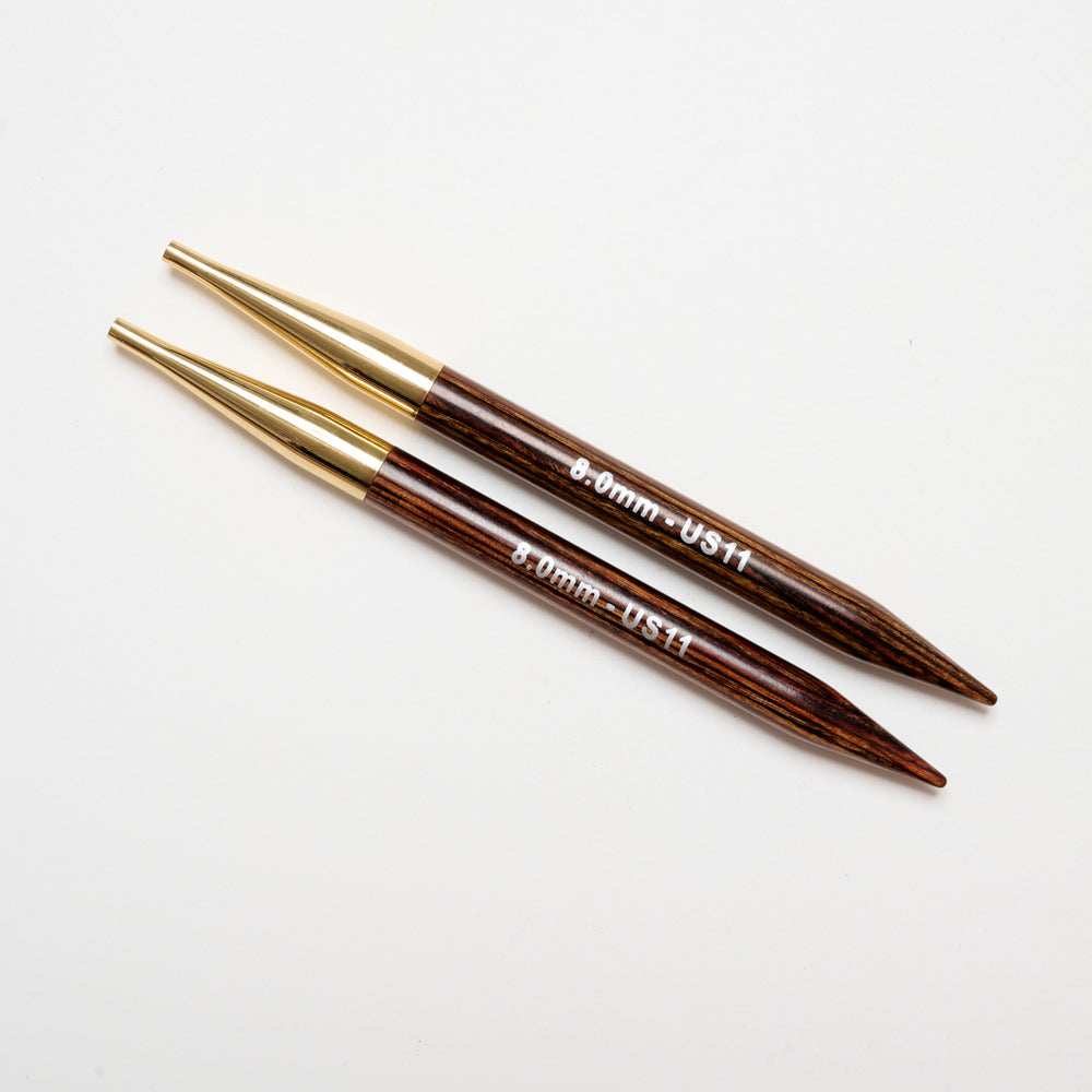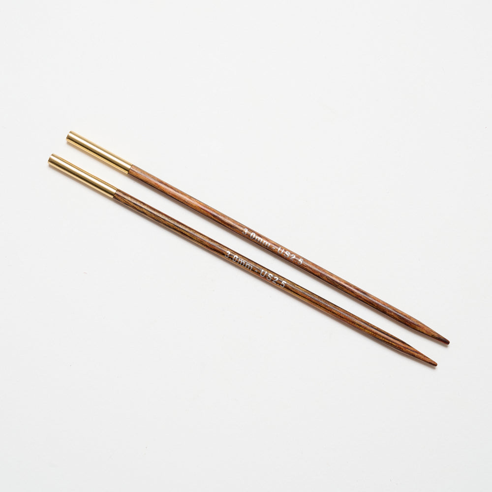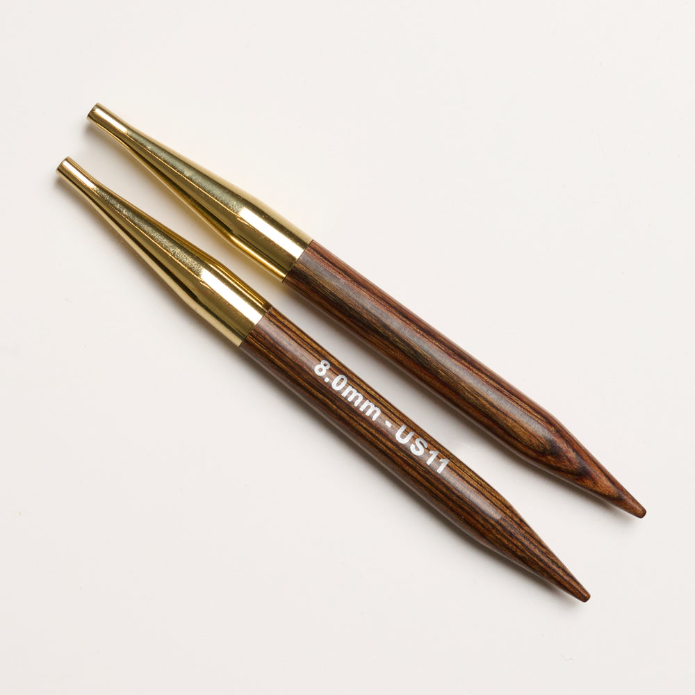 Smukke udskiftelige pinde i lakeret birketræ, som fås i længder på enten 10 eller 13 cm samt i 9 forskellige størrelser fra 3-8 mm med nikkelfri gevind. Pindene er komfortable at have i hånden og skønne at strikke med. De er en del af Amber-serien, som fx også indeholder et helt sæt med udskiftelige rundpinde, wirer, stoppere mv.
