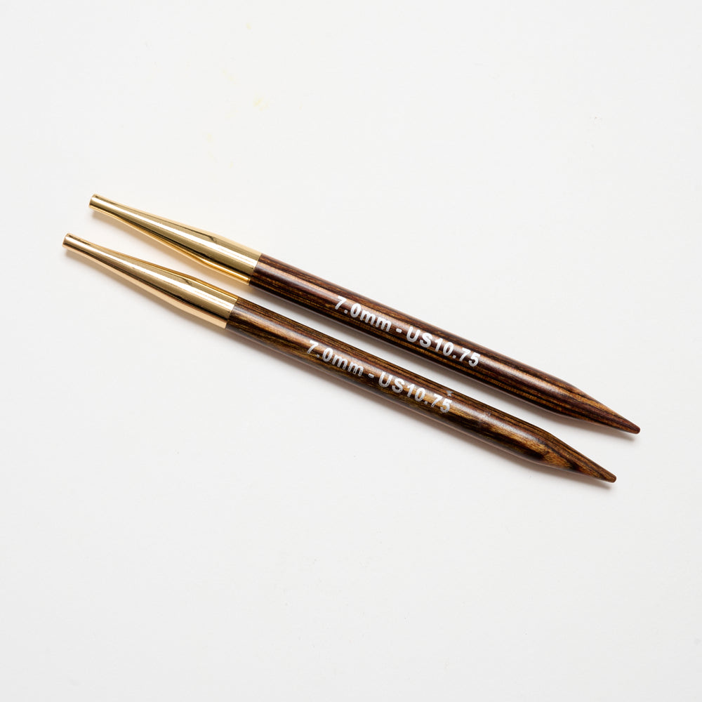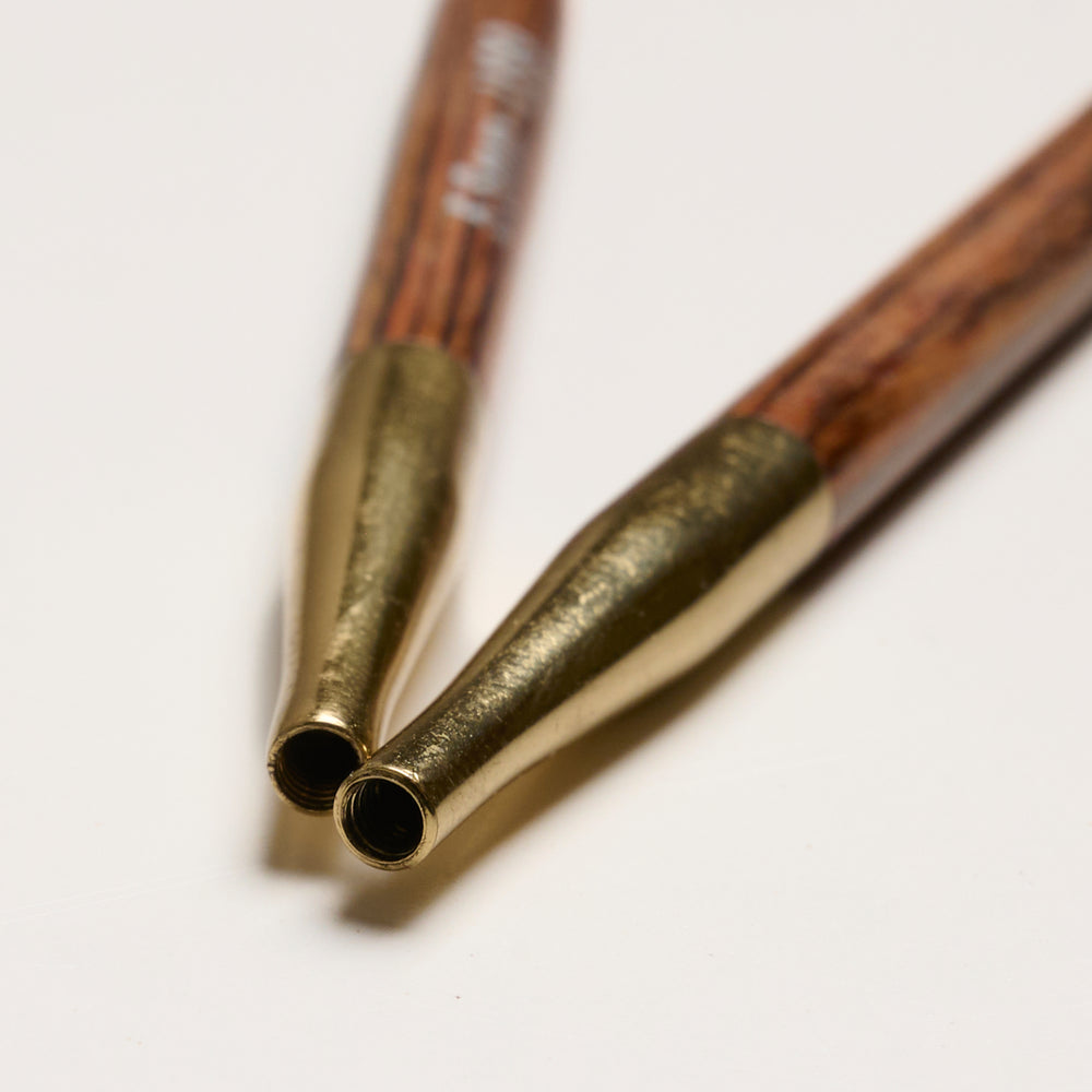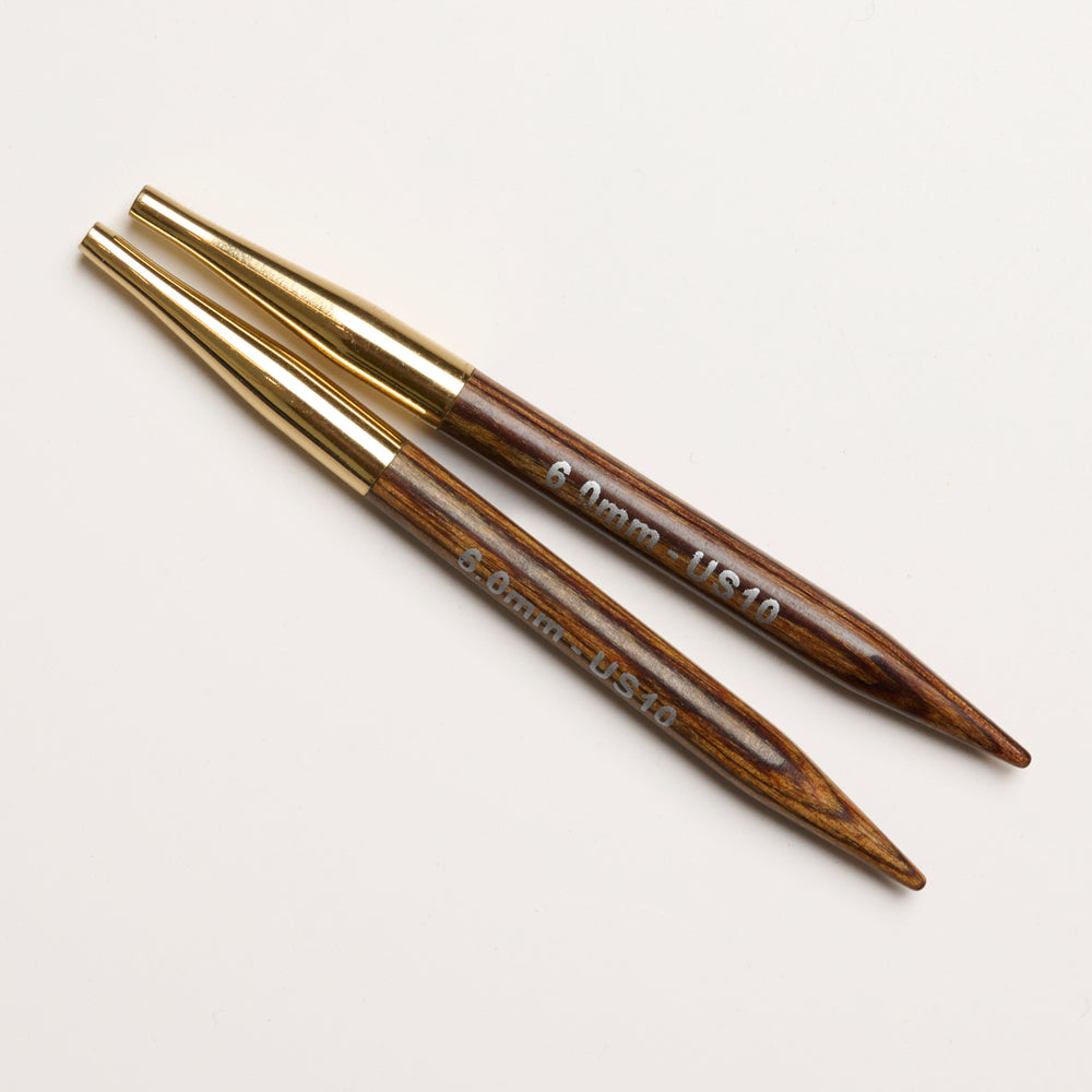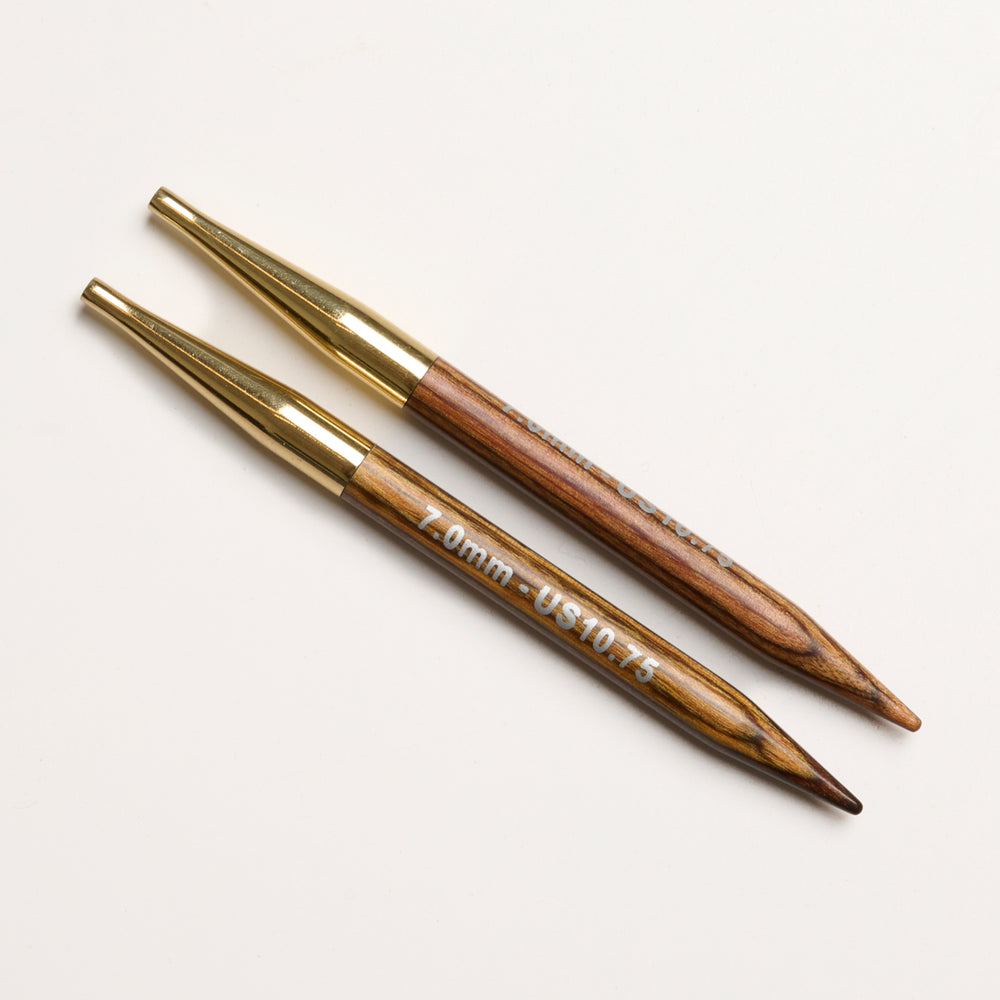 Smukke udskiftelige pinde i lakeret birketræ, som fås i længder på enten 10 eller 13 cm samt i 9 forskellige størrelser fra 3-8 mm med nikkelfri gevind. Pindene er komfortable at have i hånden og skønne at strikke med. De er en del af Amber-serien, som fx også indeholder et helt sæt med udskiftelige rundpinde, wirer, stoppere mv.