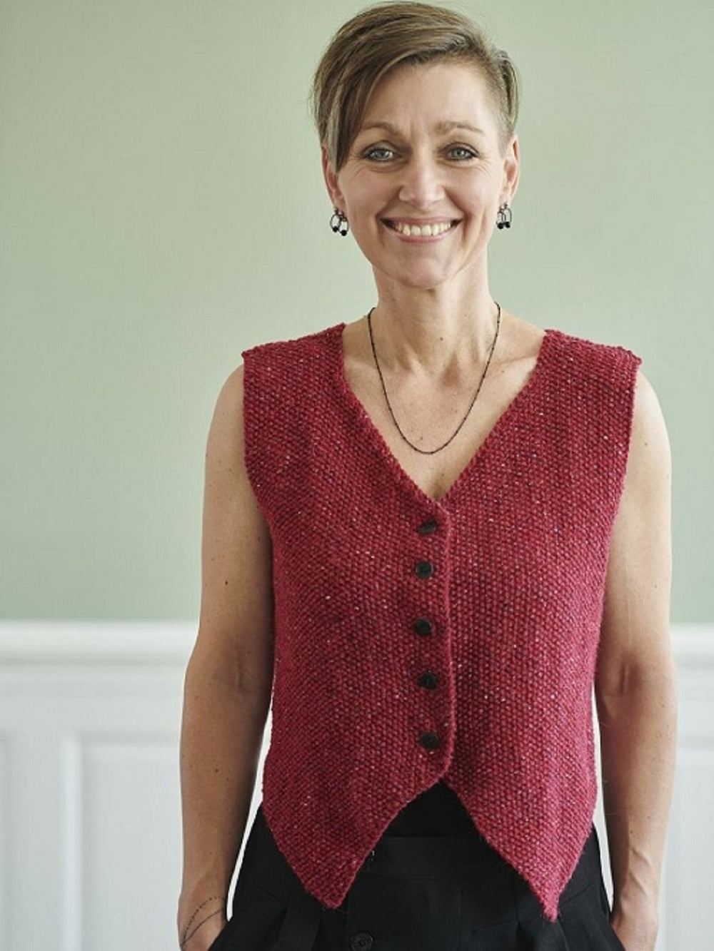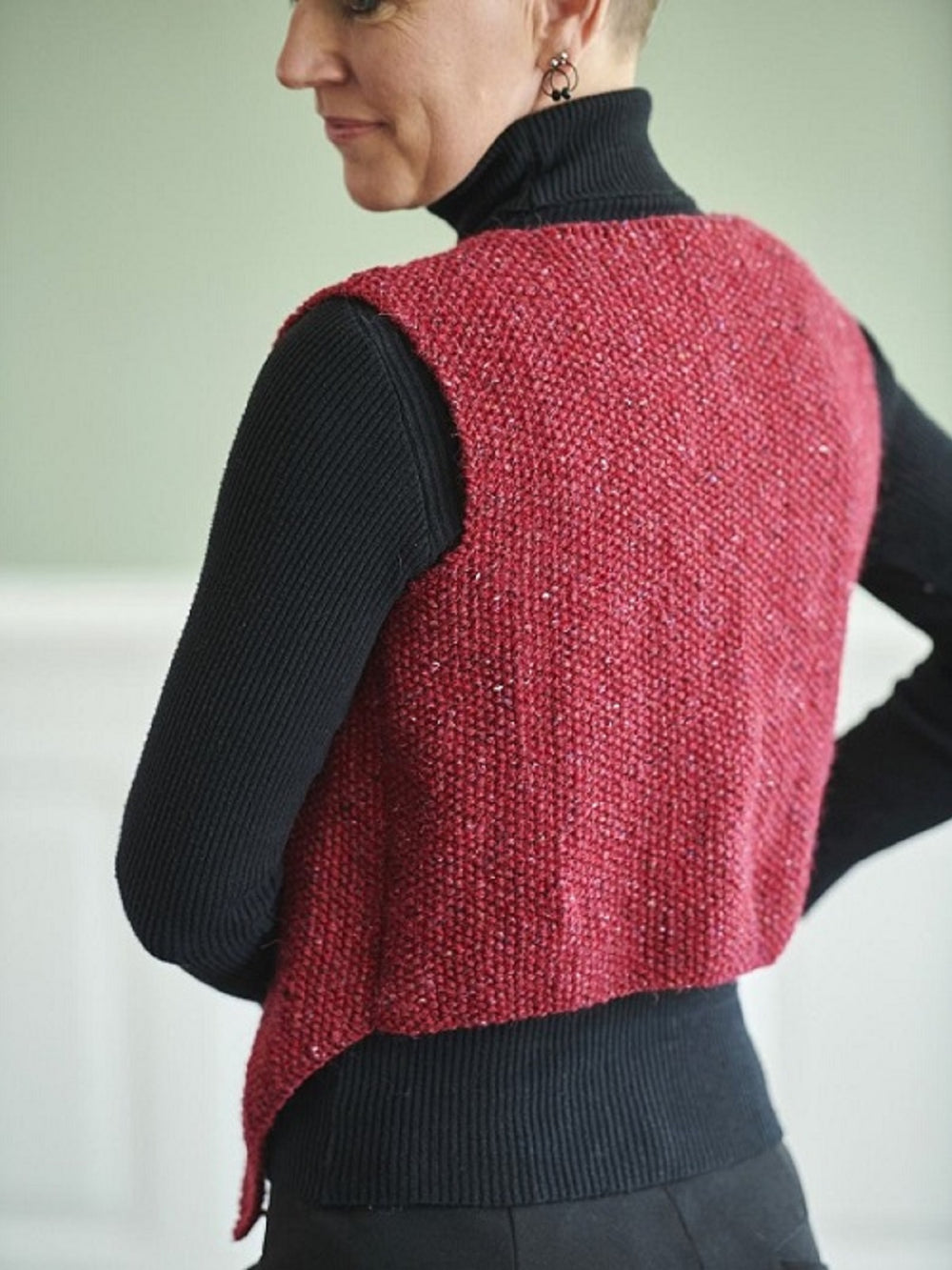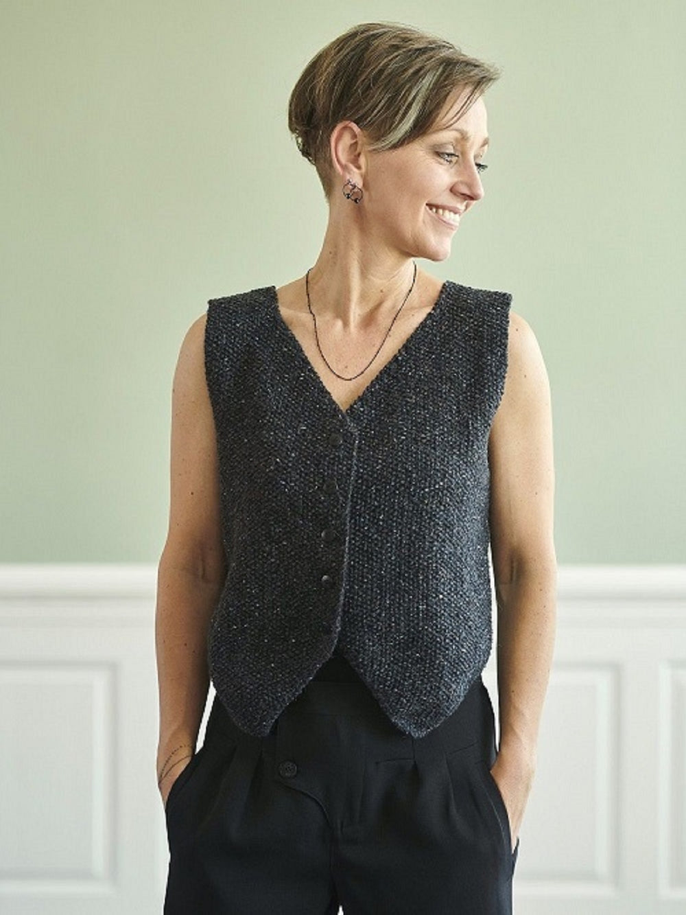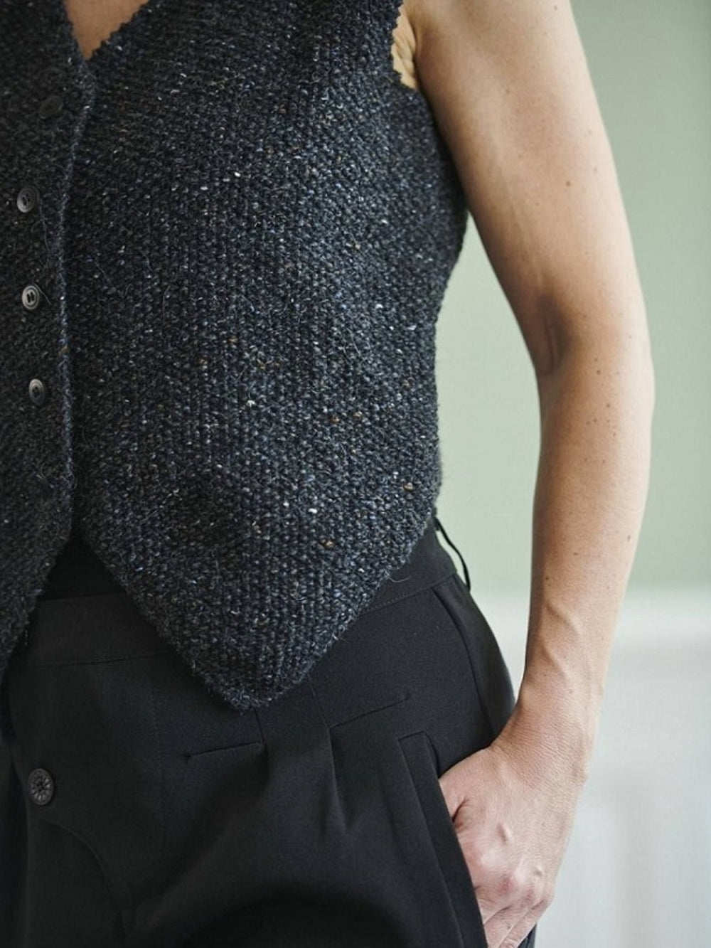 At have en habitvest i sin garderobe, er en del af det internationale fashion billede i de store modehuse. Med en strikket habitvest kan du nemt style dig til hverdag og fest, og gøre det strikkede håndværk, til en del af det klassiske fashion look. Denne vest er strikket nedefra og op og strikket i 3 dele. 2 forstykker og ryg, som bliver strikket hver for sig. Begge forstykket er spidse nederst, så de får den rigtige facon som en habitvest. Vesten er strikket i perlestrik i en tweedgarn, som giver vesten en rigtig flot struktur. Vesten kan både bæres alene, eller som en del af dit lag på lag outfit under din habitjakke.
