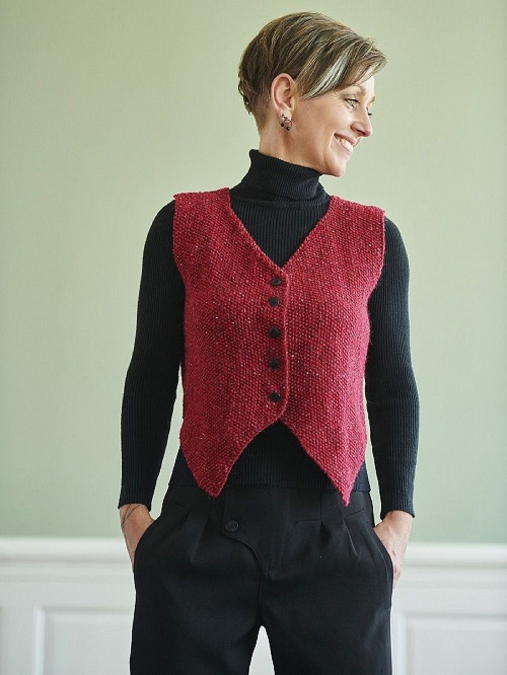 At have en habitvest i sin garderobe, er en del af det internationale fashion billede i de store modehuse. Med en strikket habitvest kan du nemt style dig til hverdag og fest, og gøre det strikkede håndværk, til en del af det klassiske fashion look. Denne vest er strikket nedefra og op og strikket i 3 dele. 2 forstykker og ryg, som bliver strikket hver for sig. Begge forstykket er spidse nederst, så de får den rigtige facon som en habitvest. Vesten er strikket i perlestrik i en tweedgarn, som giver vesten en rigtig flot struktur. Vesten kan både bæres alene, eller som en del af dit lag på lag outfit under din habitjakke.