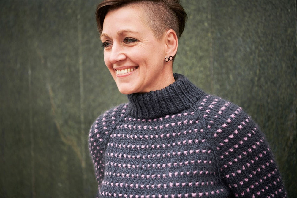 Lækker og voluminøs sweater, som strikkes topdown med raglanudtagninger og vævestrik. Sweaterens hals strikkes i dobbelt højde, hvilket giver sweateren et flot udtryk.