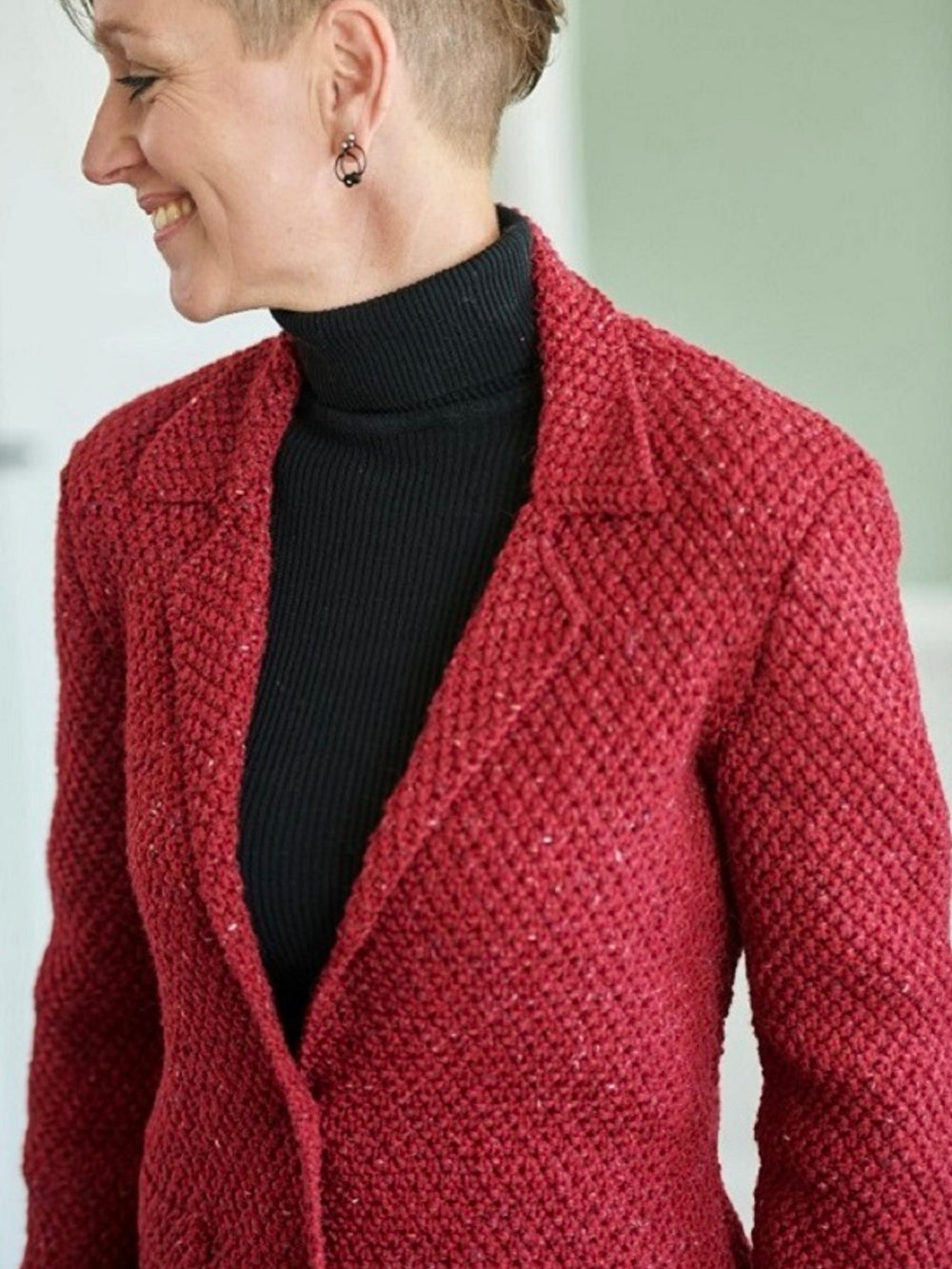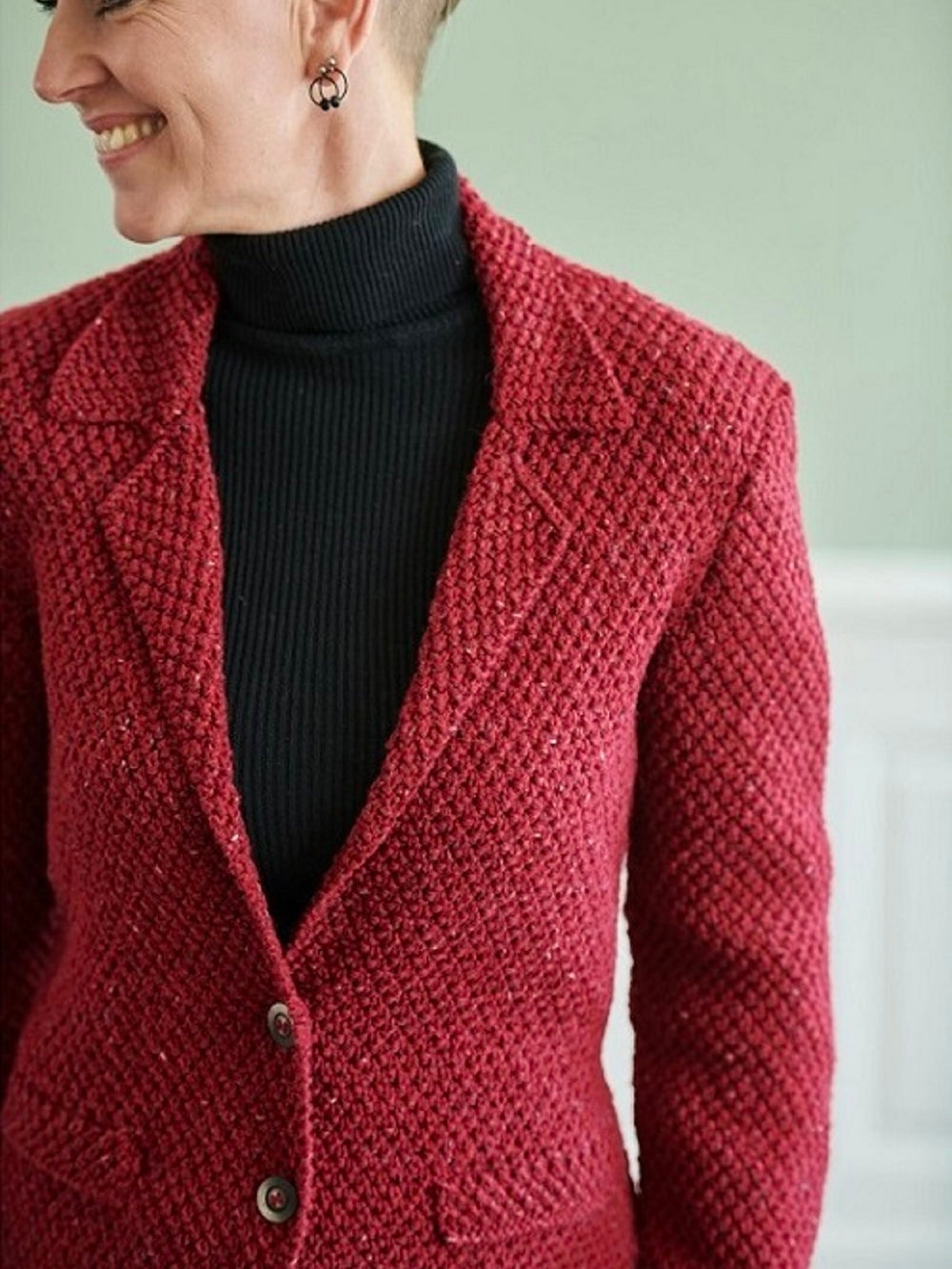 Jakken er strikket i dobbelt perlestrik på p 4,5 mm, som egentlig er lidt for lille til garnvalget, men det skaber det helt korrekte look, så jakken ligner stof i stedet for strik. Habitjakken er strikket i forstykker, ryg og ærmer hver for sig. Når alle delene er strikket hver for sig, sys den sammen fra vrangsiden, hvorefter der er strikket krave og finesser på til sidst. Modellen er strikket en smule 'for lille', fordi den giver sig lidt i brug og i vask og skal formes i fugtig tilstand. Derfor anbefales det, at den håndvaskes først inden brug. Når modellen skal tørre, skal den ligge i facon, og formes efter brugeren.