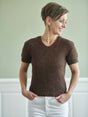 Denne t-shirt er strikket rundt nedefra og op. Arbejdet er delt ved ærmerne, og forstykke og ryg er strikket hver for sig. Modellen har rund hals med ribkant. Ærmerne strikkes frem og tilbage og sys sammen til sidst. Sammensyningen giver et ensartet udtryk, når modellen er færdig, i stedet for indtagninger undervejs i strikkeprojektet. Samtidig giver påsyningen af ærmerne, modellen et skræddersyet look. Når du vælger garnfarve, får du den bedste effekt i de Venezia-farver, der er lidt melerede.