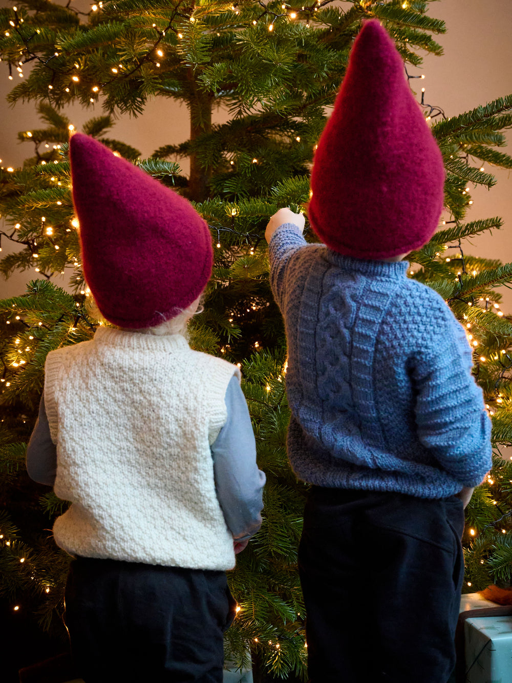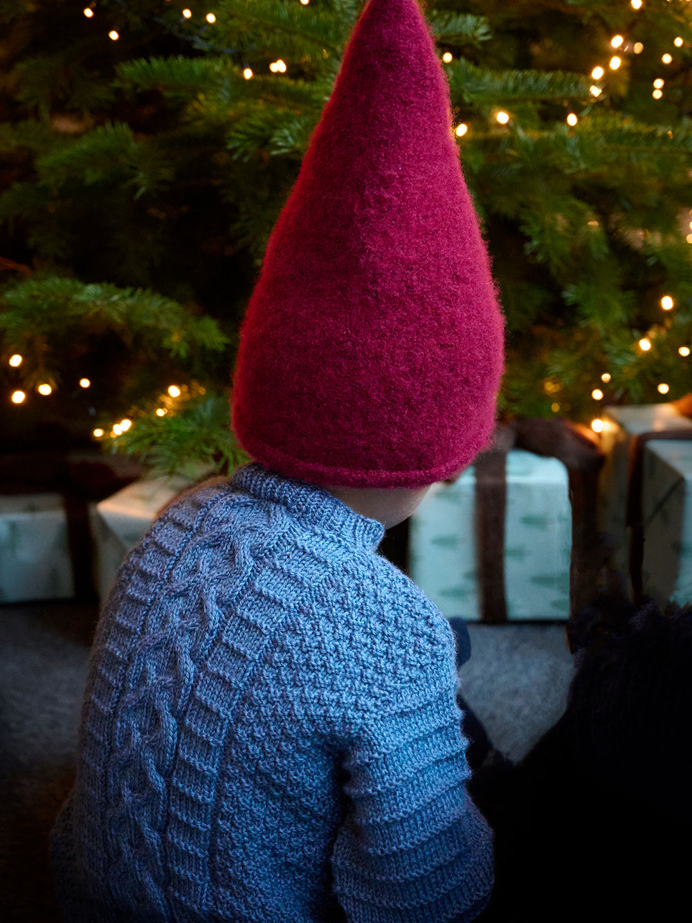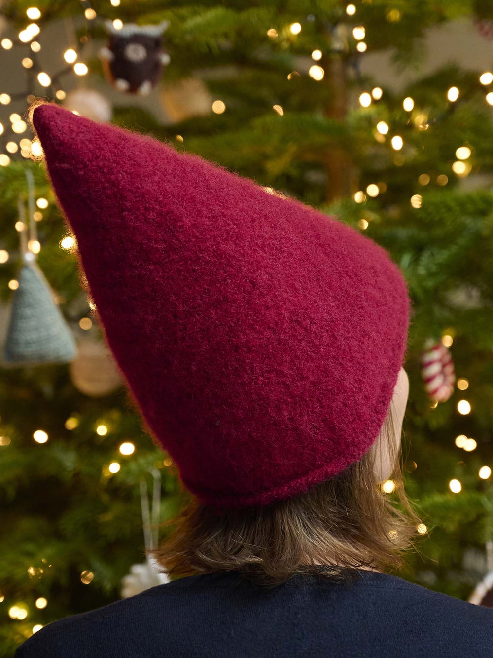 Denne superfine nissehue er strikket og derefter filtet. Dette giver huen et helt perfekt og hyggeligt udtryk. Huen er nøje sammensat i facon, enkelthed og anvendelighed, så den sidder virkelig godt på hovedet og kan nemt bruges af både børn og voksne. Den er virkelig fin at have på udendørs, fordi filtningen gør huen ekstra fast og dermed vindtæt og varm. Opskriften er helt enkelt, så alle kan være med.