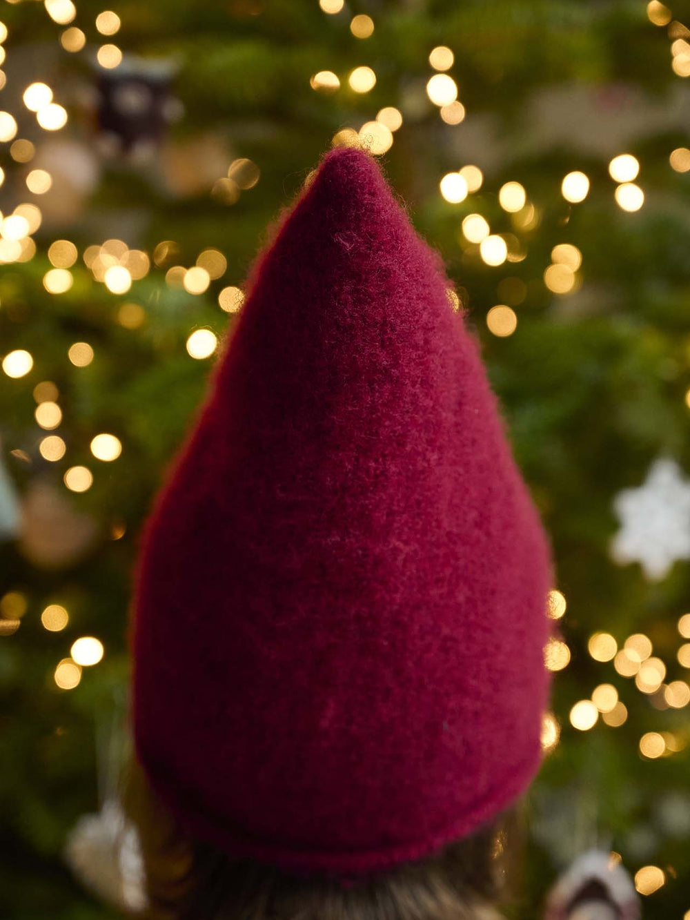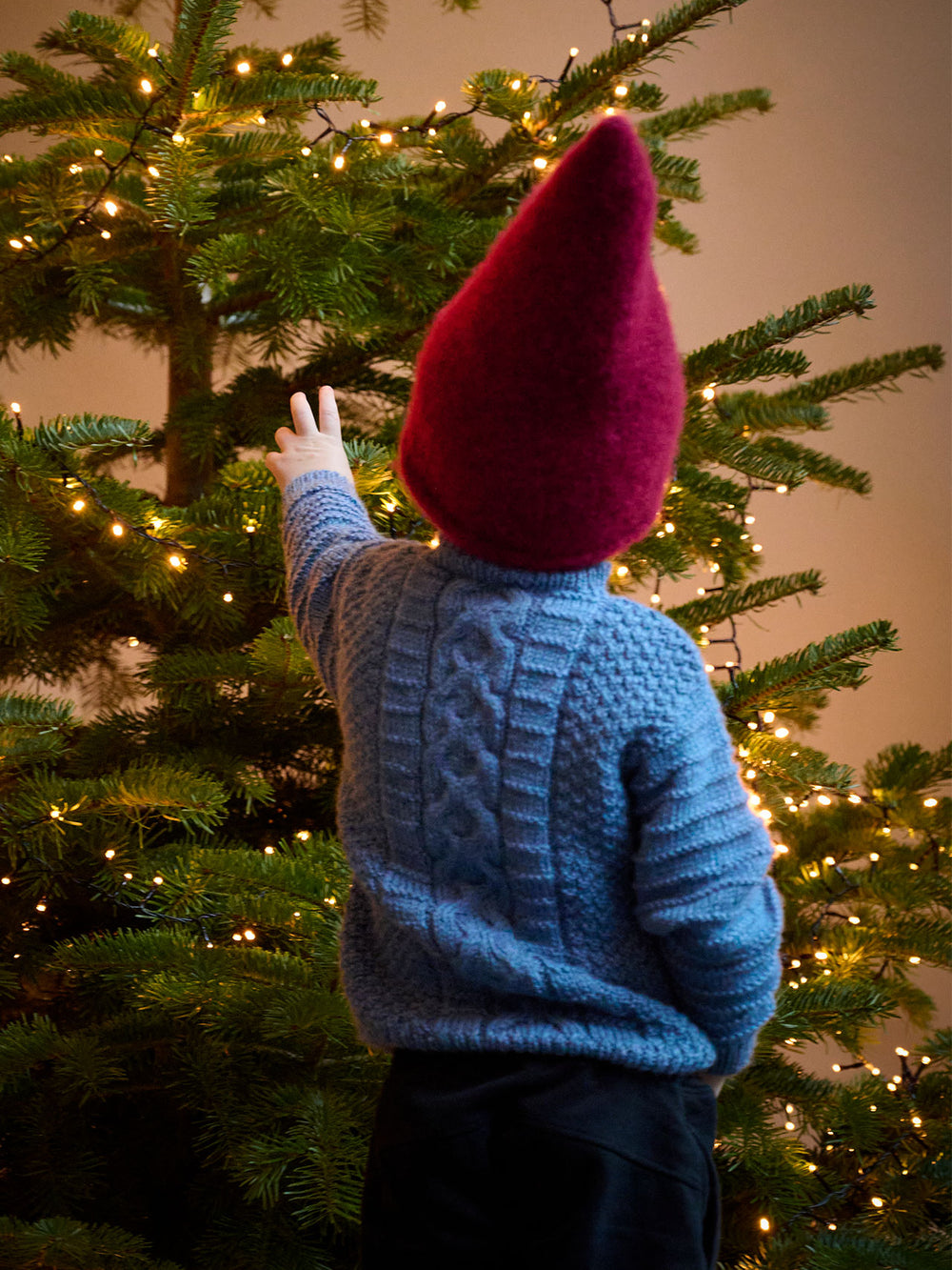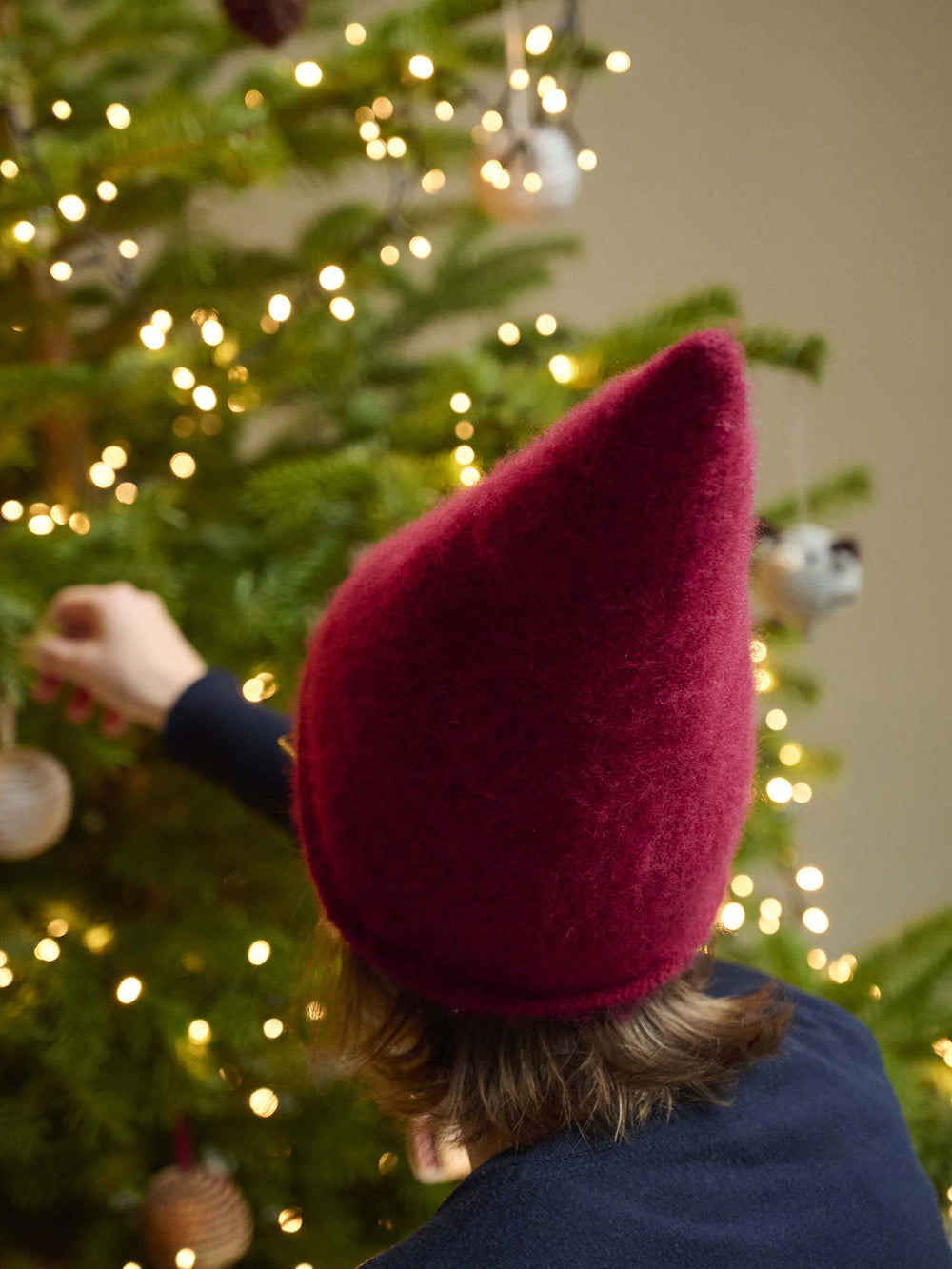 Denne superfine nissehue er strikket og derefter filtet. Dette giver huen et helt perfekt og hyggeligt udtryk. Huen er nøje sammensat i facon, enkelthed og anvendelighed, så den sidder virkelig godt på hovedet og kan nemt bruges af både børn og voksne. Den er virkelig fin at have på udendørs, fordi filtningen gør huen ekstra fast og dermed vindtæt og varm. Opskriften er helt enkelt, så alle kan være med.