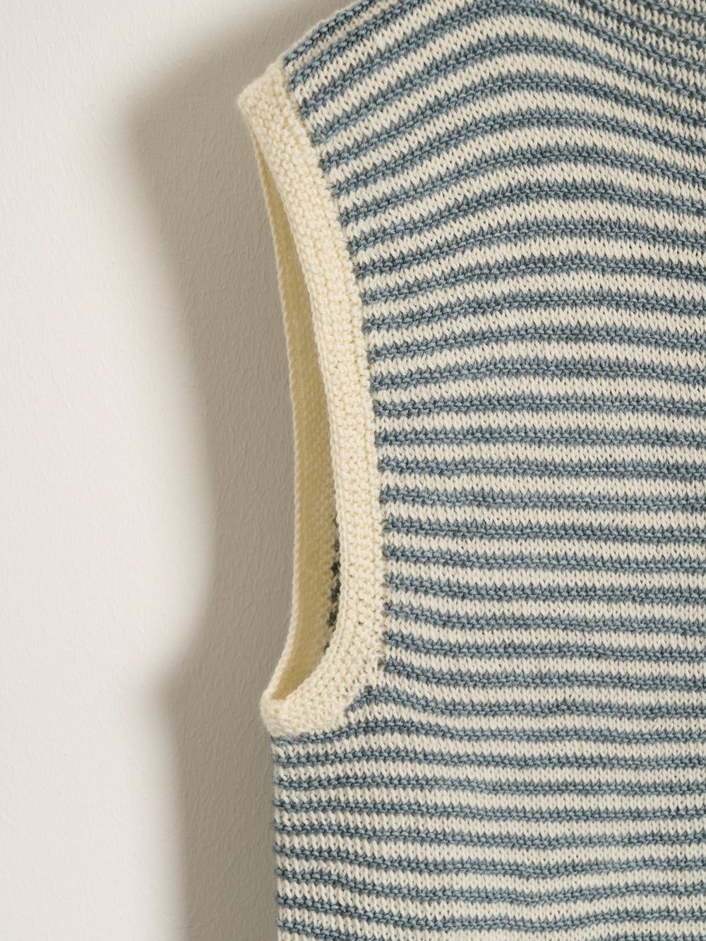 Vesten strikkes nedefra og op i et stribet mønster, som giver lidt 3D-effekt. Vesten strikkes nemlig i et mønster af glatstrik, som brydes af en vrangpind, hvilket giver den flotte effekt. Den stribede effekt bliver allermest tydelig, når vesten strikkes i farver med stor kontrast.