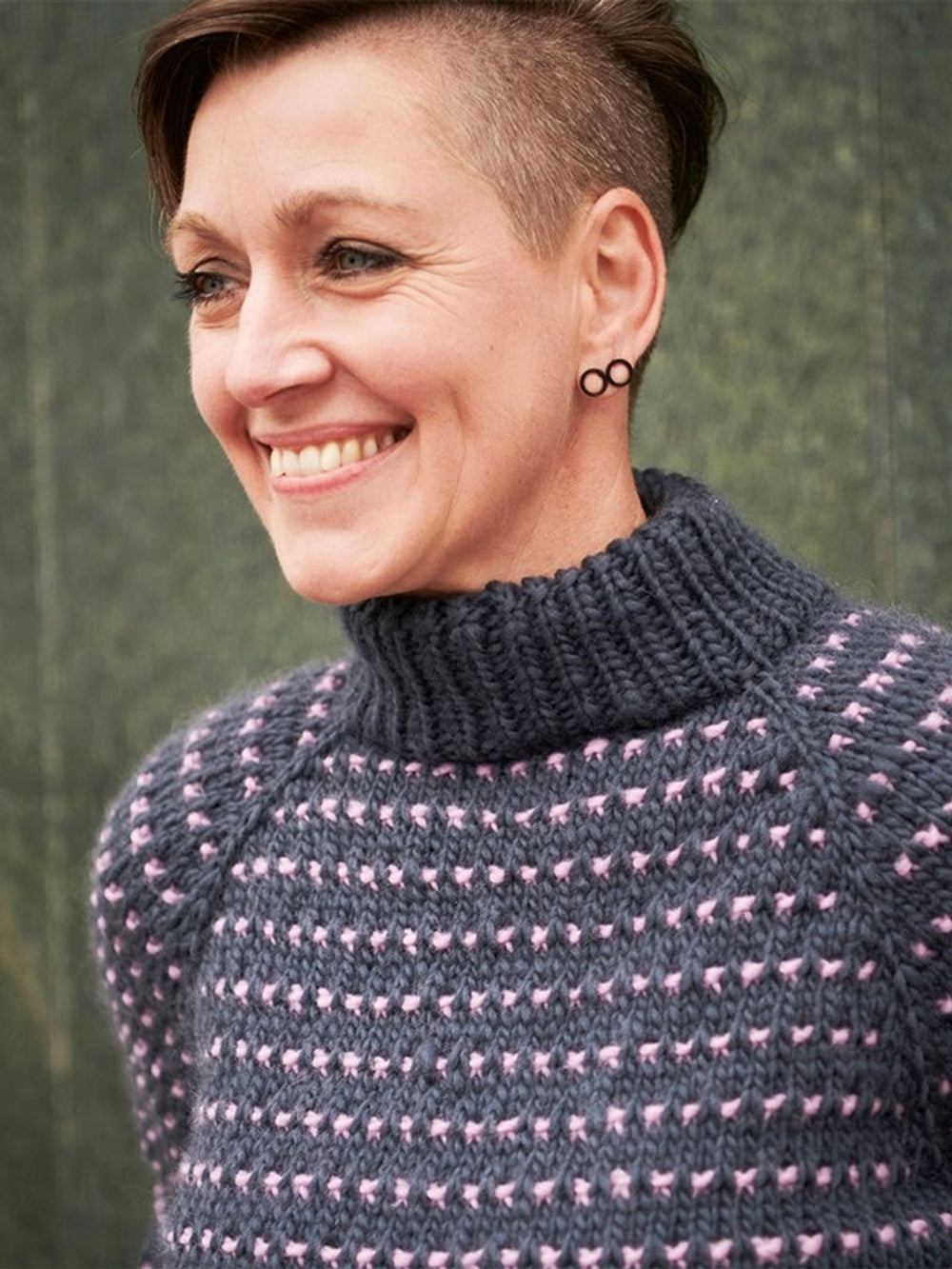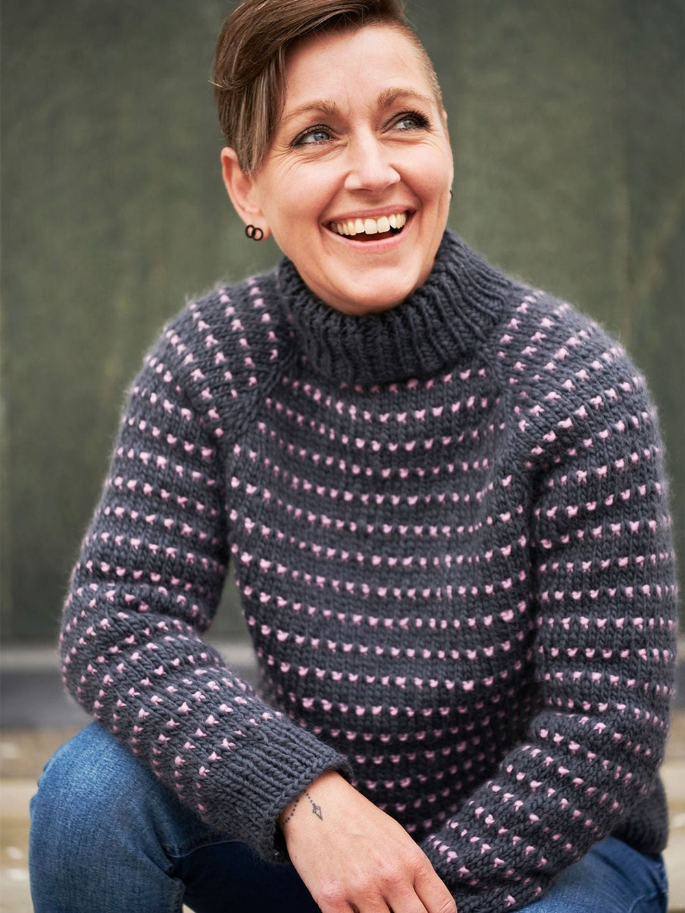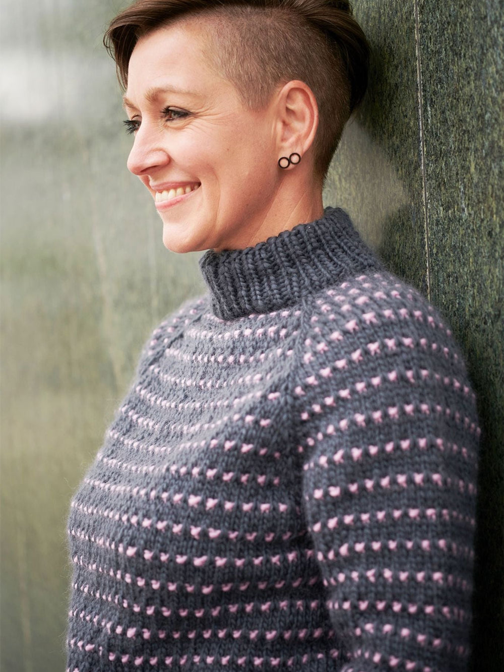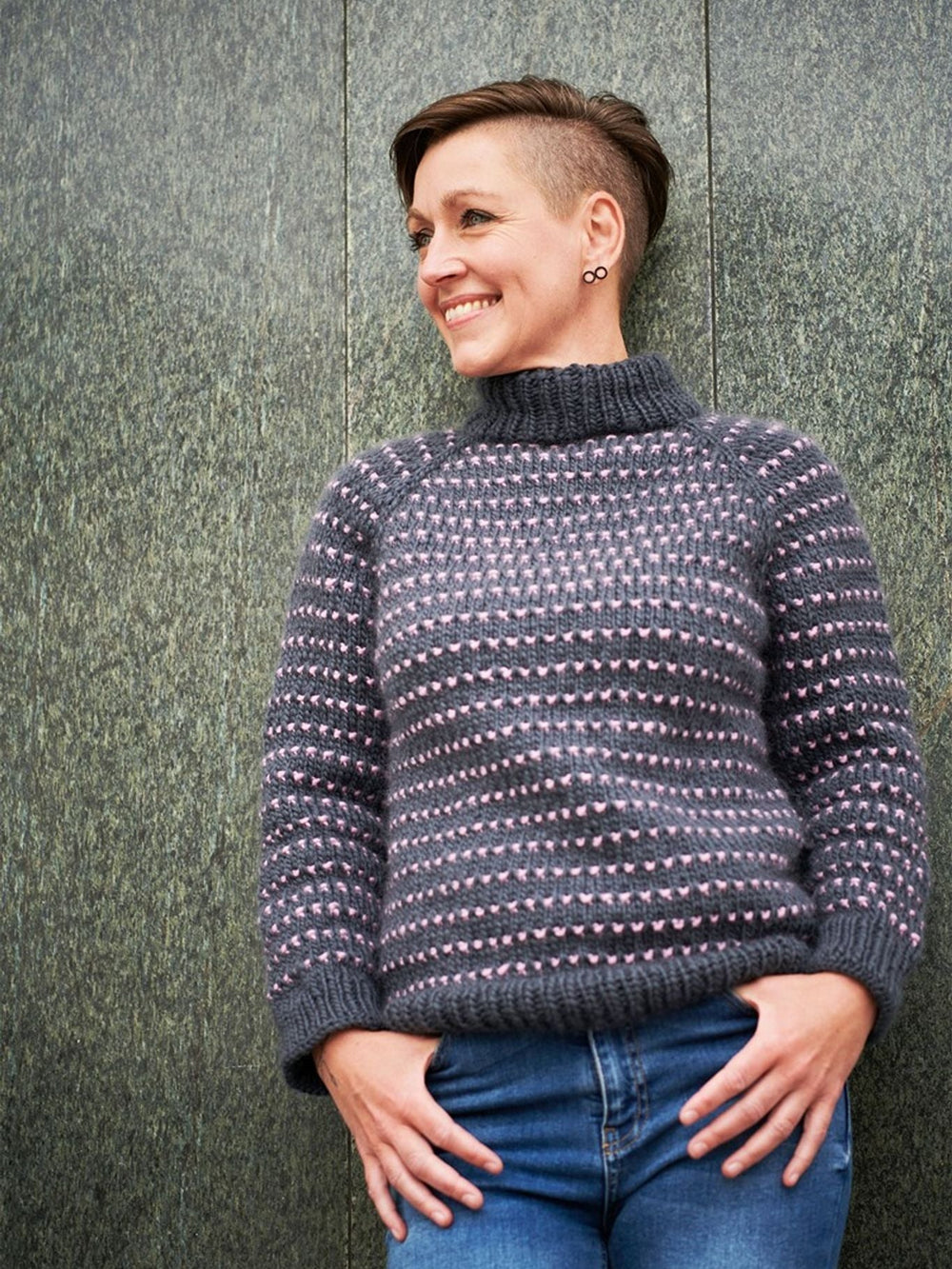Lækker og voluminøs sweater, som strikkes topdown med raglanudtagninger og vævestrik. Sweaterens hals strikkes i dobbelt højde, hvilket giver sweateren et flot udtryk.