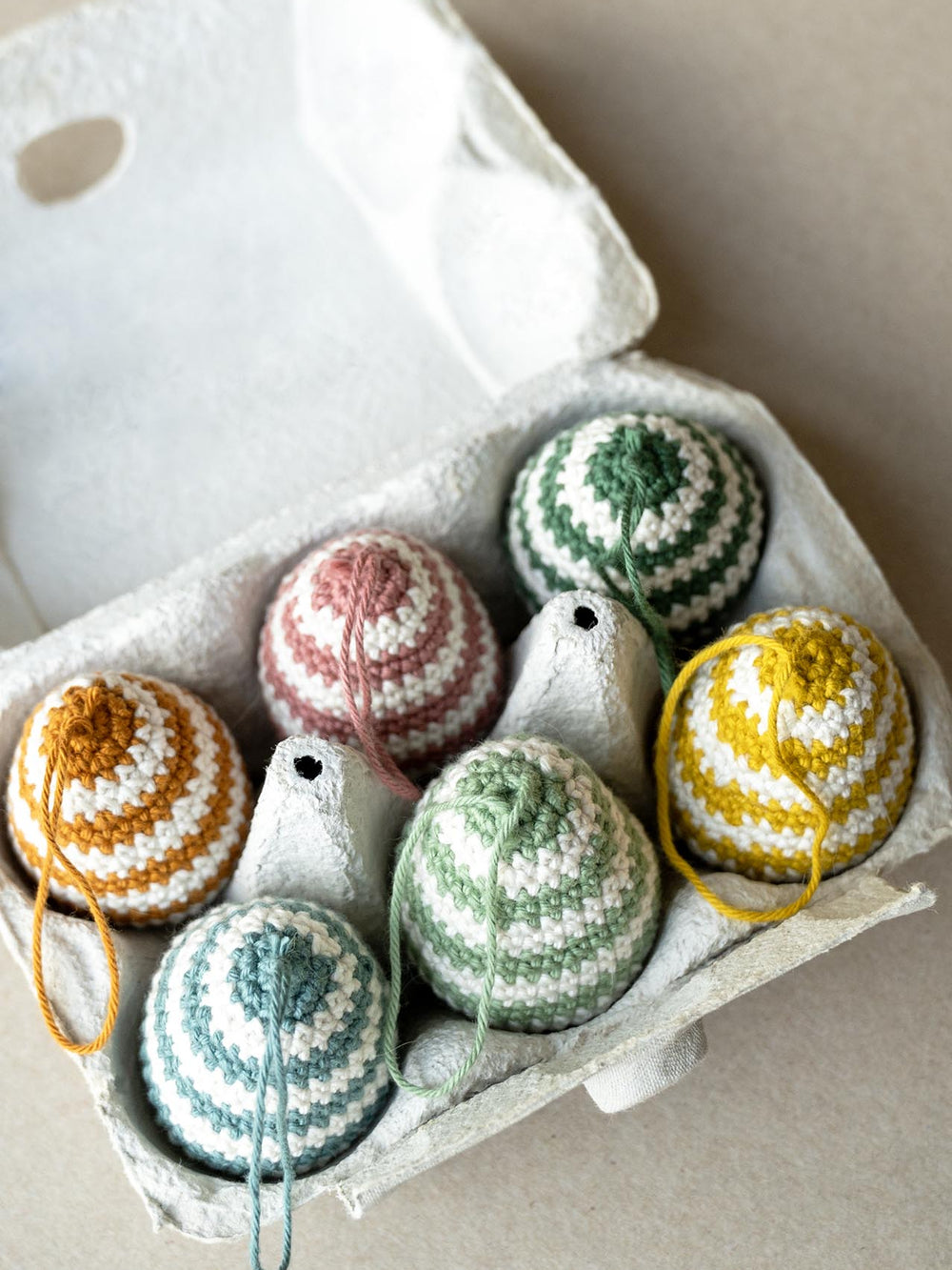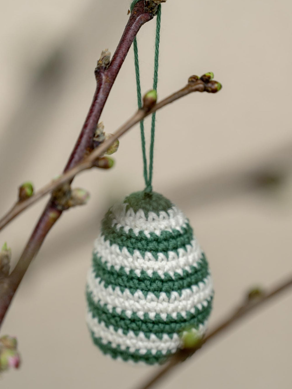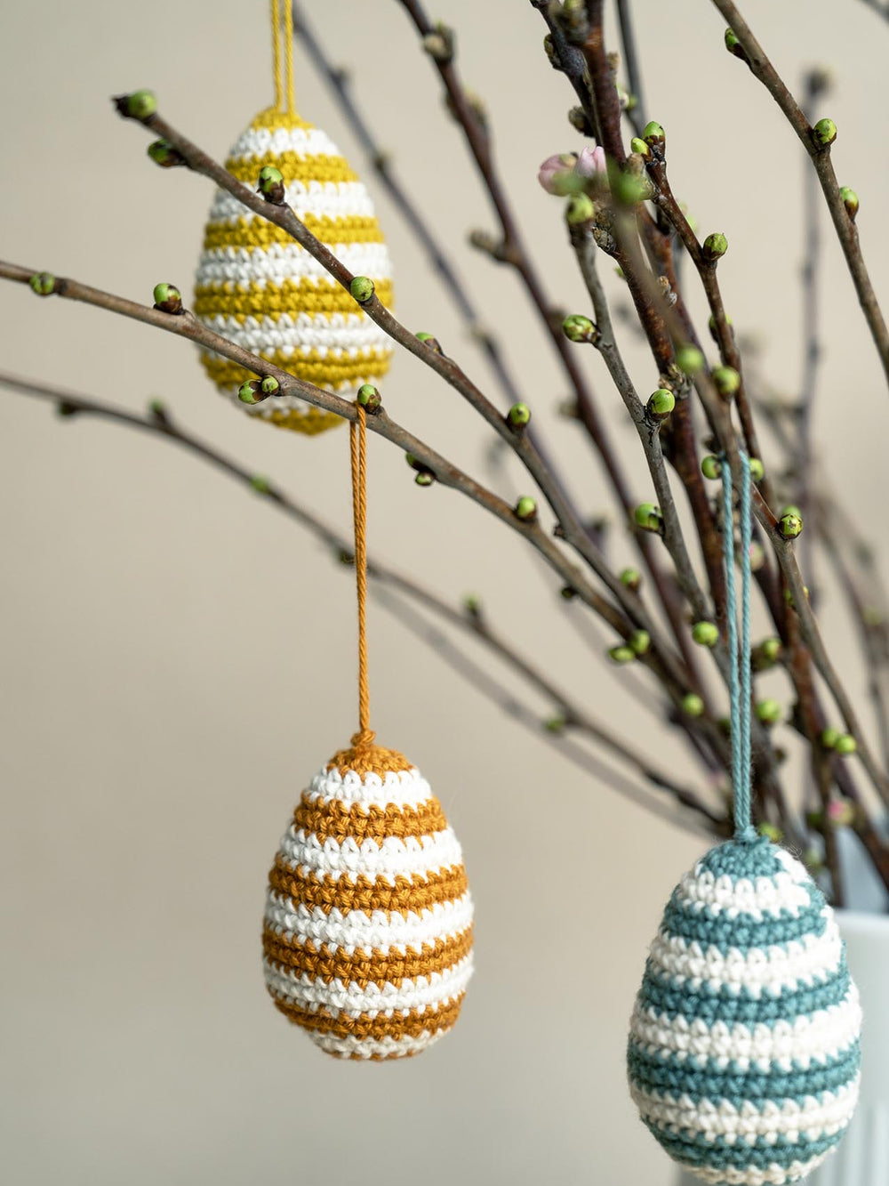 Det er så nemt at hækle et påskeæg, at selv nybegynderen kan være med. Her er påskeæggene med striber i forskellige farver, men du kan også sagtens undlade striberne og hækle påskeægget i én farve.