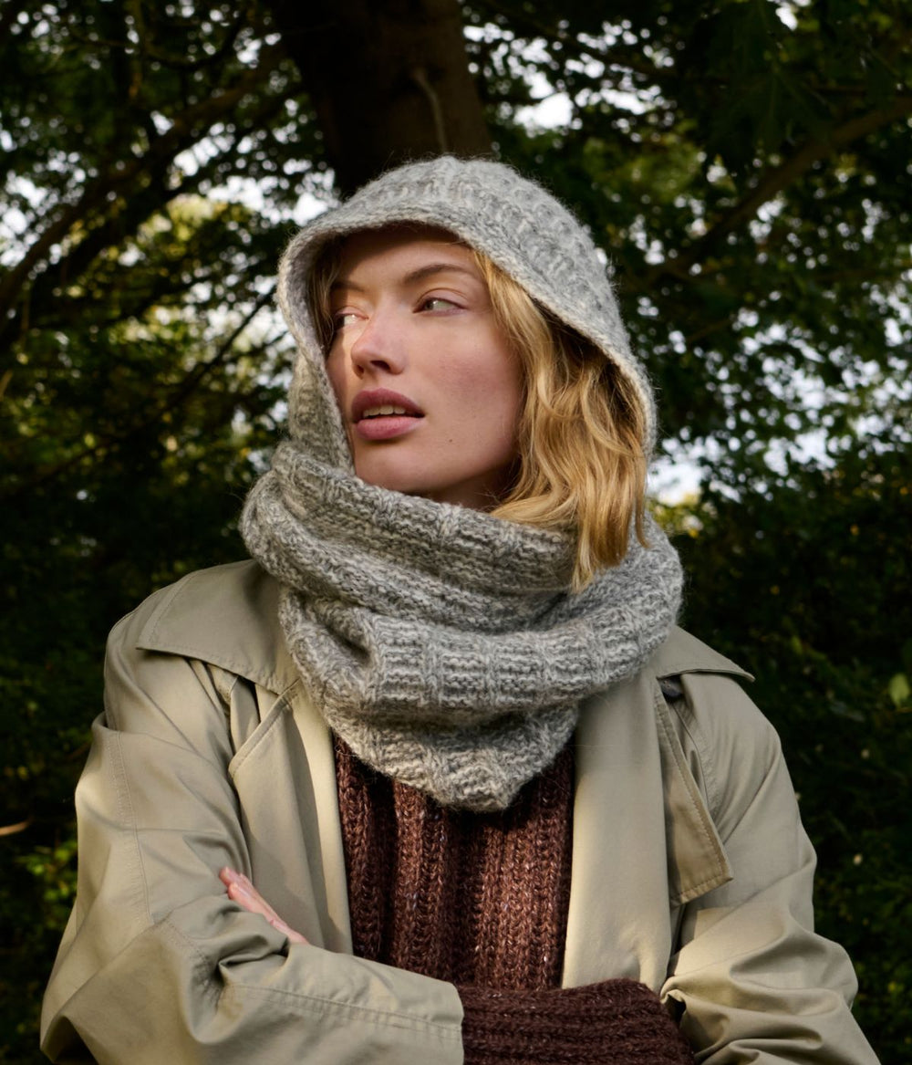 Halstørklæde med hætte, som er strikket med 2 tråde: 1 tråd Mayflower Santiago Light og 1 tråd Mayflower Easy Care. Med kombinationen af 2 tråde har du mulighed for at give dit strik et fint farvespil, hvis du vælger garnkvaliteter i forskellige nuancer.