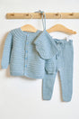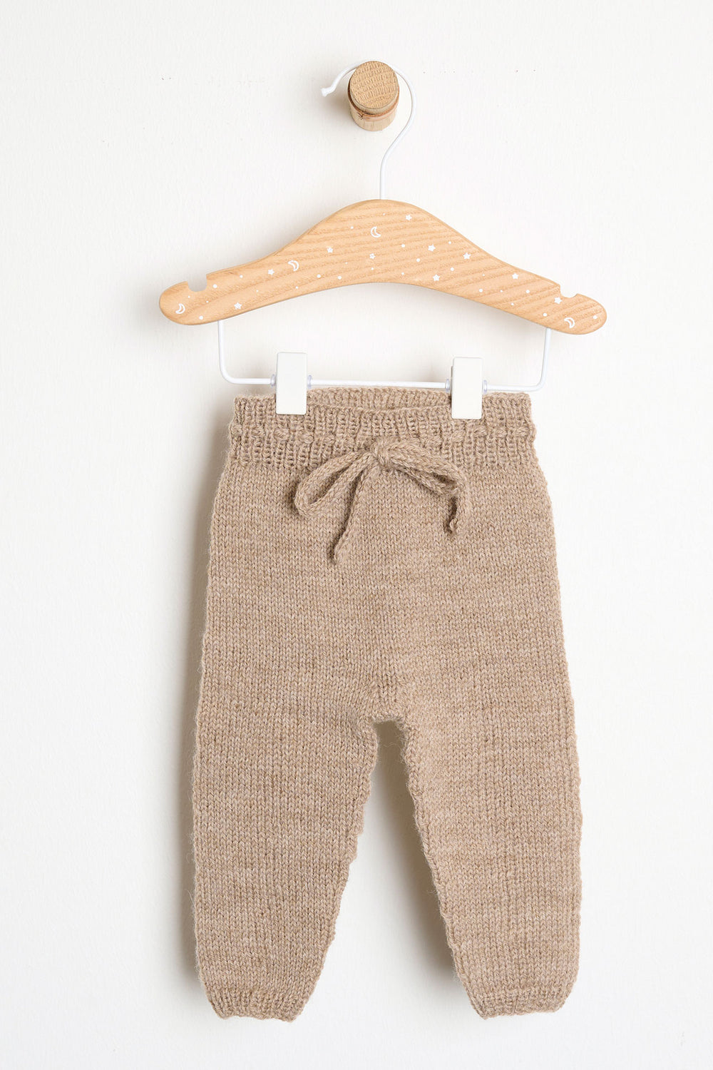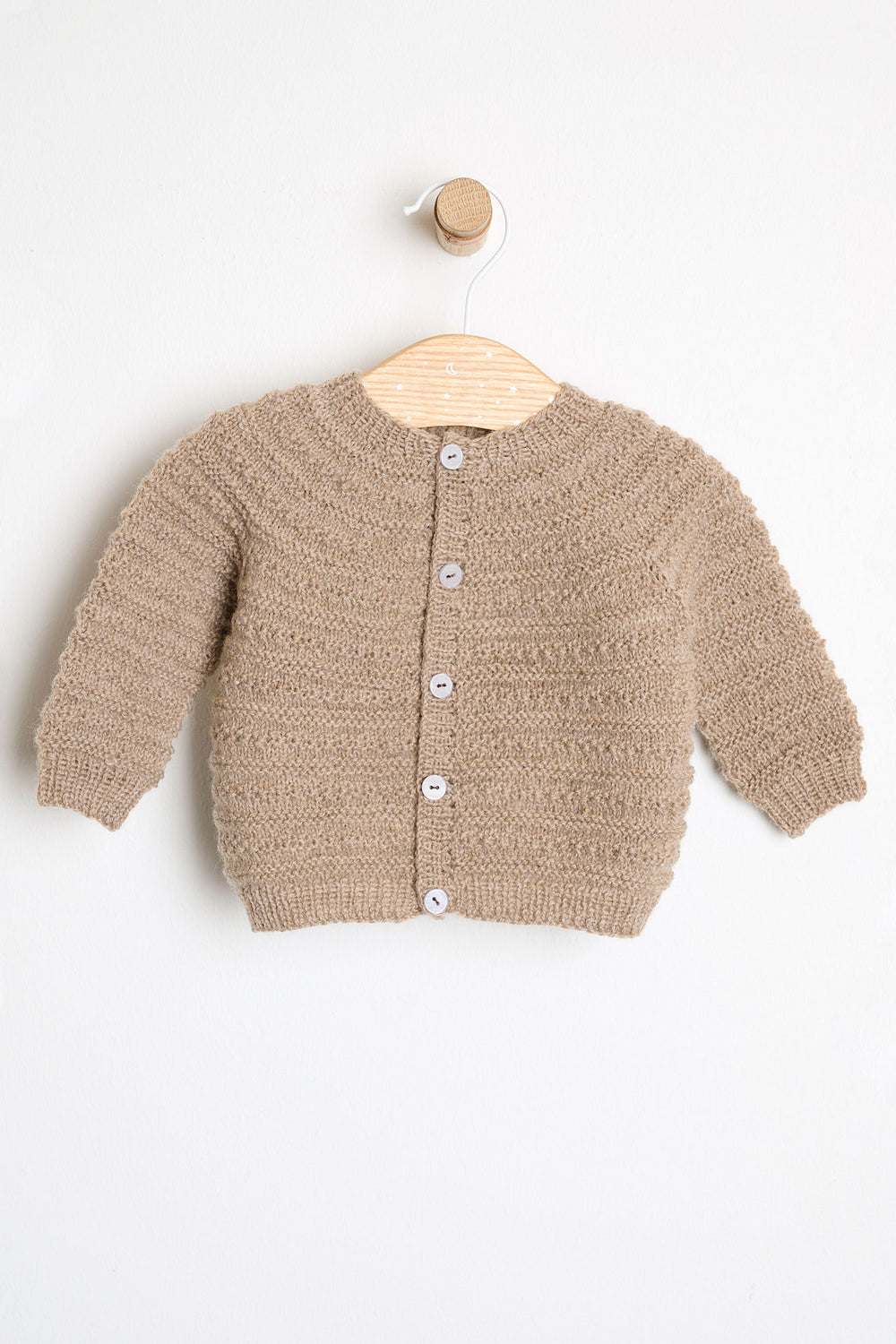 Blødt og eksklusivt hentesæt til baby, som består af bukser i glatstrik samt kyse og cardigan med et gennemgående strukturmønster. Kysen er strikket i et dekorativt mønster og lukkes med en i-cord-snor, der holder kysen på plads. Cardiganen strikkes oppefra og ned i strukturmønster med udtagninger i bærestykket og monteres med knapper. Bukserne har en helt enkel konstruktion i glatstrik med ribkanter og hulrække til at trække en i-cord-snor igennem.