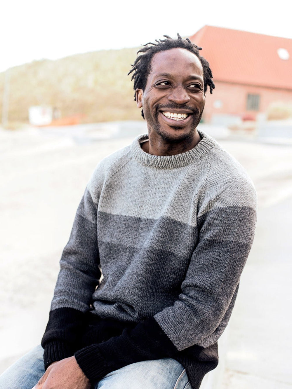 Lækker og lun herresweater, som strikkes nedefra og op. Denne model er strikket i striber, ligesom sweateren også vil være flot i en ensfarvet model.