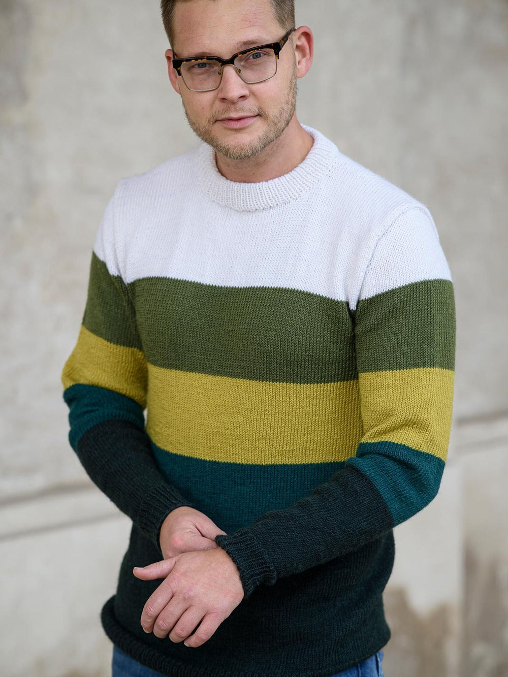 Denne herresweater har et tidløst design med brede horisontale striber, som giver en flot farveeffekt uden at ødelægge sweaterens enkle design. Det enkle look understreges af selve sweateren, som er glatstrikket og helt klassisk med rund halsudskæring og ribkanter.