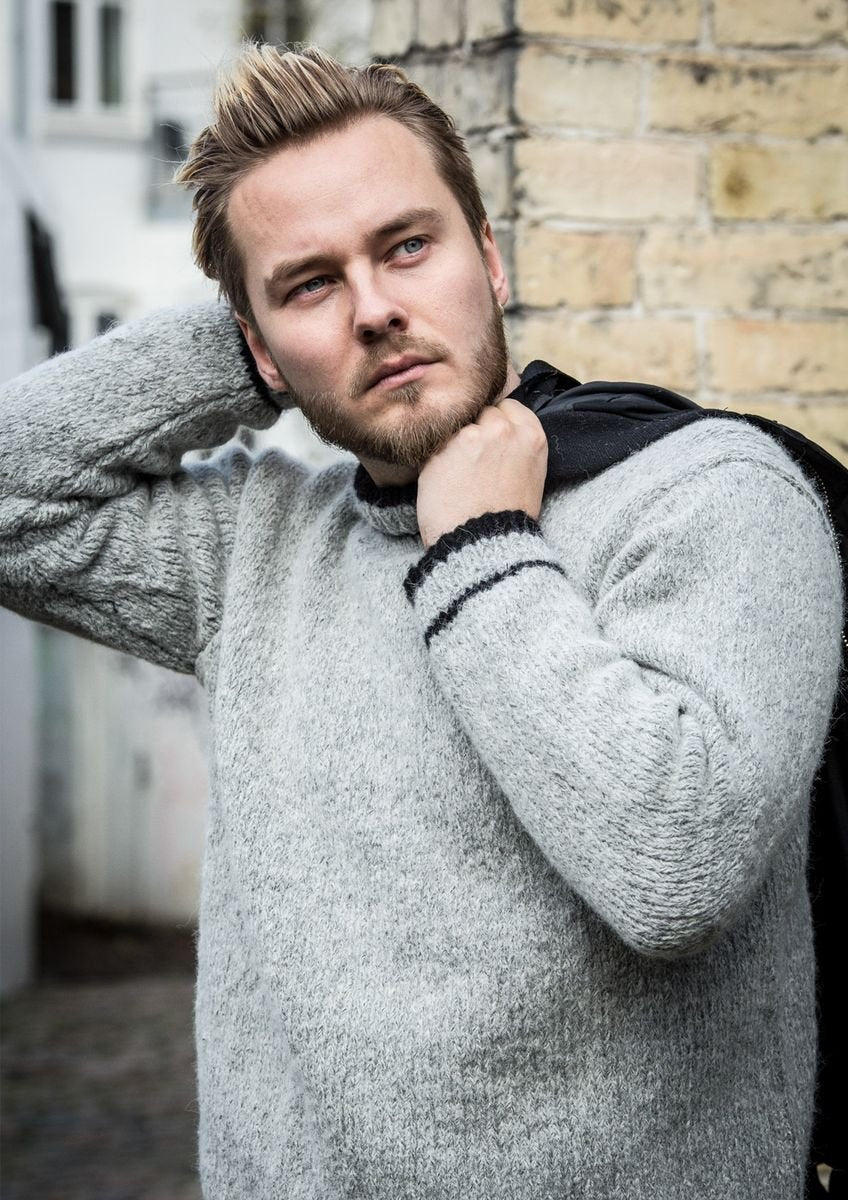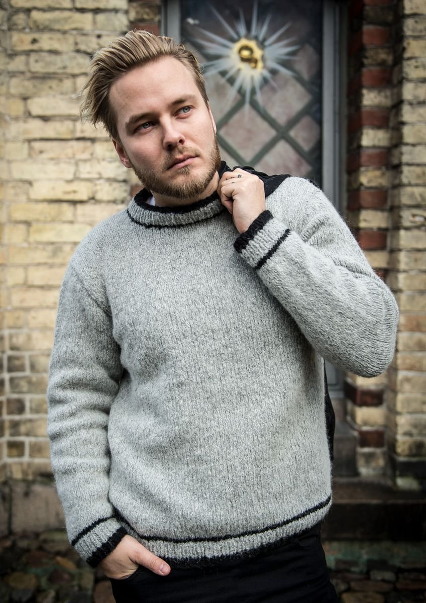 Lækker herresweater, som er strikket i lysegråt garn med sorte kanter som kontrast. Dette skaber et enkelt og tidløst design, som kan passe til de fleste mænd, der gerne vil have en varm og pæn sweater.