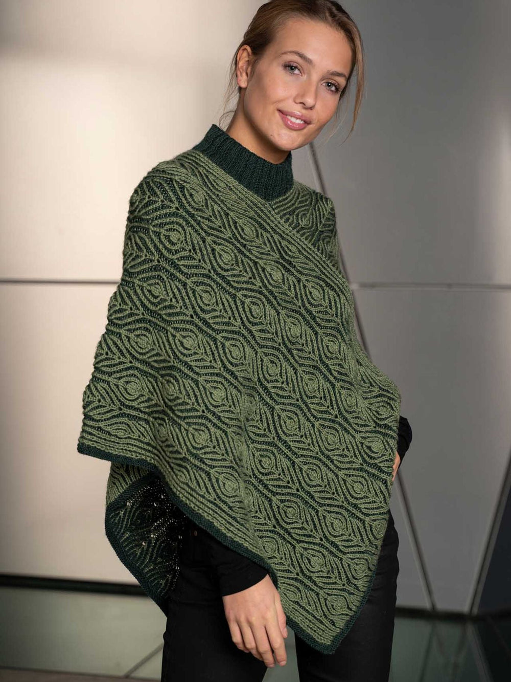 To-farvet patent er i forvejen en interessant strikketeknik med et karakteristisk udseende, og det bliver særligt smukt, når der eksperimenteres med ind- og udtagninger. På dén måde fremhæves farvespillet mellem bund- og mønsterfarve yderligere, og på Leonora ponchoen skabes de flotteste påfuglefjer.