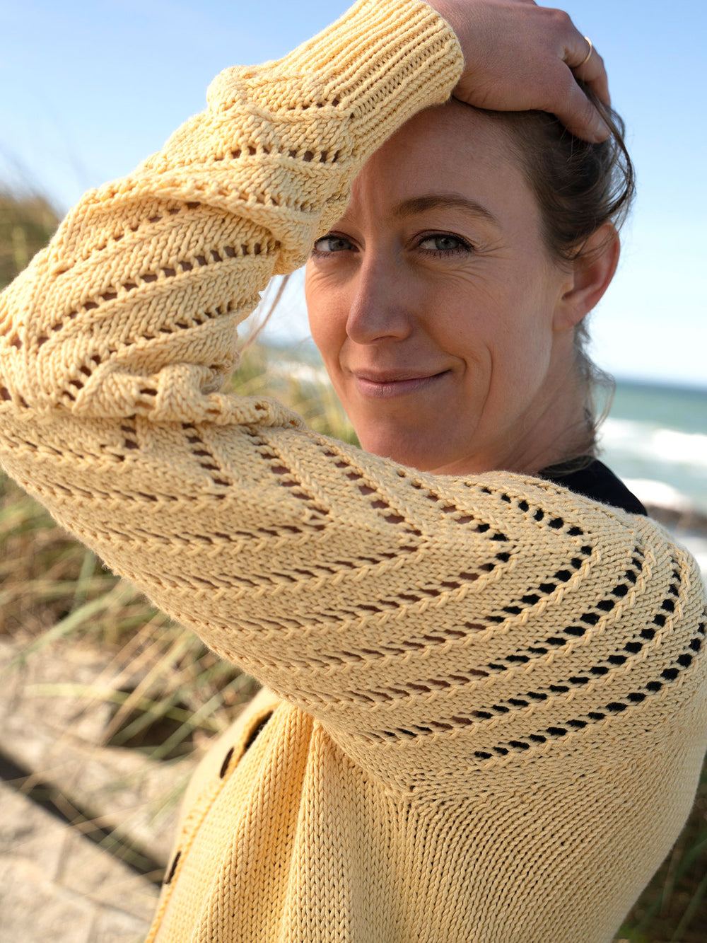 I princippet en enkel cardigan i glatstrik med ribkanter, raglanudtagninger og knapper, men det symmetriske hulmønster på ærmerne, som går hele vejen fra skuldrene og ud til ærmekanten, højner det samlede indtryk. Ærmerne gør trøje virkelig spændende og får den til at skille sig positivt ud. Et enkelt mønster med en ufattelig smuk effekt.