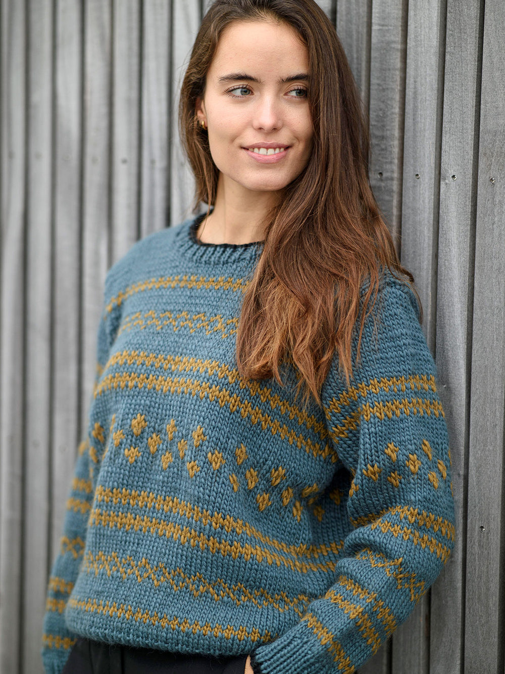 Du vil især blive glad for denne sweater på årets kolde dage, da den er dejlig tyk og vamset. Den strikkes i Molly Fine, som er ren, letspundet uld med ekstra stor luftighed, og dit strik føles derfor let og behageligt at have på, selvom det er en voluminøs kvalitet.