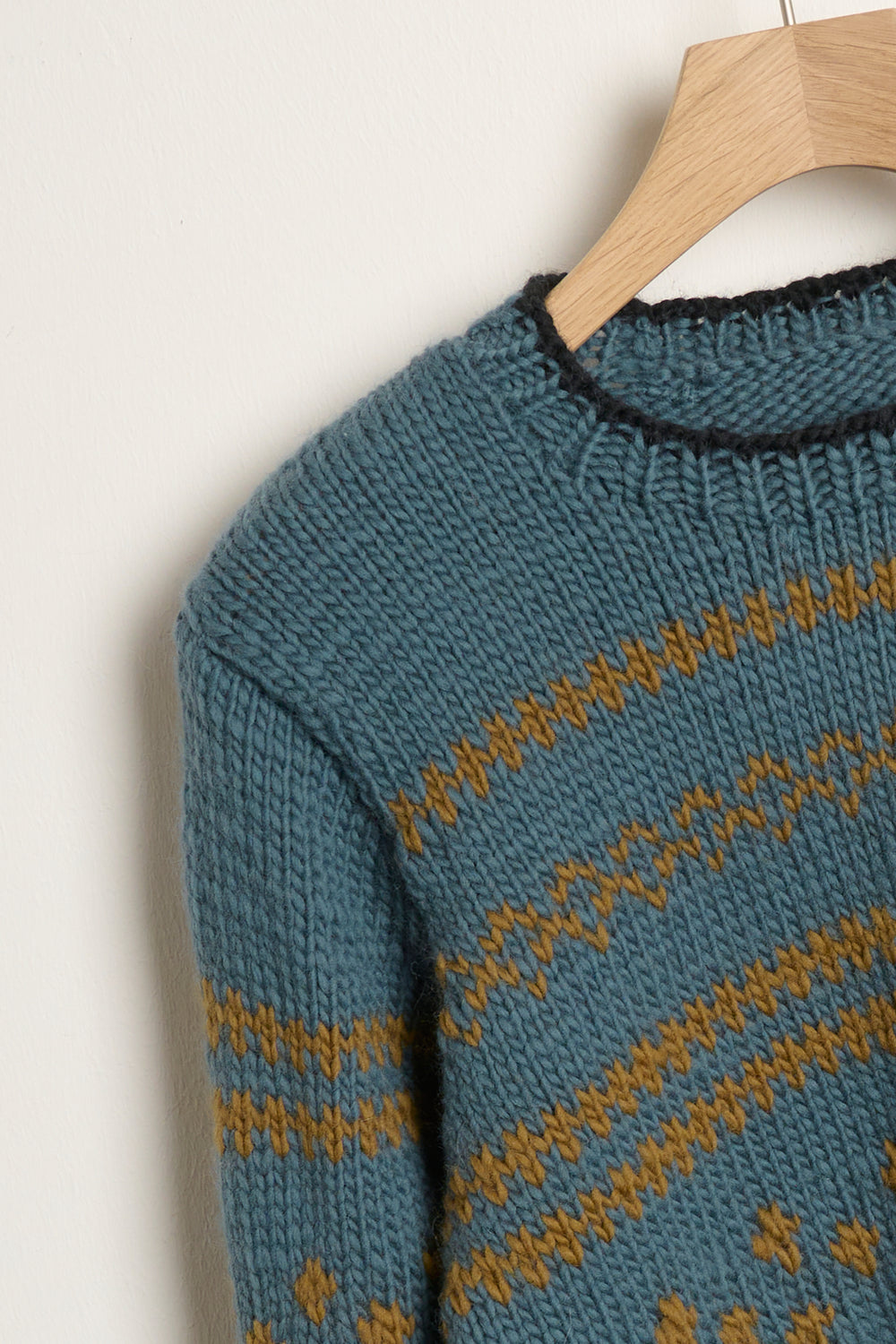 Lucca sweateren er en forholdsvis nem opskrift, og den kan være et godt valg, hvis du skal prøve flerfarvet strik for første gang, da du kun kommer til at strikke mønster med to farver ad gangen og over få masker. Molly Fine har en dejlig kraftig struktur, hvor det er nemt at se de enkelte masker og få godt styr på teknikken. Samtidig kan du også hurtigt rette eventuelle fejl.