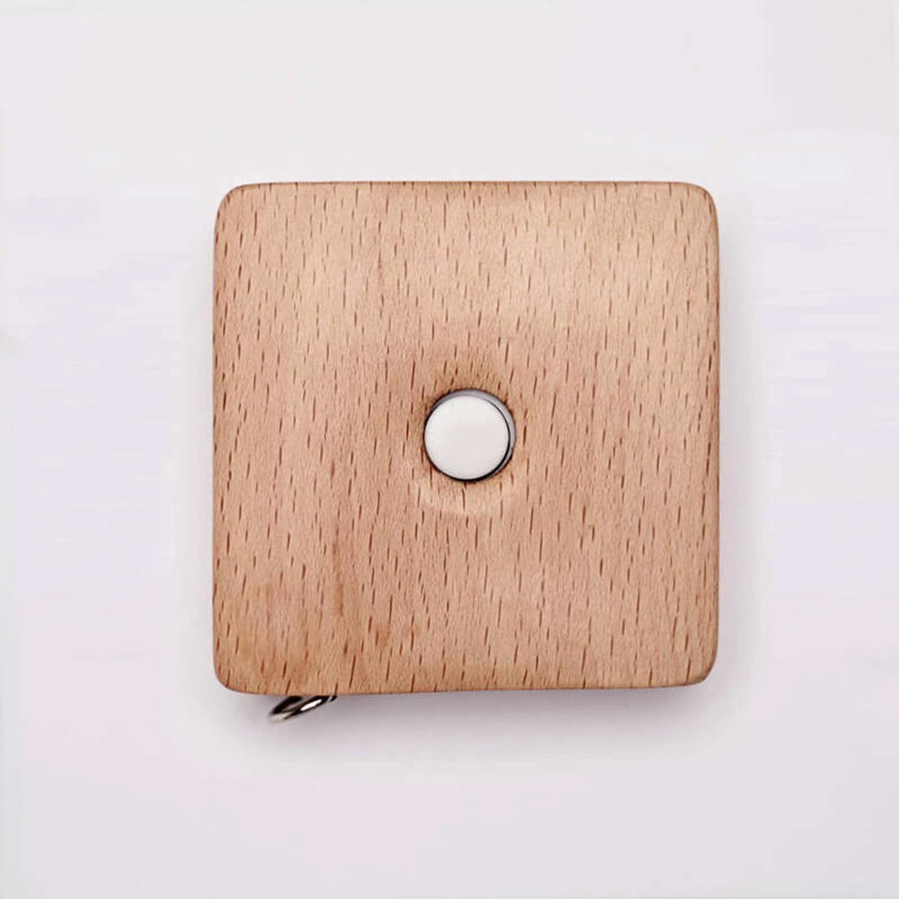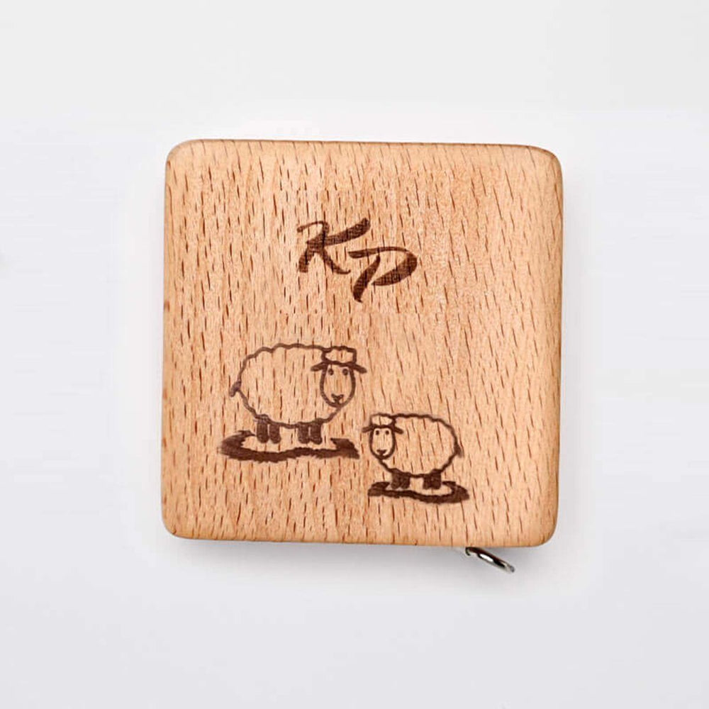 Målebånd fra KnitPro, som kommer i en smuk, firkantet træholder. Målebåndet er 150 cm langt. Du ruller det ud ved at trække i målebåndet og ruller det sammen igen ved at trykke i midten af blomsten på fronten af holderen.