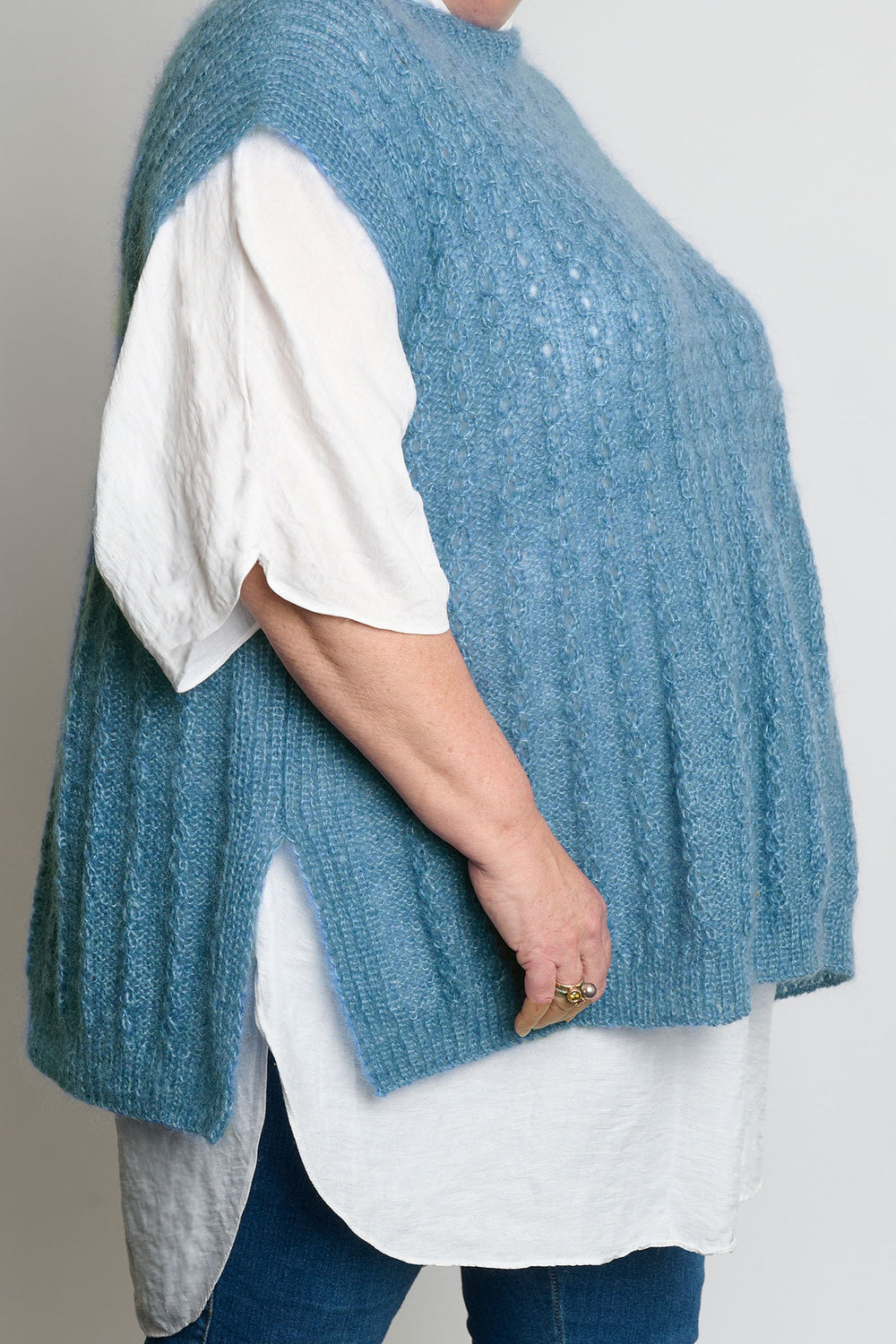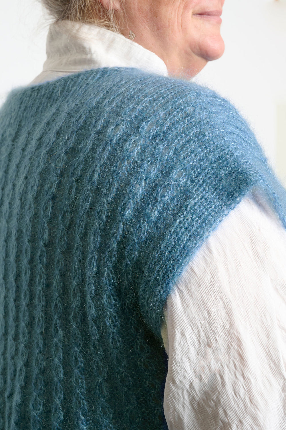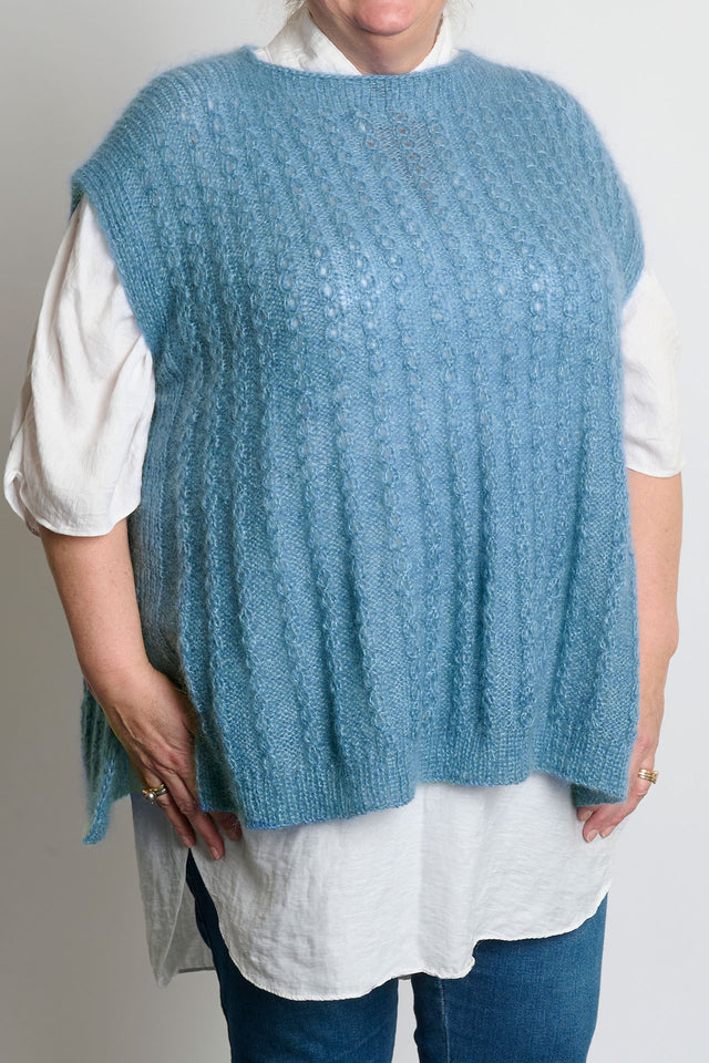 Let og luftig slipover, som strikkes oppefra og ned med to tråde Mayflower Super Kid Silk. Et blødt og fint mohairgarn, som fås i et væld af forskellige farver. Slipoveren strikkes med falske snoninger, og designet er derfor nemmere at strikke, end man skulle tro. Nederst er der en slids i begge sider.