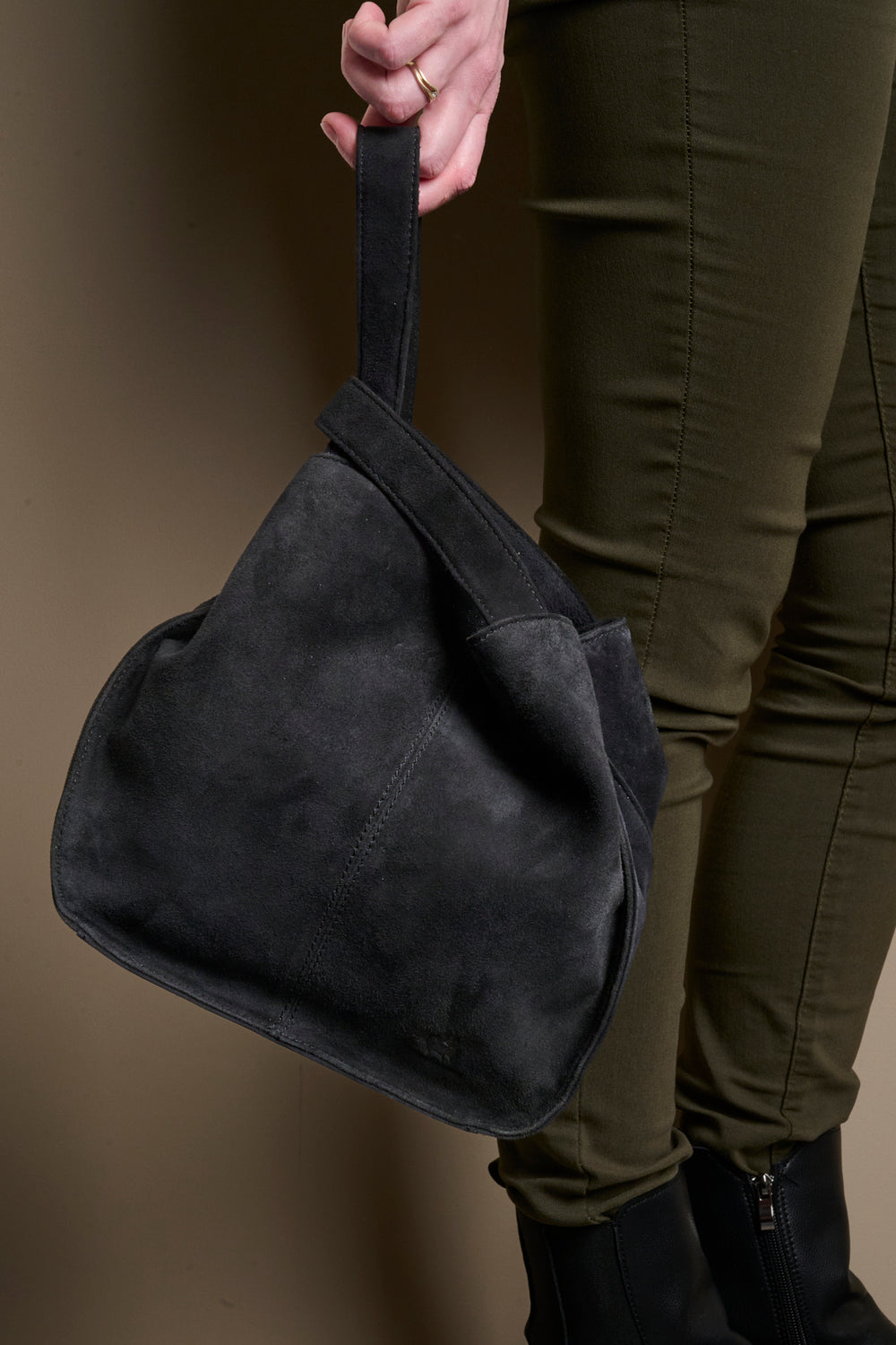 OBS: Tasken kan med fordel imprægneres for at beskytte ruskindet mod vand. Tasken sælges uden indhold.