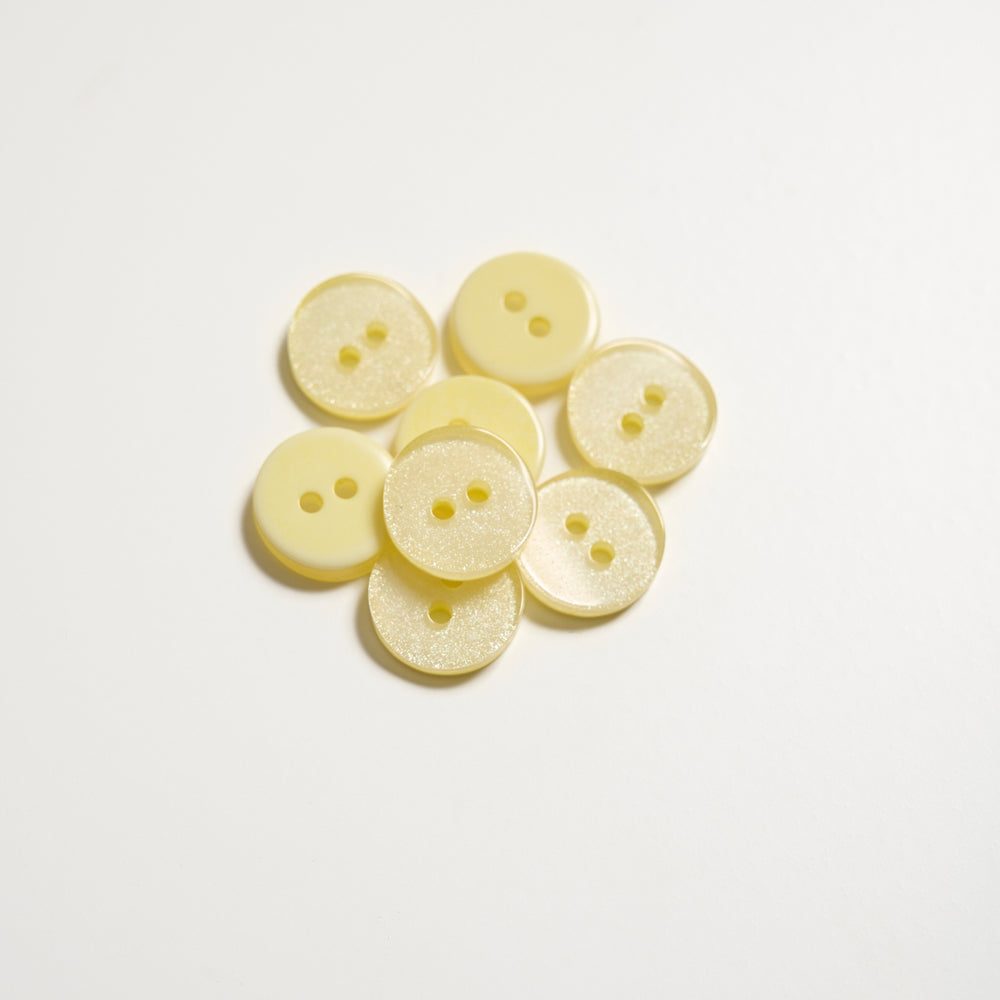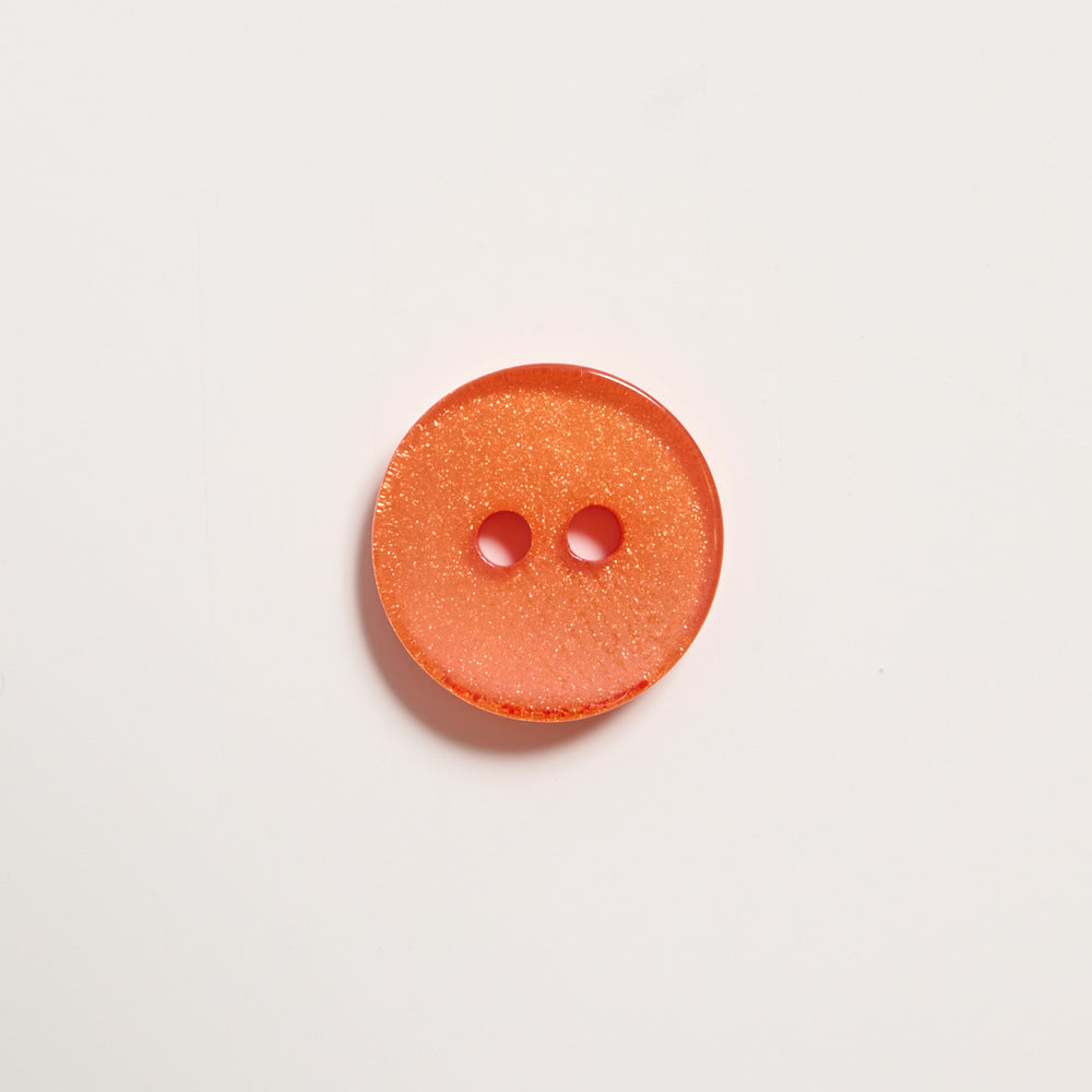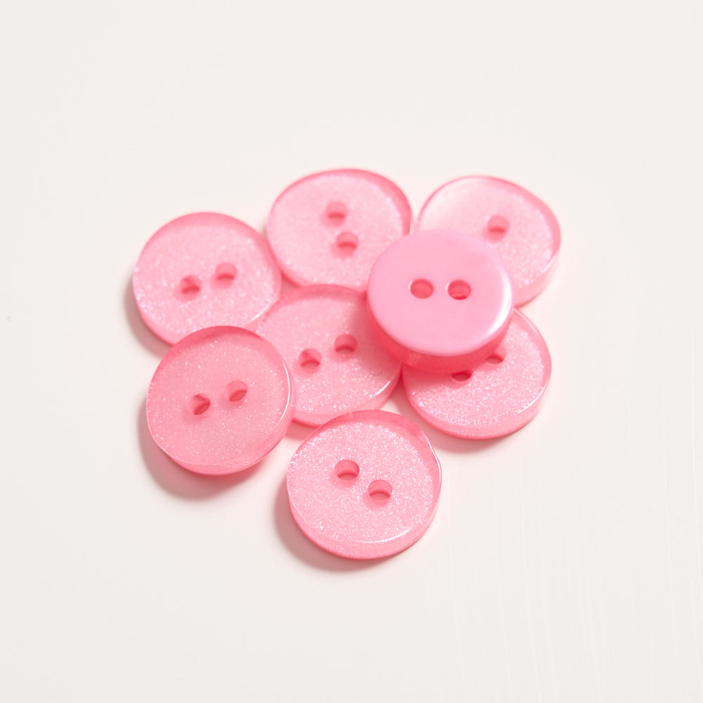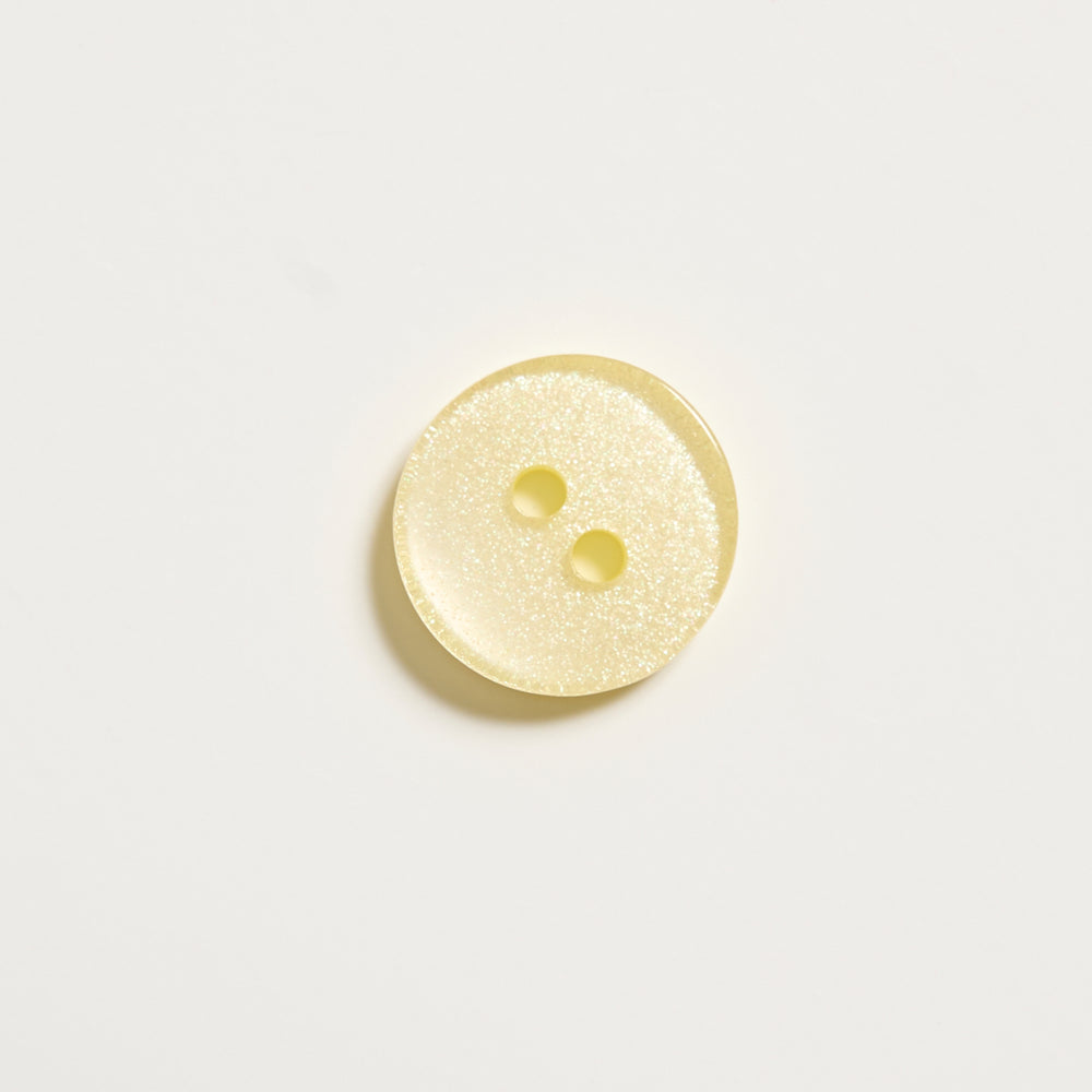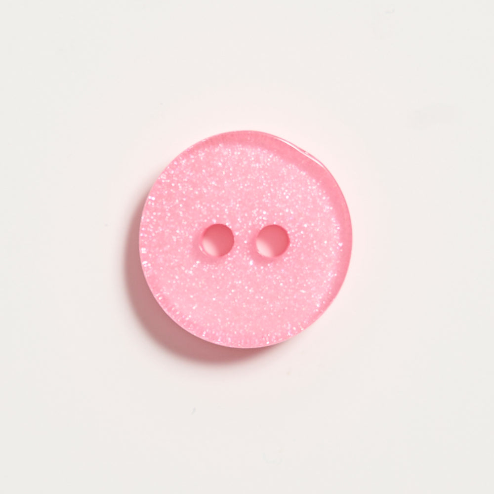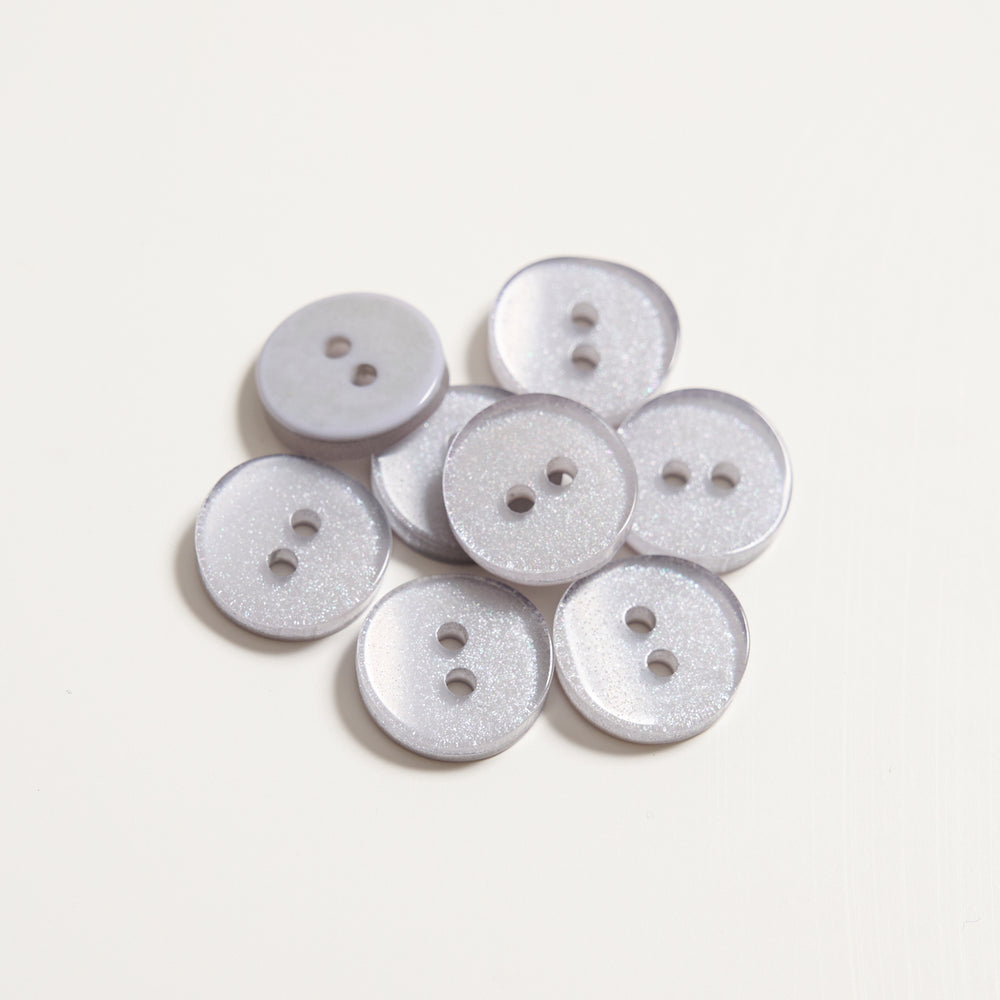 Knap med to huller og glimmereffekt i dybe nuancer og pastelfarver. Mål: 11mm. Antal: 8 stk.