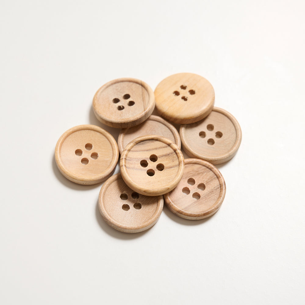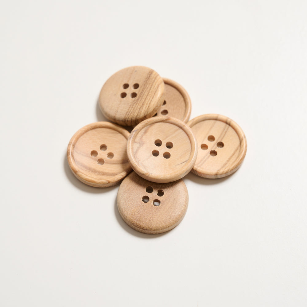 Helt almindelige træknapper med fire huller og en lille kant i seks forskellige størrelser fra 13-25 mm.