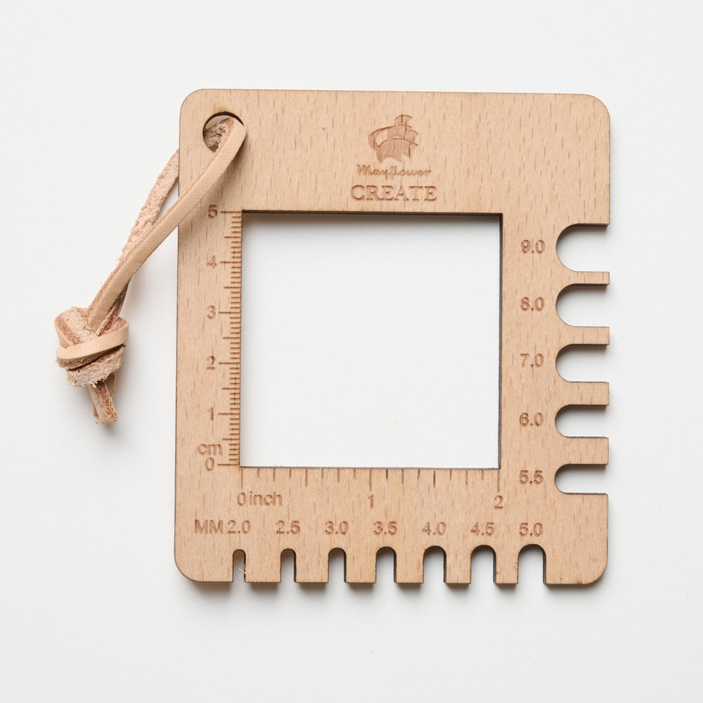 En strikkefasthedsmåler fra Mayflower Create i størrelse small, hvor du kan måle både tykkelsen på strikkepinden fra 2-9 mm og størrelsen på din strikkeprøve. Det midterste vindue måler 5 x 5 cm.