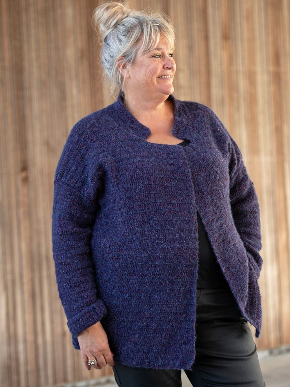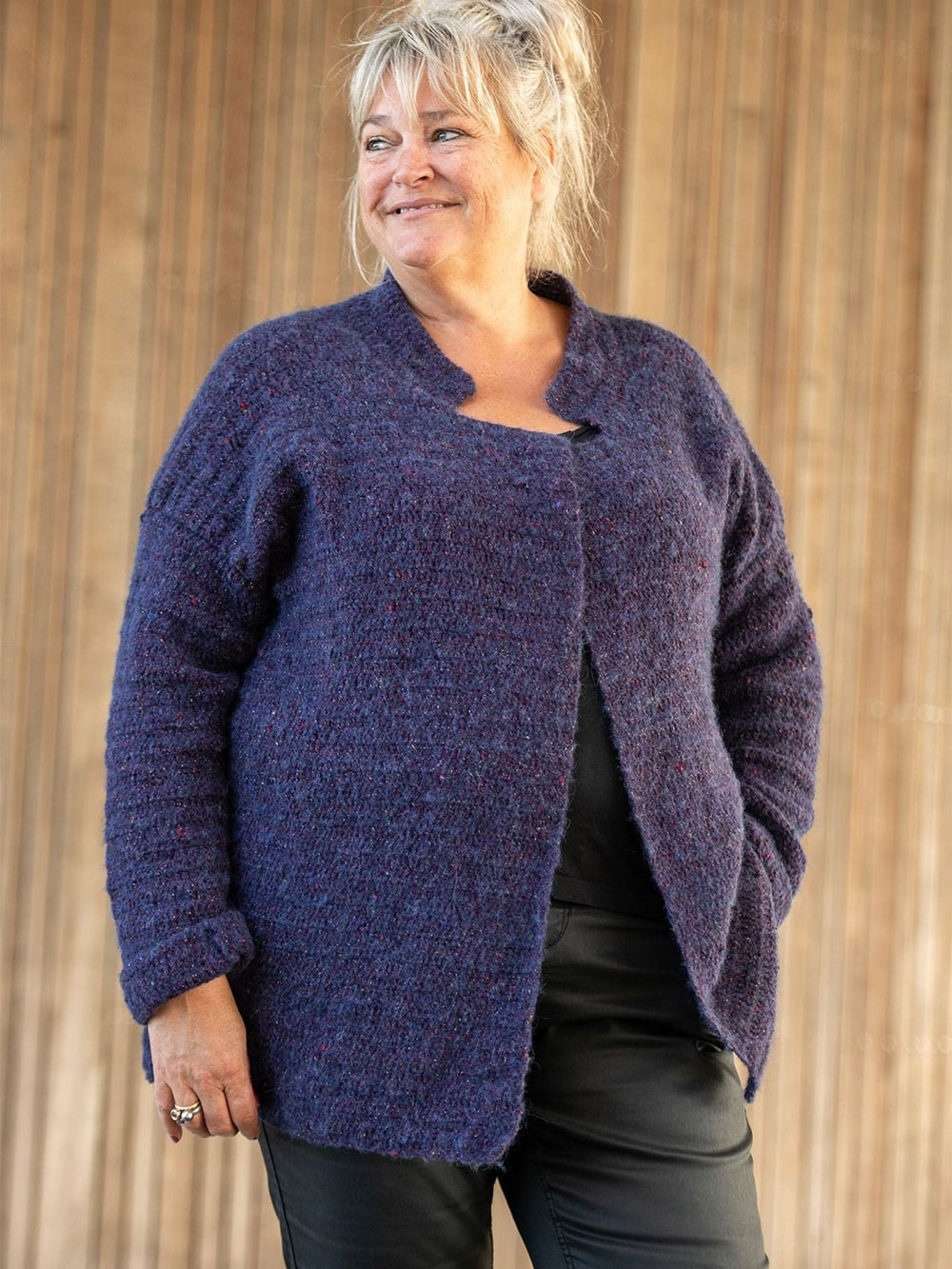 Fin, hæklet cardigan med krave, som kan laves i størrelser fra 44-50. Cardiganen har et løst design i A-snit uden knapper og et tværgående mønster. Designet er let og hurtigt at hækle, og cardiganen hækles i stangmasker.