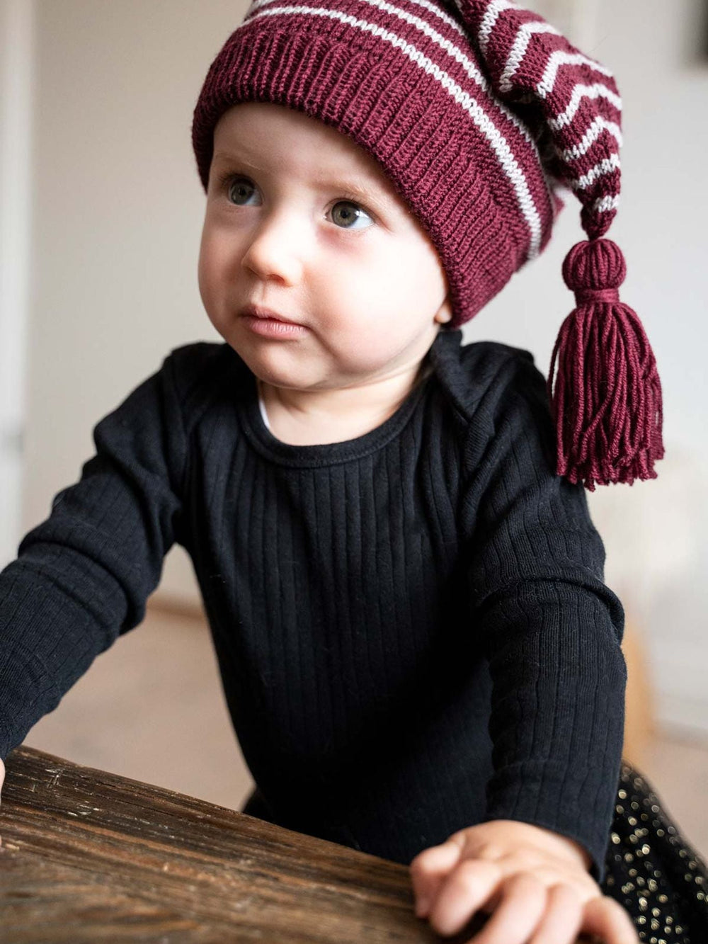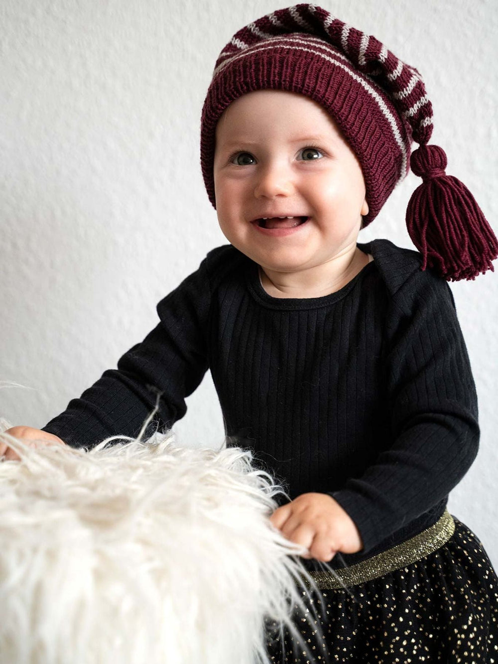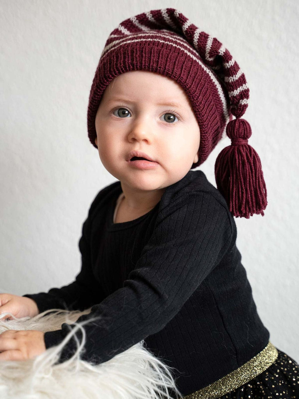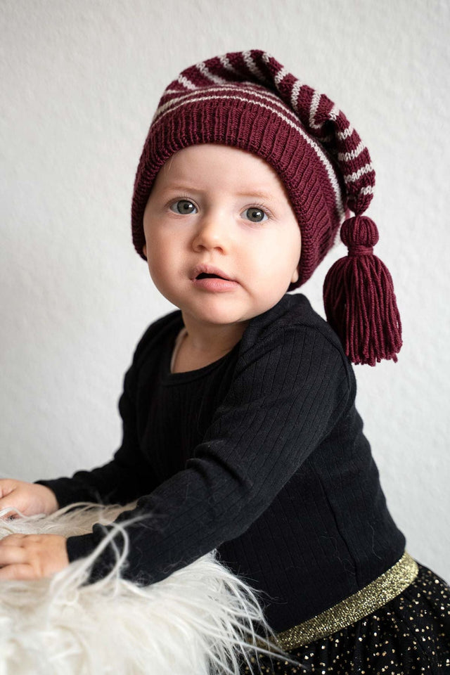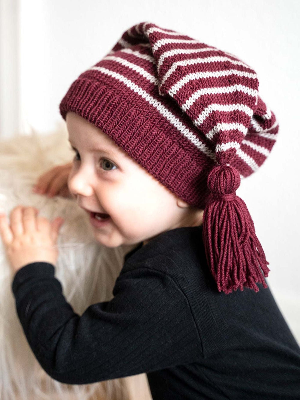 Den fineste nissehue, som kan laves i størrelser lige fra baby til voksen. Nilles nissehue har charmerende striber og afsluttes med en stor, flot kvast eller pompon. Rundt om hovedet strikkes en ombukket ribkant, som får en god tykkelse og sikrer en god pasform, så nissehuen bliver siddende, hvor den skal. Huen strikkes fra ribkanten og ud med spidsen.