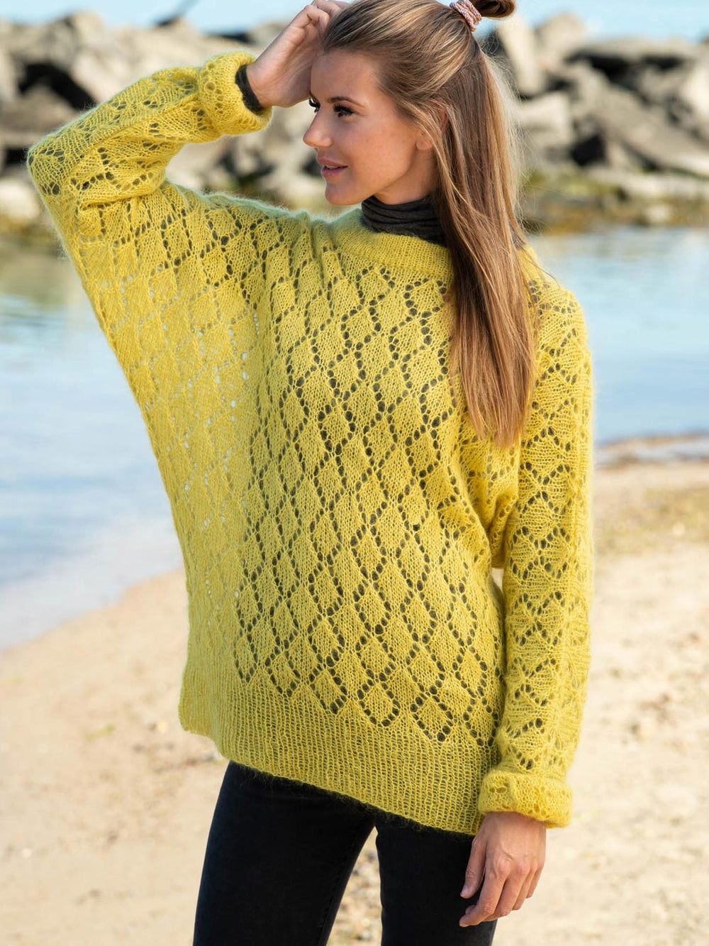 Hulmønster er en skøn strikketeknik, som giver strik et mere let udtryk. I denne opskrift laver hulmønsteret skønne harlekin-tern, som både dækker blusens bul og ærmer. Hulmønsteret gør blusen dejlig luftig, og denne effekt forstærkes af de smarte flagermusærmer.