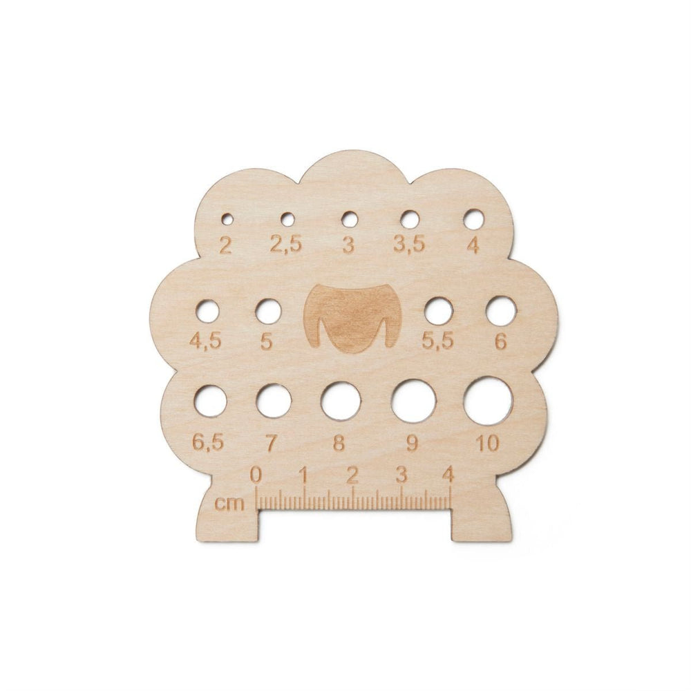 Strikkepindemåler i træ, som er formet som en får. Med denne strikkepindemåler kan du nemt og hurtigt se, hvilken størrelse din strikkepind er. Strikkepindemåleren kan måle størrelsen på strikkepinde fra 2.0 mm og op til 10.0 mm. Hvis du ikke kan få strikkepinden ind i hullet, prøver du et større hul, indtil du kan få den igennem. Du har dermed fundet størrelsen på din strikkepind.
