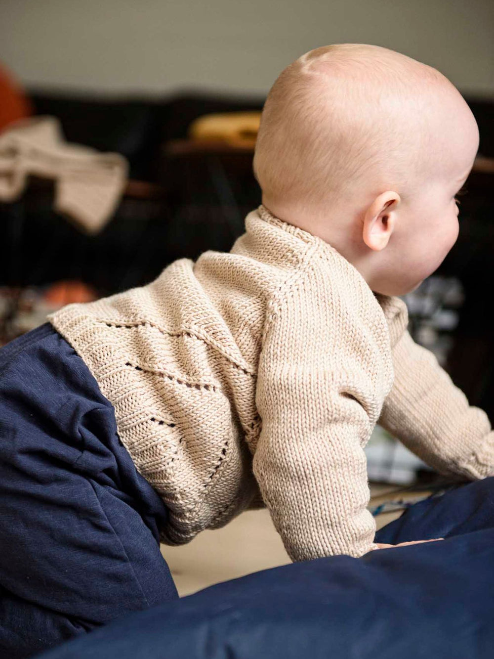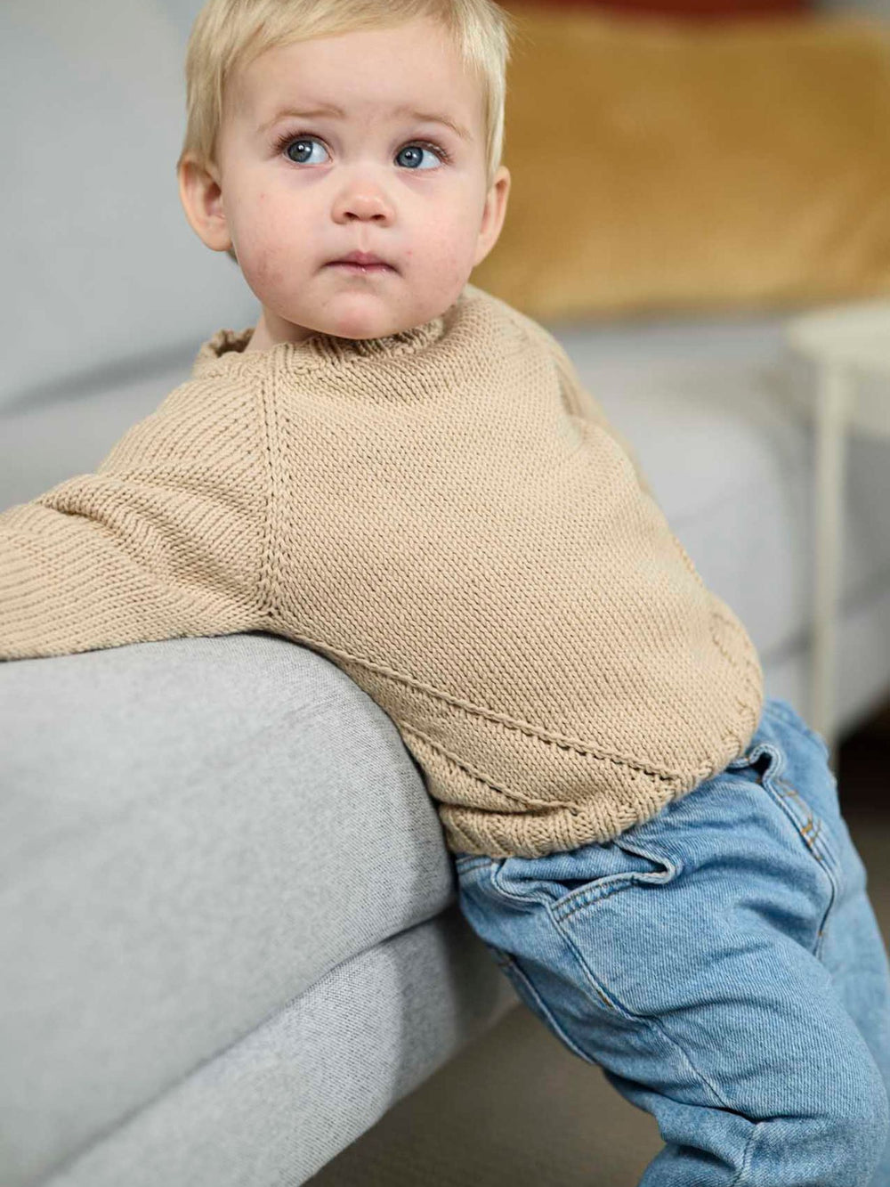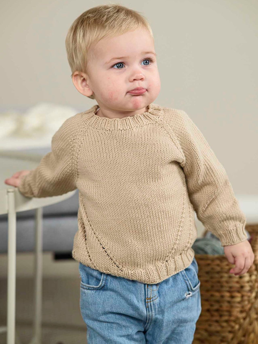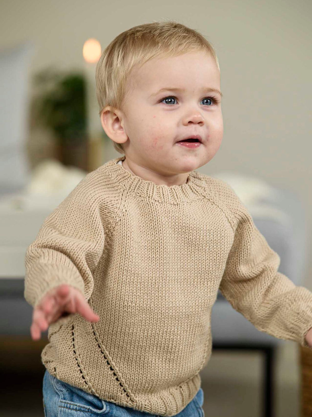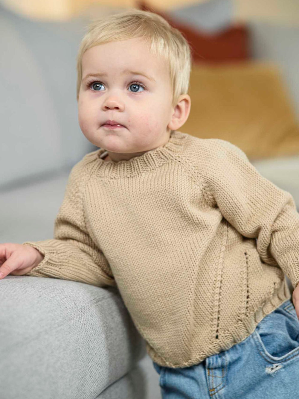 Sød trøje med enkelt hulmønster og raglanudtagninger. Den kan strikkes til børn i alderen fra nyfødt og op til 4 år.