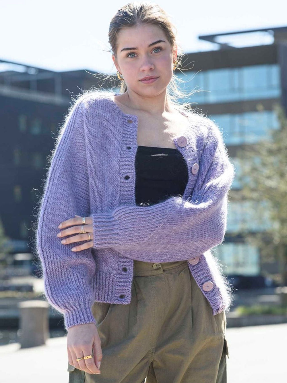 Super Kid Silk giver til det lækre mohair-look. Kombinationen af de to garnfibre giver Rebild Cardigan en fantastisk fylde, blødhed og let tyngde. Trøjen føles enormt behagelig at have på og kan både bruges på en kold vinterdag eller som alternativ til en overgangsjakke. Download den gratis opskrift nedenfor. God fornøjelse!
