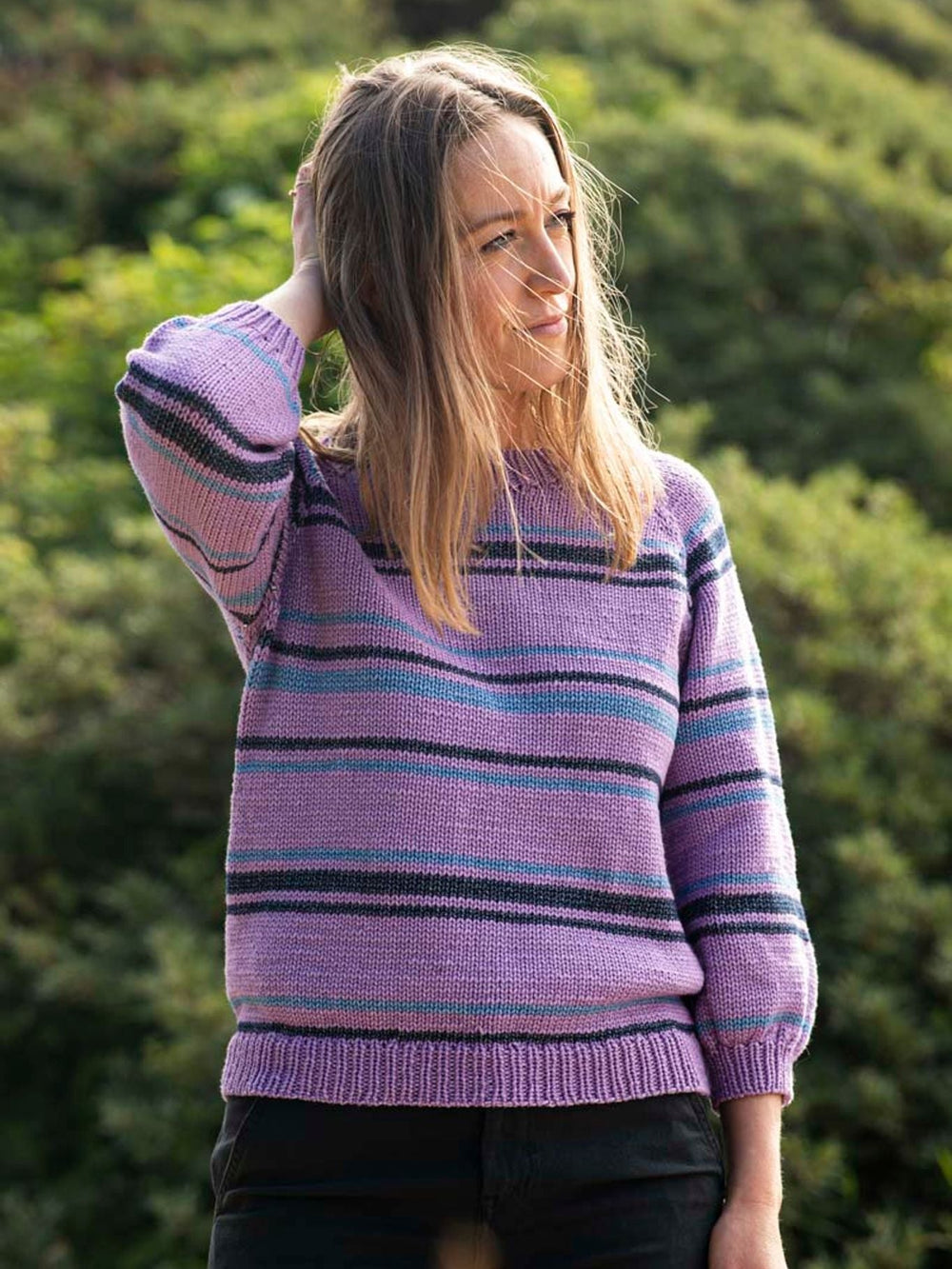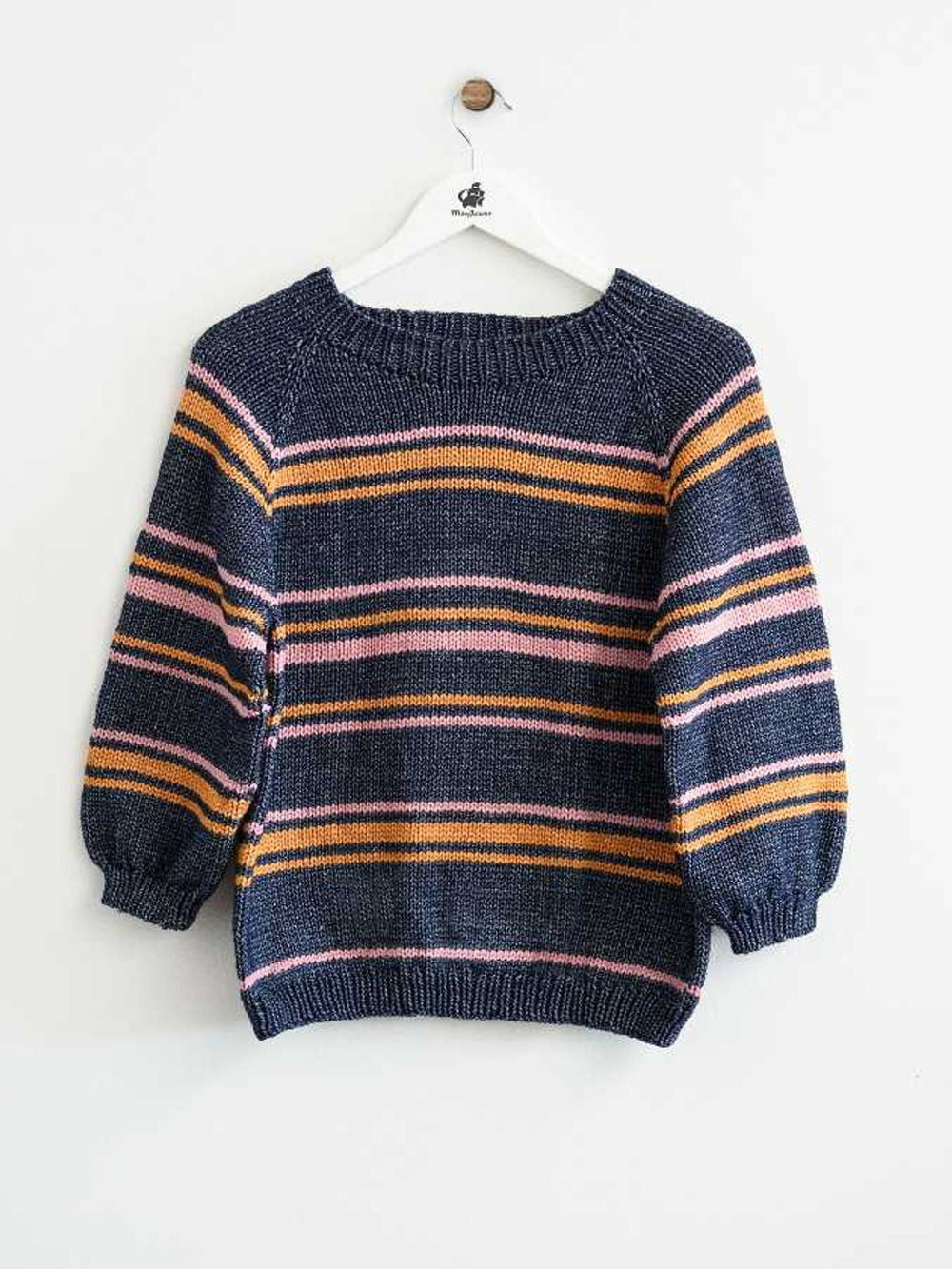 Blusen skal strikkes top-down i glatstrik med raglanudtagninger. Den har let vidde i trekvartærmerne og er en rigtig skøn trøje, som vil passe til de fleste lejligheder. Kunne du tænke dig en vest i samme garn og med samme stribede mønster, så prøv at se vores Tulia vest.