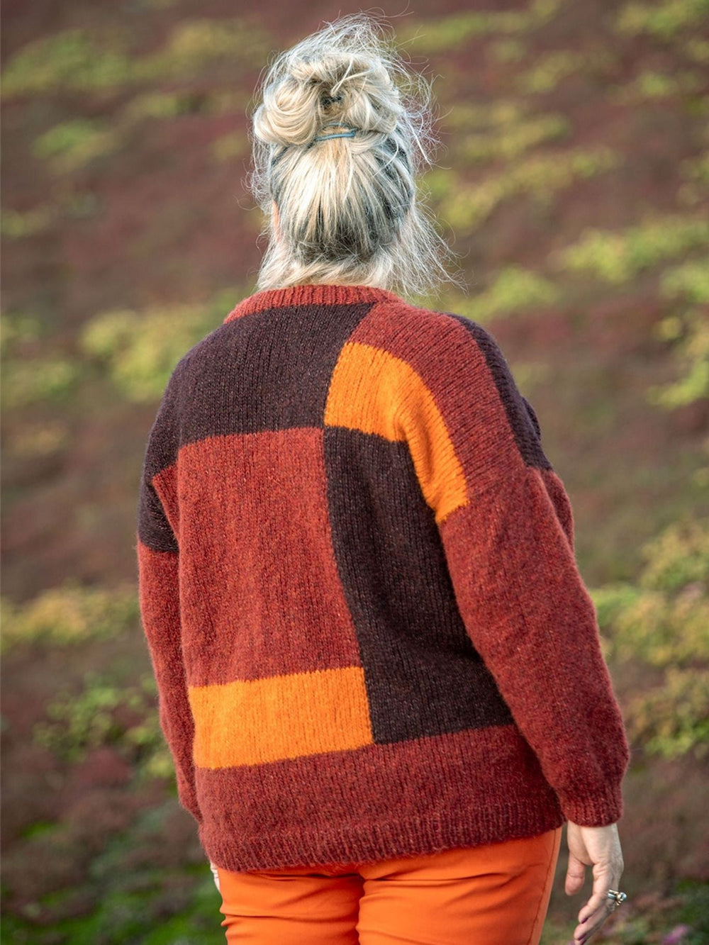 Ruby sweater har et unikt, firkantet mønster, som strikkes med intarsia teknikken, og mønsteret går igen på både for- og bagside.