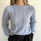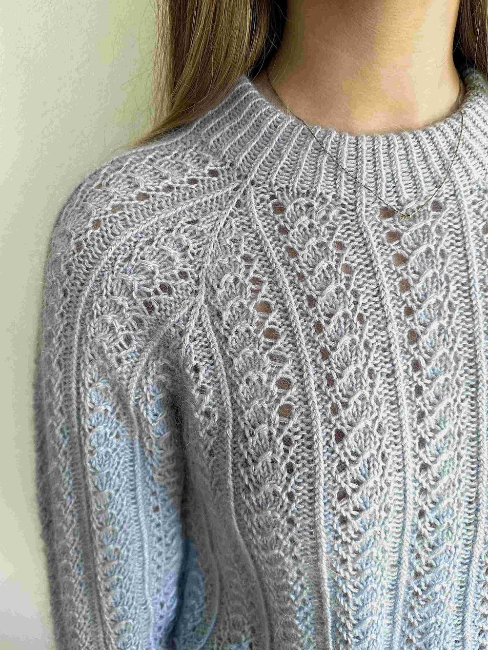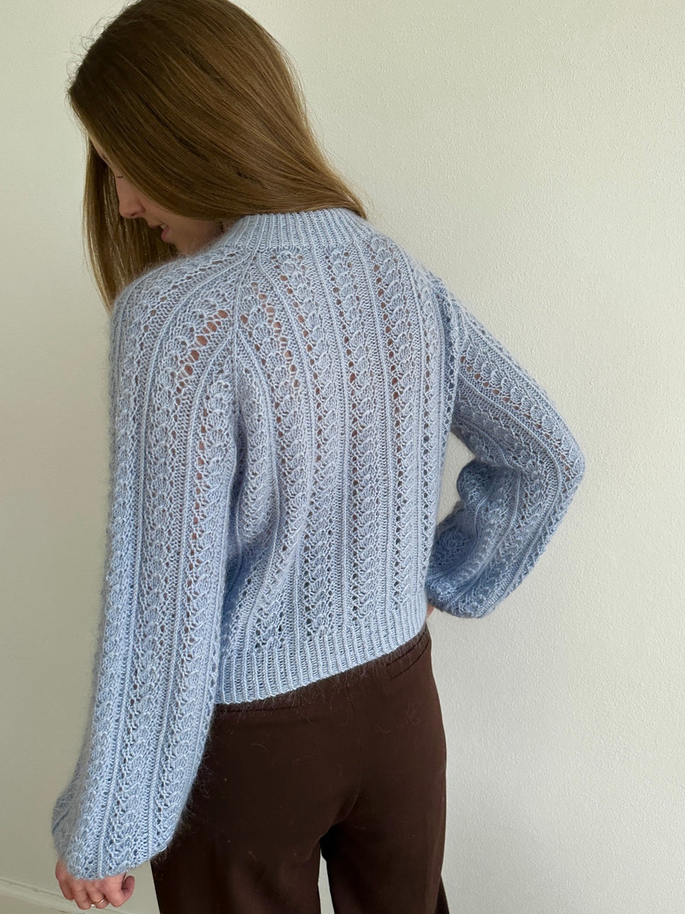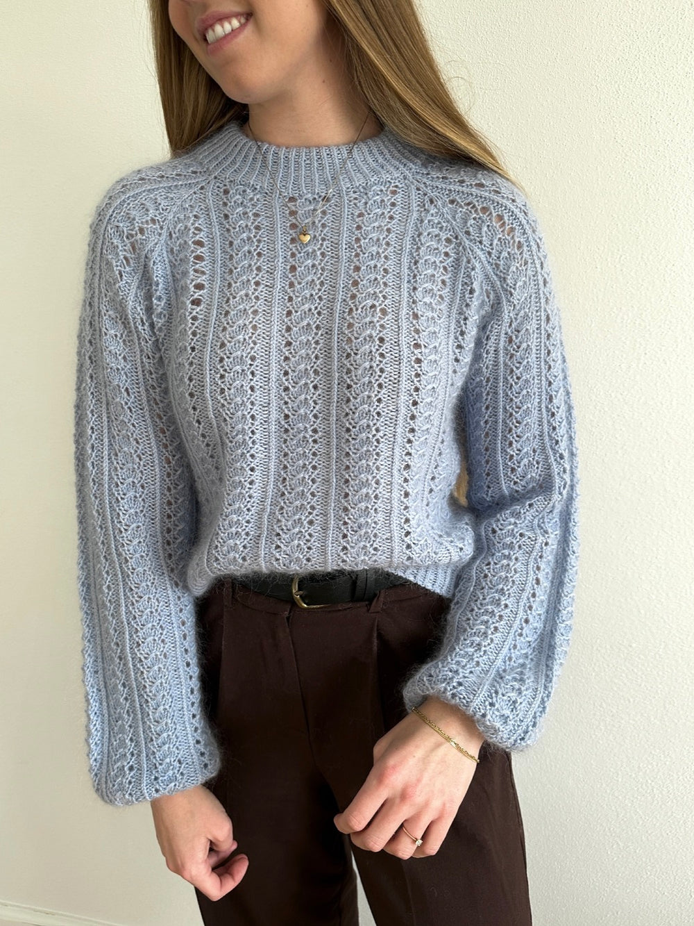 Sweateren strikkes oppefra og ned. Først slås masker op til halskanten, der strikkes i drejet rib og foldes til en dobbelt halskant. Dernæst strikkes vendepinde for at give form til halsudskæringen. Bærestykket strikkes med raglanudtagninger omkring 8 maskemarkører. Når bærestykket er færdigstrikket, sættes masker af til ærmer. Kroppen strikkes rundt på pinden og afsluttes med en drejet ribkant, der lukkes af med italiensk aflukning. Ærmemaskerne sættes så tilbage på pinden, og strikkes lige ned i muslingemønsteret, indtil der kort før ribkanten laves indtagninger, for at skabe ballon-effekten. Ærmerne afsluttes med drejede ribkanter og italienske aflukninger.