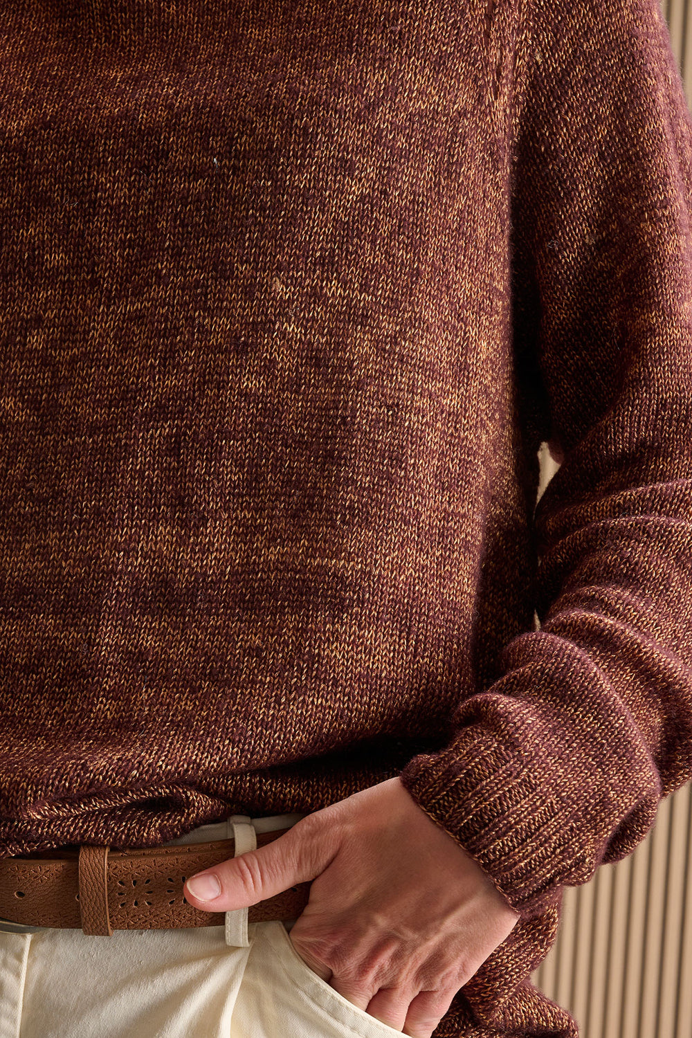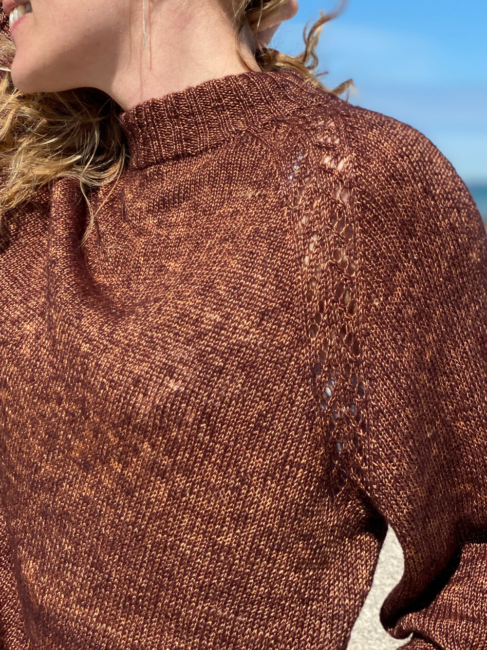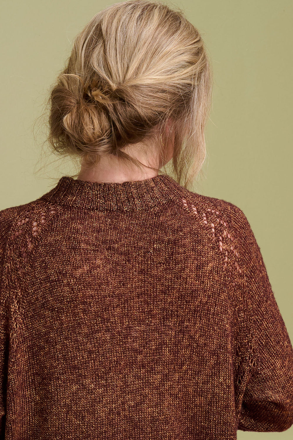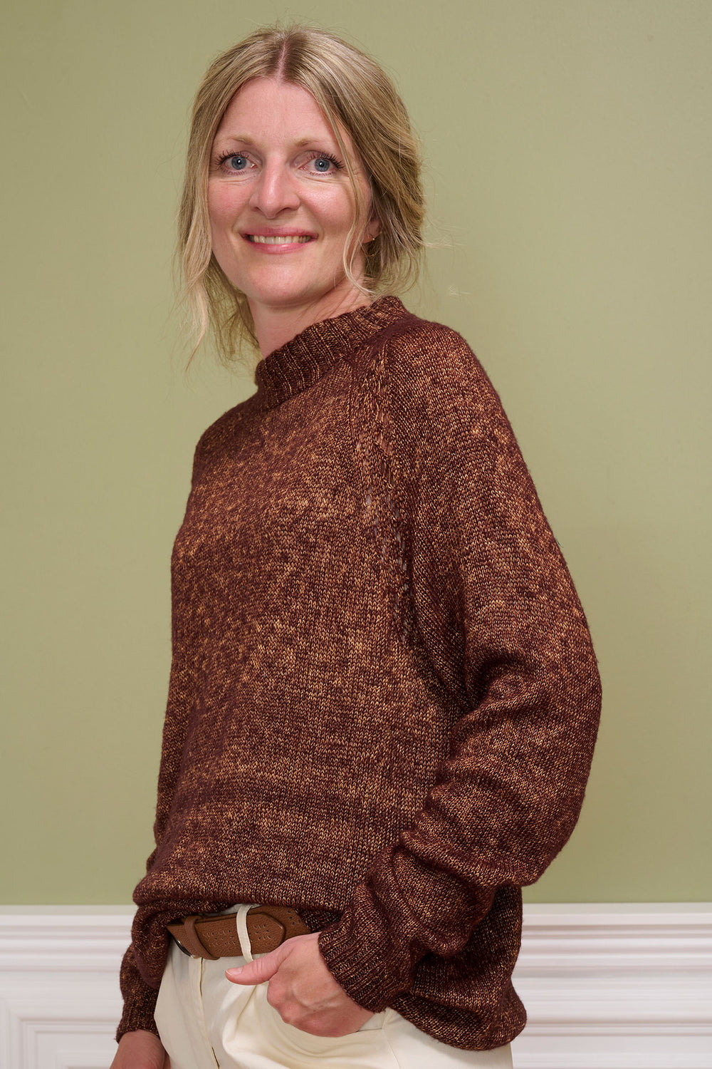 Sweateren strikkes nedefra og op på rundpind, hvorefter arb deles til ryg og forstykke i ærmegabene. Ærmerne strikkes hver for sig nedefra og op.