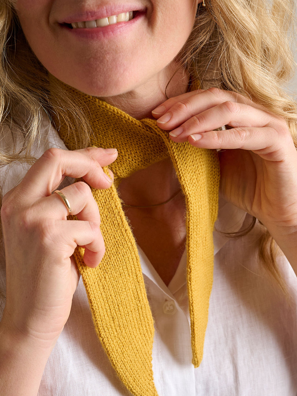 Det helt enkle tørklæde, Spencer Scarfet, får en spids afslutning, da det afsluttes med løbende indtagninger. Tørklædet kan strikkes i en smal variant (5 x 86 cm) og en bred variant (10 x 136 cm) alt efter ønske.